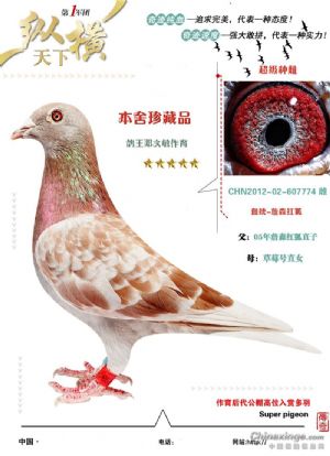 介绍:双雨绝配种雄CHN2012-06-256896为100%瓦特·德雷克超级种鸽,子代孙代重孙代,代代