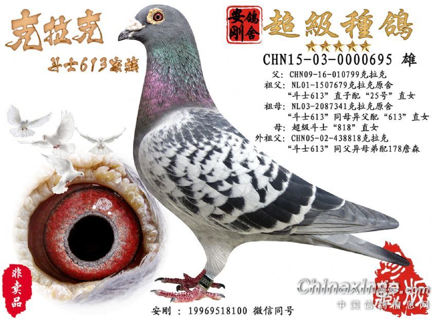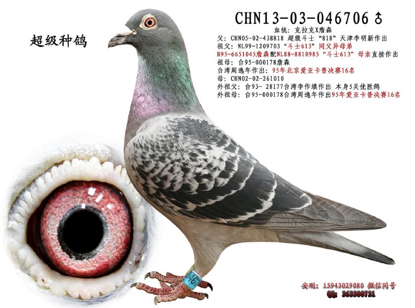 父 NL99—1209703灰“斗士703”“斗士613”同父异母弟 祖父 B95—6651045斑 詹森原舍作出 子代8羽获冠军孙代2羽获鸽王冠军6羽获单关冠军 祖母 NL88—8810985 灰 大铭鸽“灰85” “斗士613”之母 本身4940羽冠军 母:CHN99-02-038851“漂亮主持”