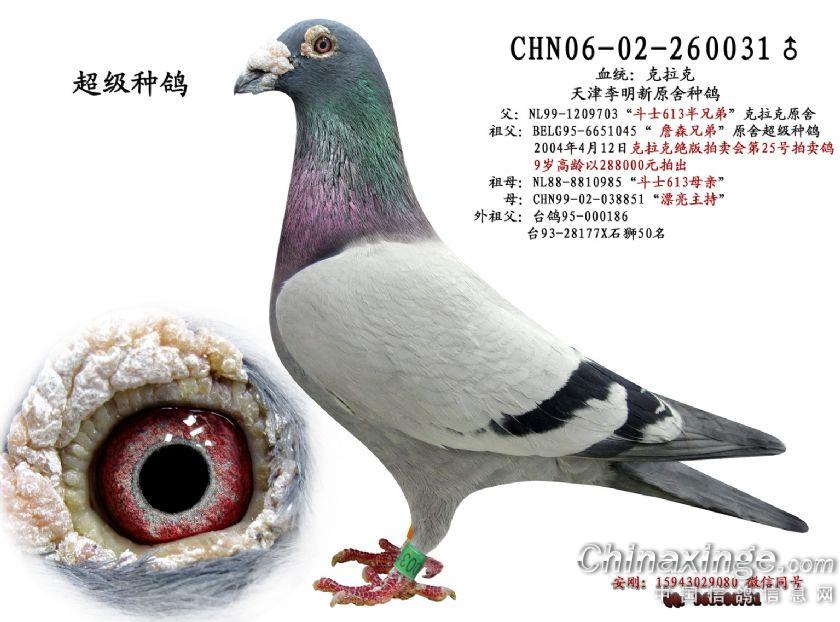 感谢唐山高尔夫鸽业肖建来友情支持 父:CHN05-02-438818 斗士“818”天津李明新作出 祖父:NL99-1209703“斗士613”同父异母弟 B95-6651045詹森配NL88-8810985“斗士613”母亲作出 祖母:台95-000178詹森 95年爱亚卡普16名 母:CHN02-02-261010 外祖父:台93- 28177 外祖母:台95-000178 95年爱亚卡普16名