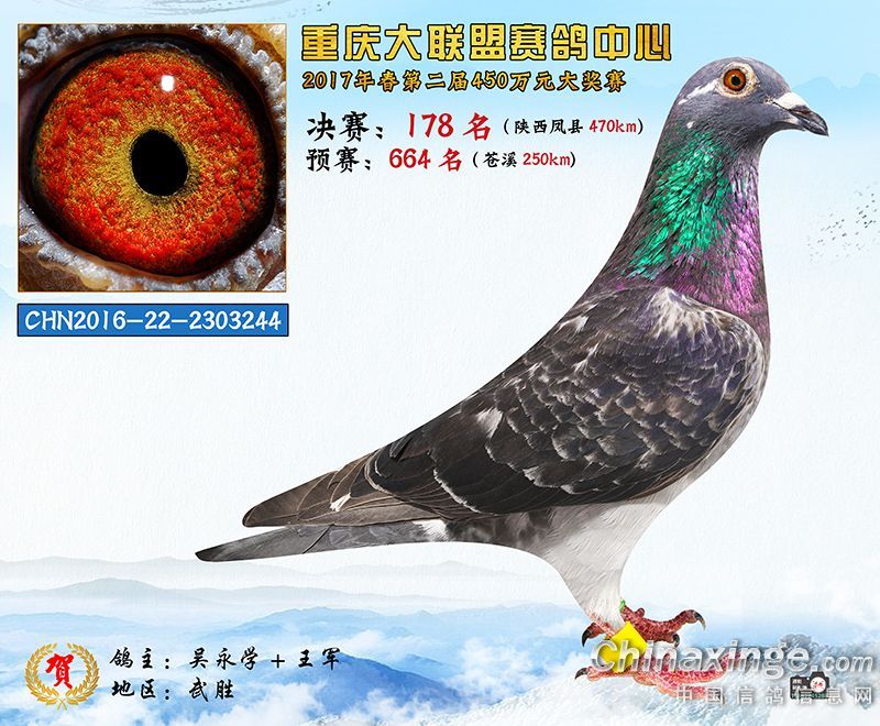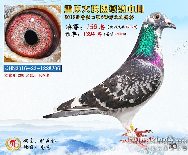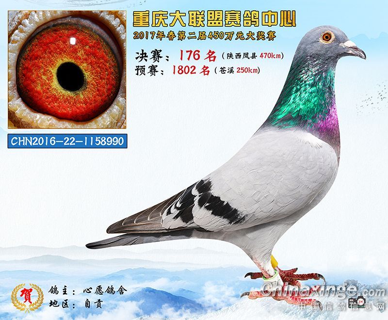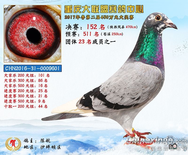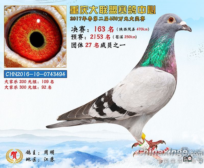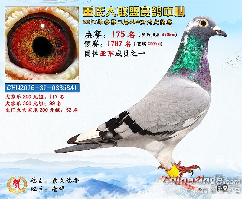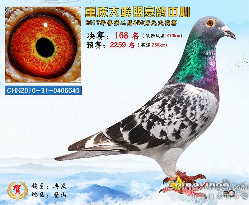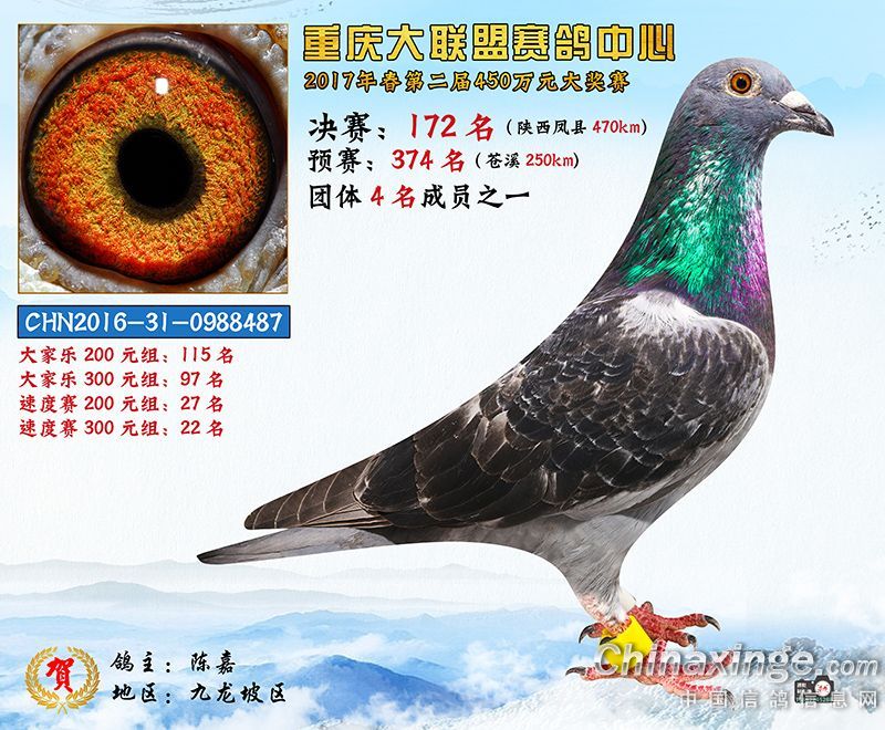 作品说明: 重庆大联盟赛鸽中心(春棚)2017年第二届获奖鸽151-180名鉴赏