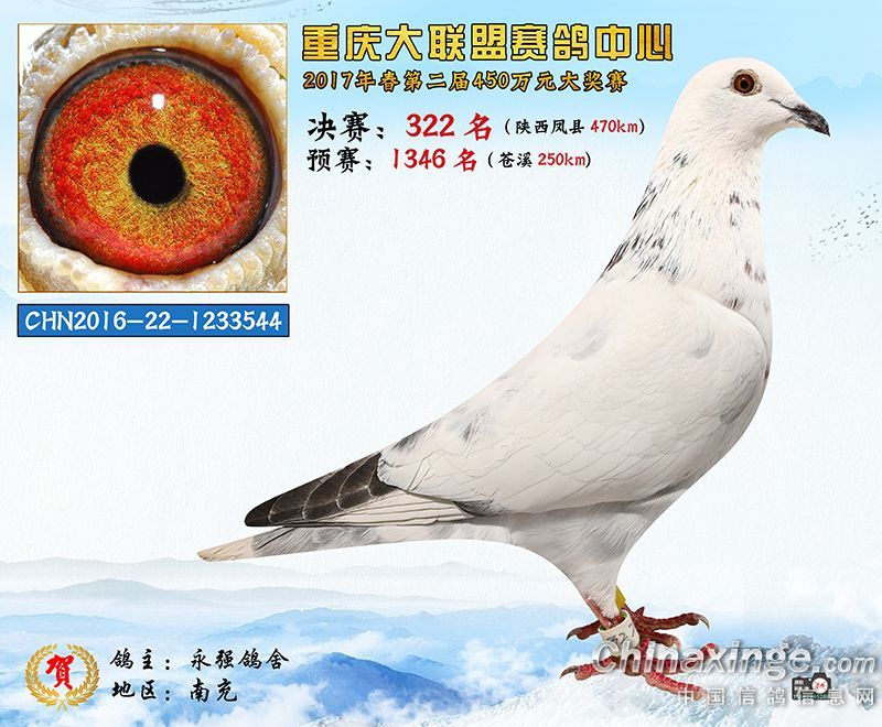 作品说明: 重庆大联盟赛鸽中心(春棚)2017年第二届获奖鸽301-330名鉴赏