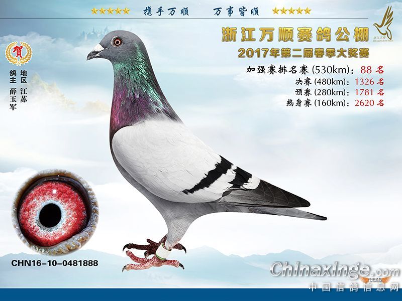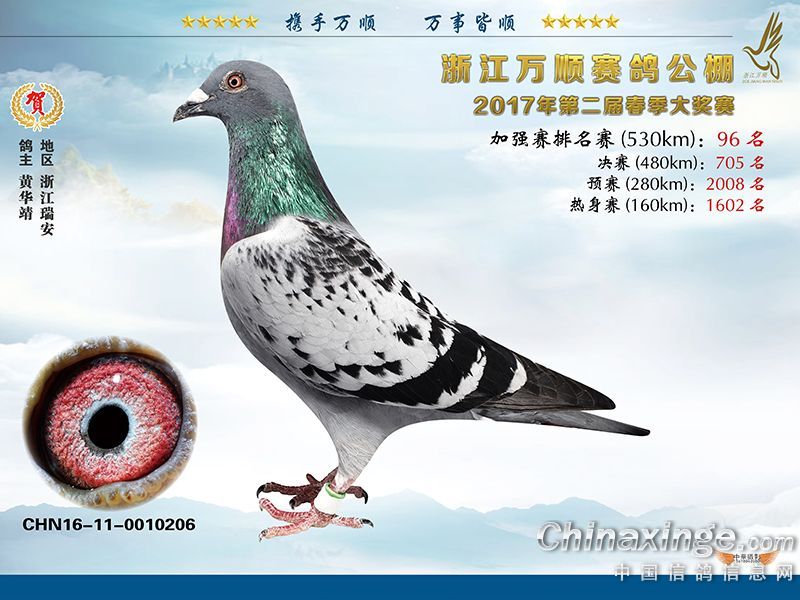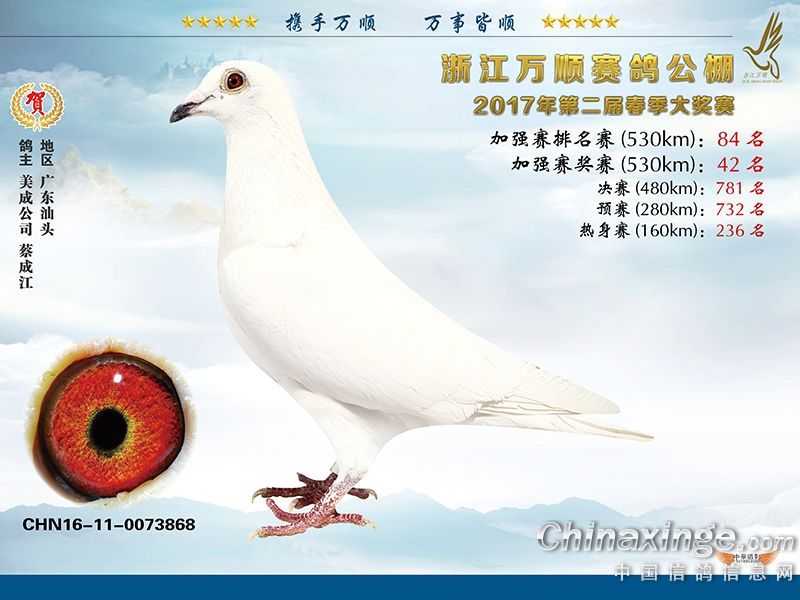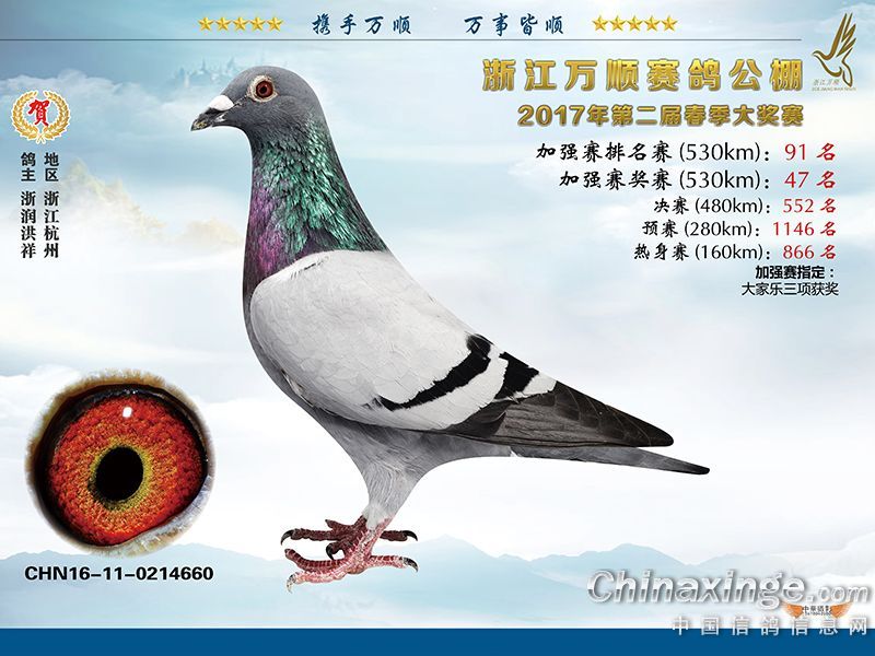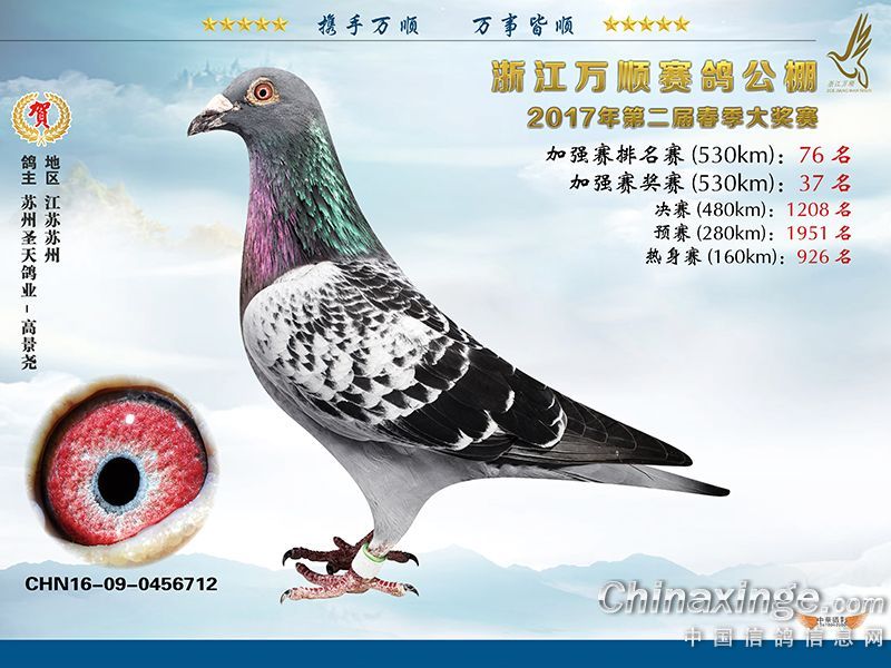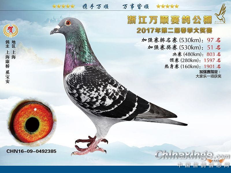 作品说明: 浙江万顺赛鸽公棚2017年获奖鸽照片 加强赛75-100名