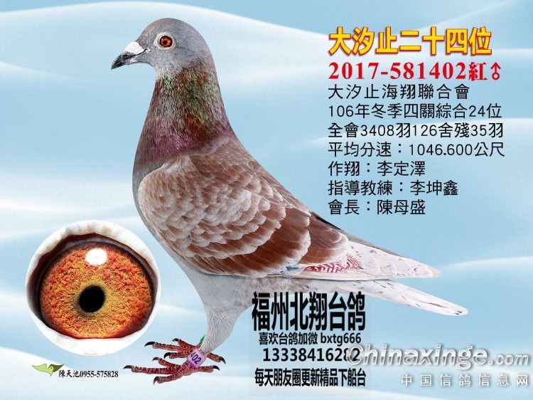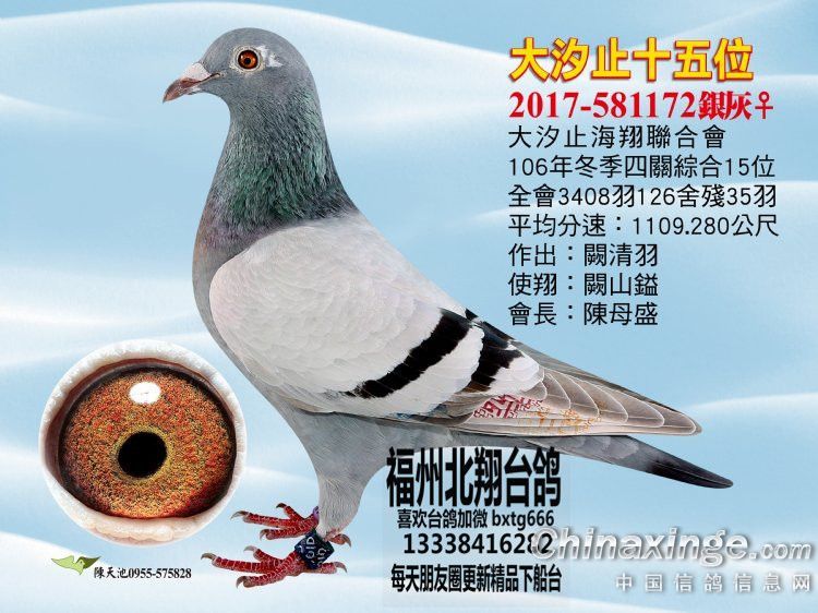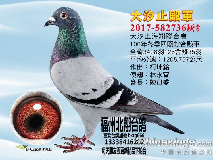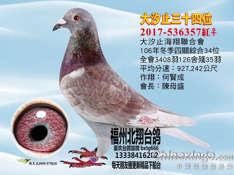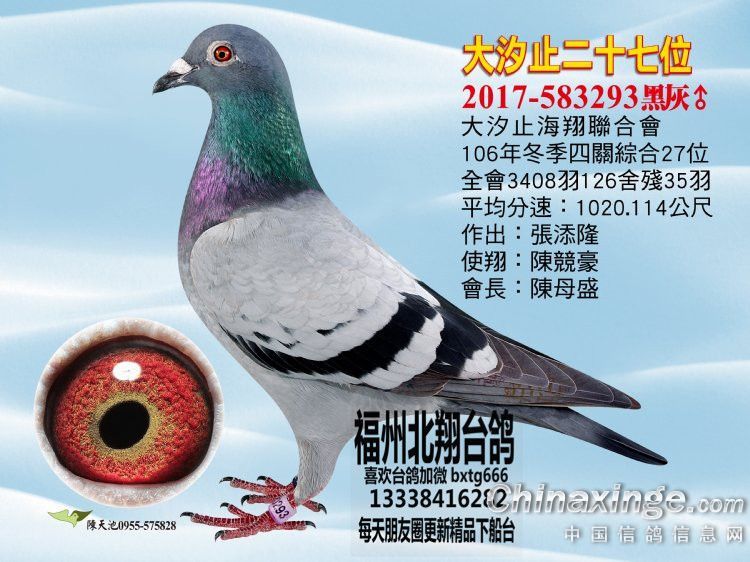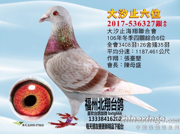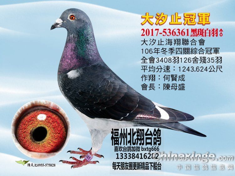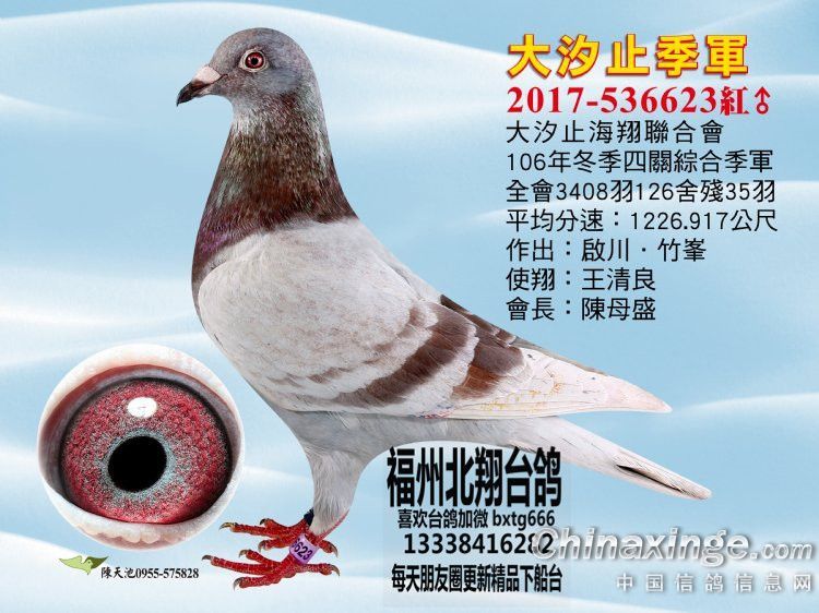 作品说明: 台鸽-大汐止海翔聯合會-四关综合冠军 2017年冬季北海大汐止海翔聯合會四关入赏鸽 2017 年- 冬季-四關-3408羽-126舍-歸返35羽 2017年黑皮白条台鸽冬季入赏鸽 2017年黑斑白羽台 鸽冬季入赏鸽 2017年红轮台鸽冬季入赏鸽 2017年红雨点台鸽冬季入赏鸽 2017年花头灰三线 灰入赏鸽 2017年詹森红狐红轮台鸽冬季入赏鸽 2017年银灰台鸽冬季入赏鸽 2017年红斑台鸽 冬季入赏鸽 2017年花头黑皮白条台鸽冬季入赏鸽 2017年西翁红绛台鸽冬季入赏鸽