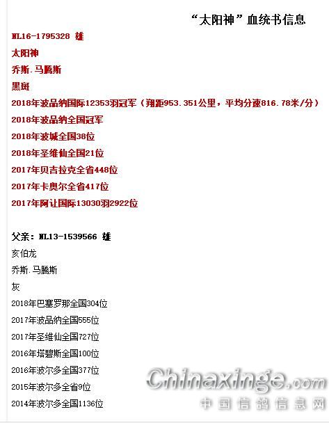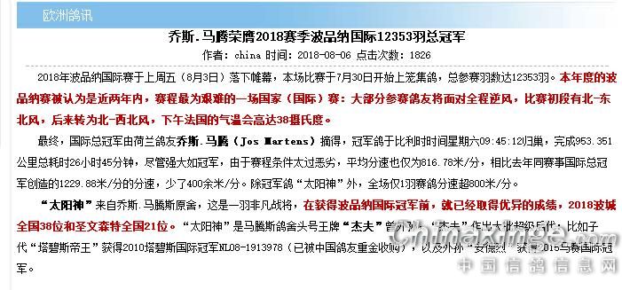 “太阳神”——2018年波品纳国际12353羽总冠军