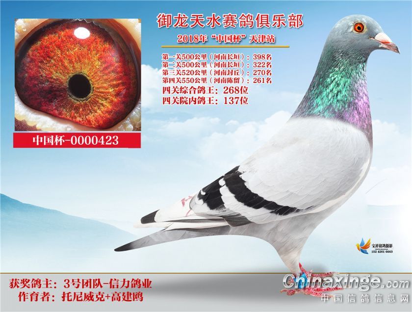 作品说明: 2018“中国杯”天水九大联盟国际赛鸽俱乐部四关鸽王大奖赛已圆满落下帷幕,在此 天水赛 鸽俱乐部向广大鸽友致以诚挚的问候,感谢参赛鸽友对俱乐部支持与信赖,祝愿鸽 友们在来 年的赛事中再续辉煌勇夺第一! 2018“中国杯”天水九大联盟国际赛鸽俱乐部颁奖暨拍卖大 会定于11月25日(周 日),在御龙天水生态园(暨天水赛鸽俱乐部宴会大厅)举行。届时诚 邀广大鸽友莅临出 席。 颁奖暨拍卖盛典流程: 11月25日 08:00-10:00 获奖鸽展示、颁奖 盛典 10:00-11:30 获奖鸽拍卖 11:30-12:30 午宴 12:30 获奖鸽拍卖 温馨提示: 1、我们 已经为鸽友安排好食宿事宜,请鸽友提前联系进行预约,以便安排 您的食宿。 2、办公室电 话:022-25644488 18502236184
