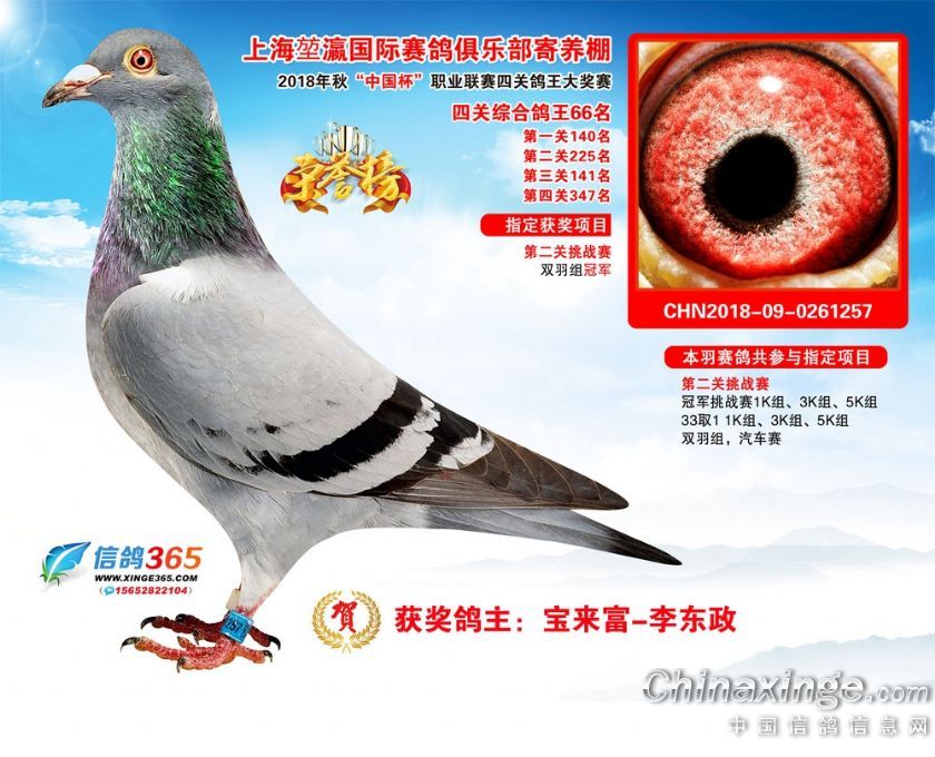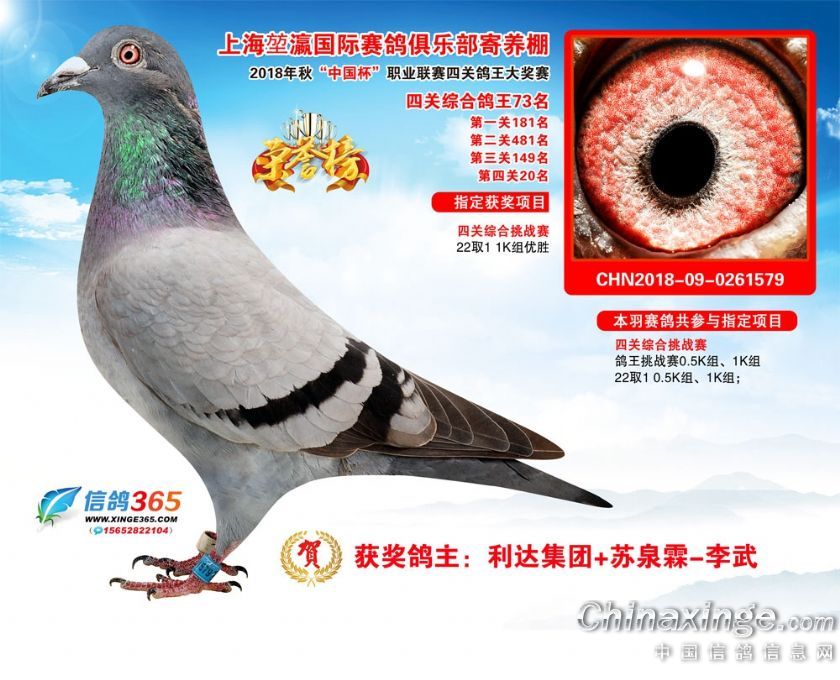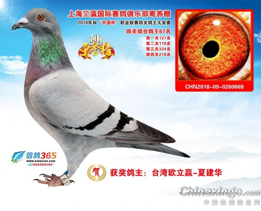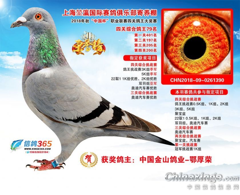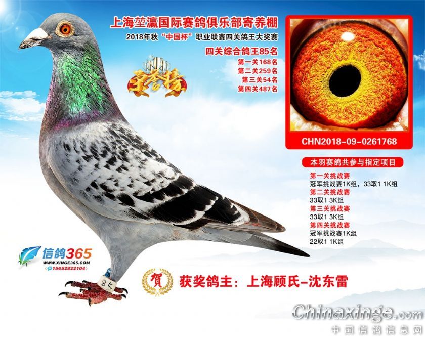 作品说明: 2018年秋“中国杯”职业联赛(上海堃瀛站)第二届四关鸽王获奖鸽61-90名