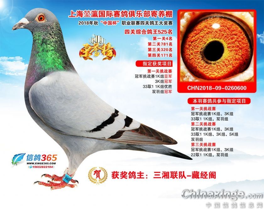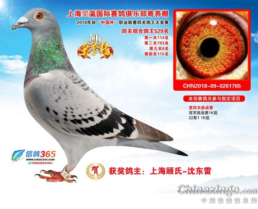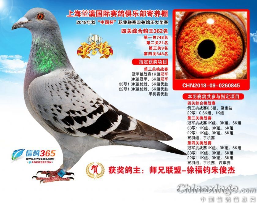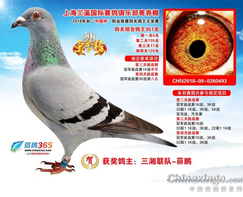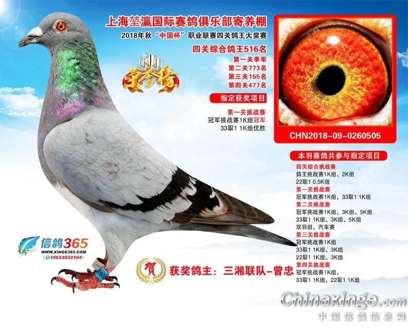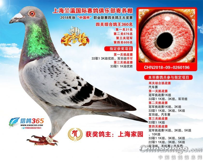 作品说明: 2018年秋“中国杯”职业联赛(上海堃瀛站)第二届单关获奖鸽