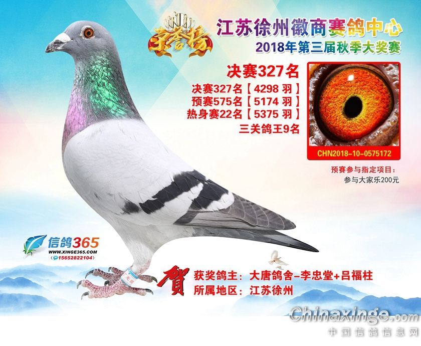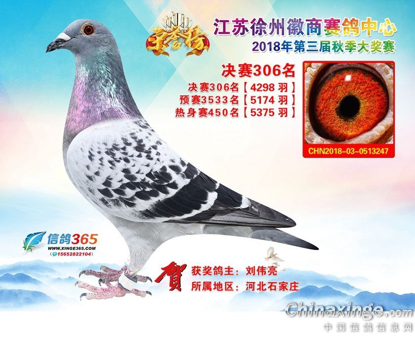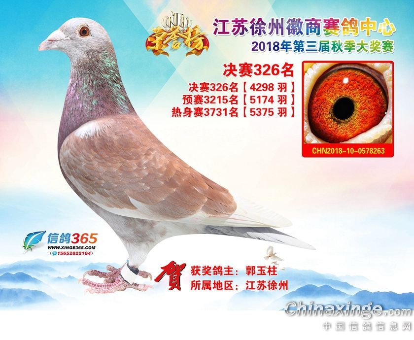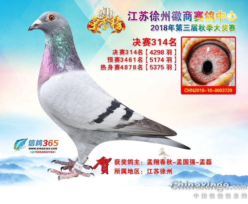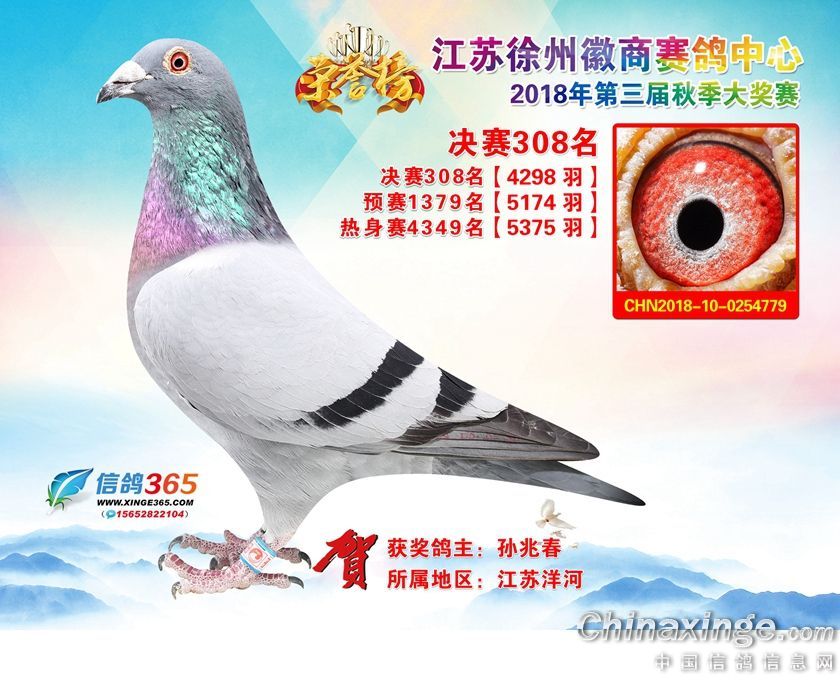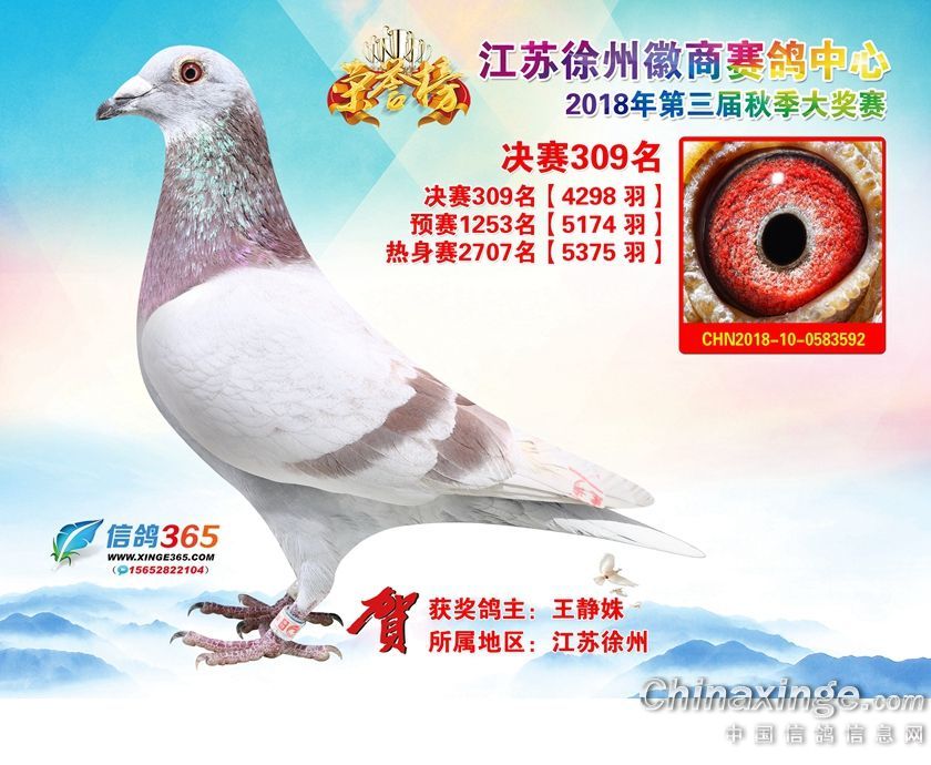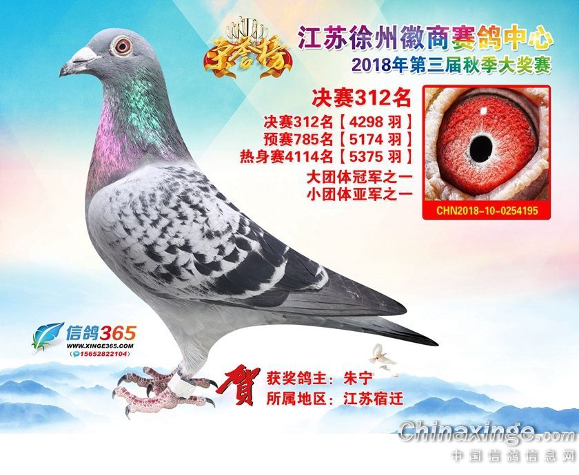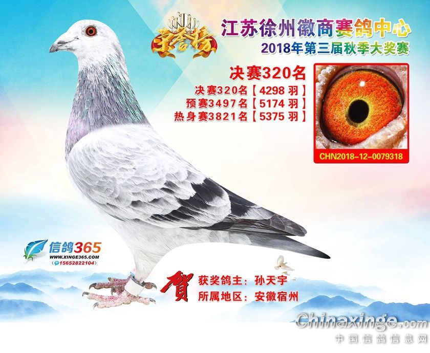 作品说明: 江苏徐州徽商赛鸽中心2018年获奖鸽301-330名