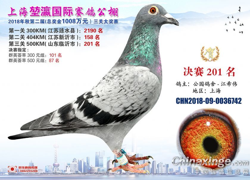 作品说明: 2018年上海堃瀛国际赛鸽俱乐部公棚获奖鸽照片181-210名