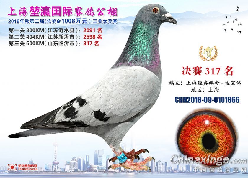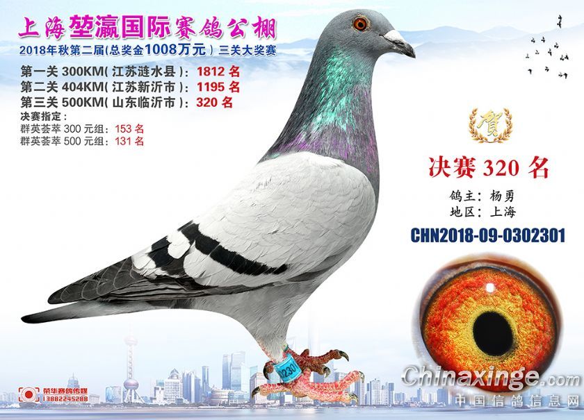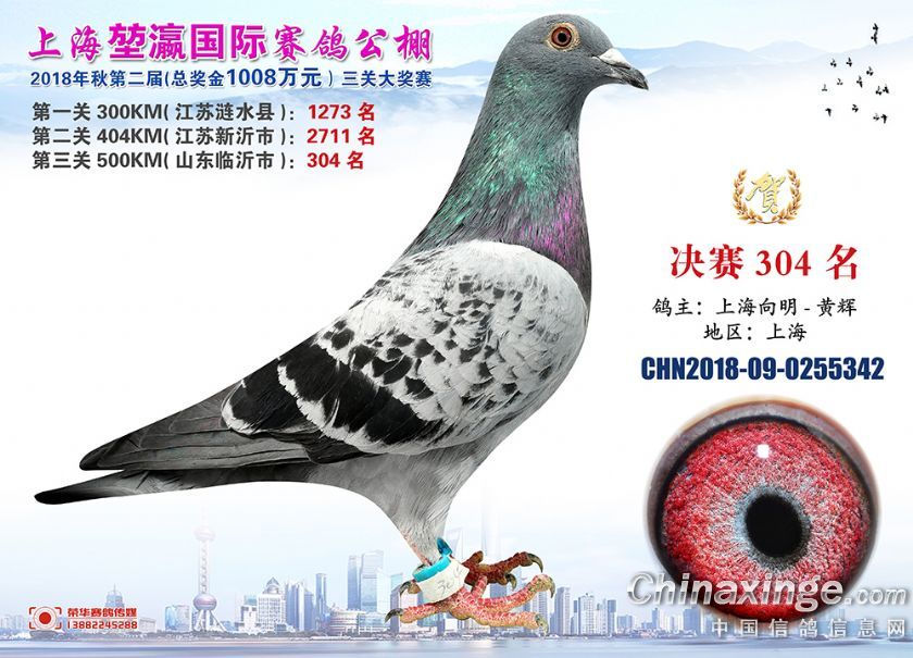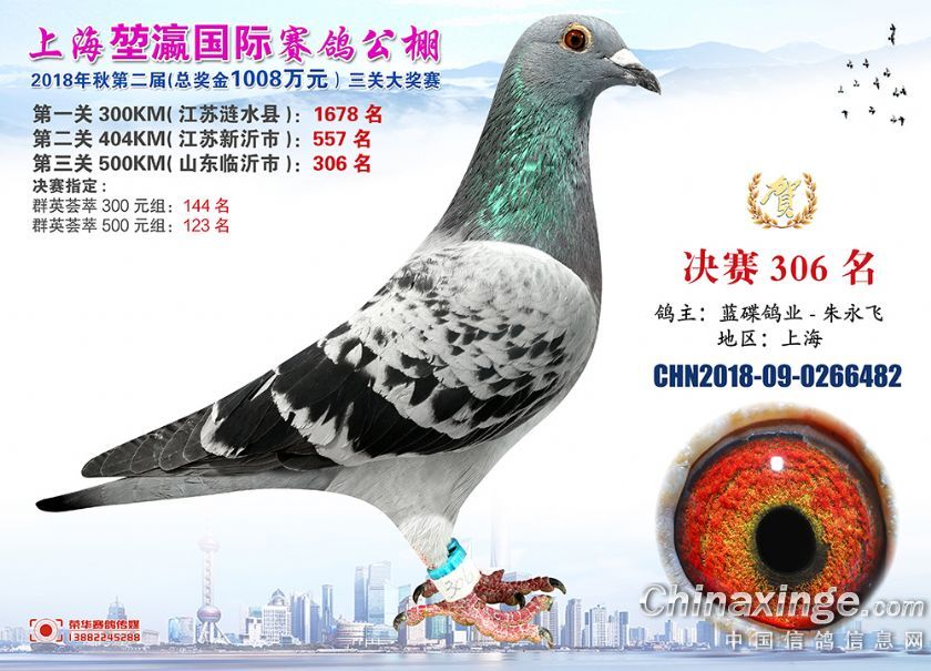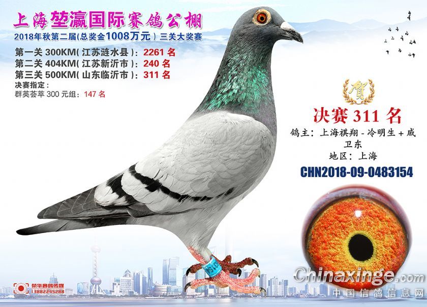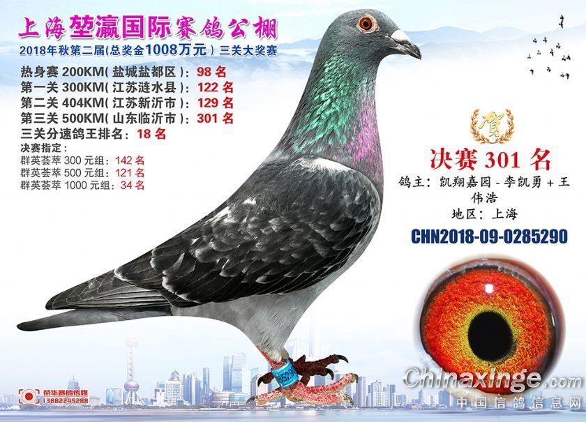作品说明: 2018年上海堃瀛国际赛鸽俱乐部公棚获奖鸽照片301-300名