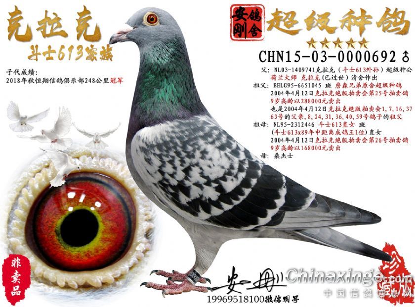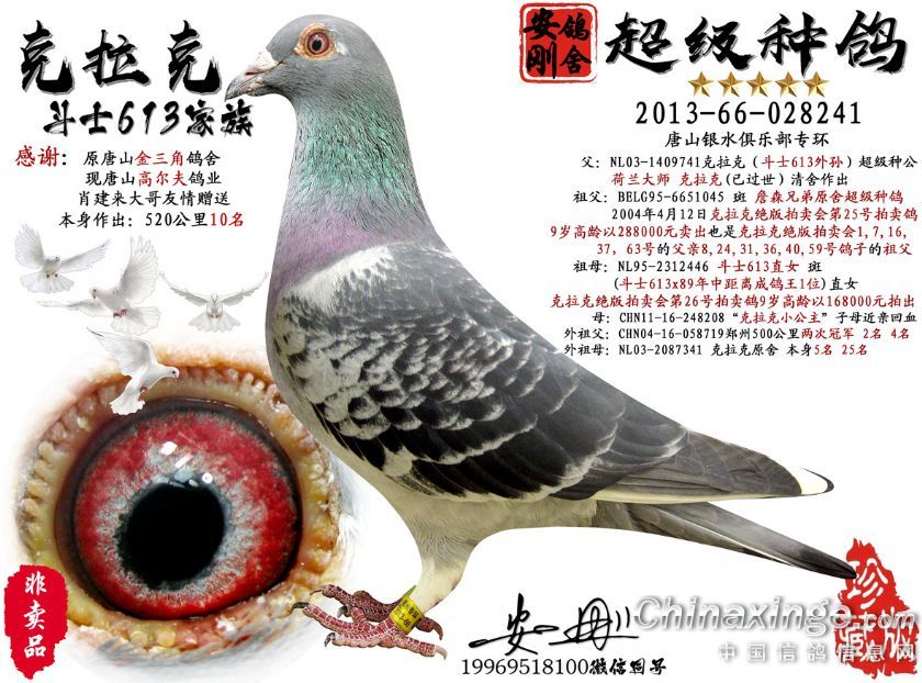 父:NL03-1409741:克拉克741 超级种公 祖父"雨045詹森": B95-6651045 : 斑 詹森兄弟原舍作出超級種鴿(2004年4月12日克拉克绝版拍卖会第25号拍卖鸽,9岁高龄以288000元卖出.也是2004年4月12日克拉克绝版拍卖会1,7,16,37,63号的父亲年青麥克斯家族 祖母: NL95-2312446 鬥士613直女 (2004年4月12日克拉克绝版拍卖会第26号拍卖鸽,9岁高龄以168000元卖出.)