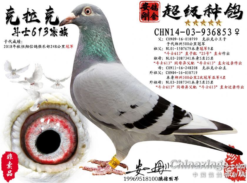 父:CHN2009—16—010799♂克拉克小王子 子代郑州500公里冠军 祖父 NL2001—1507679克拉克原棚本身冠军 9名祖母 NL2003—2087341克拉克原棚本身5名 25名 母:CHN2011—16—248208♀克拉克小公主外祖父 : CHN2004—16—058719灰白 砂郑州500公里两次冠军外祖母 NL2003—2087341克拉克原棚本身5名 25名