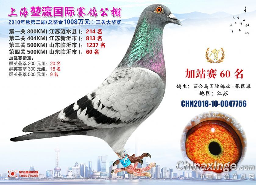 作品说明: 2018年上海堃瀛国际赛鸽俱乐部公棚加站赛获奖鸽照片43-60名