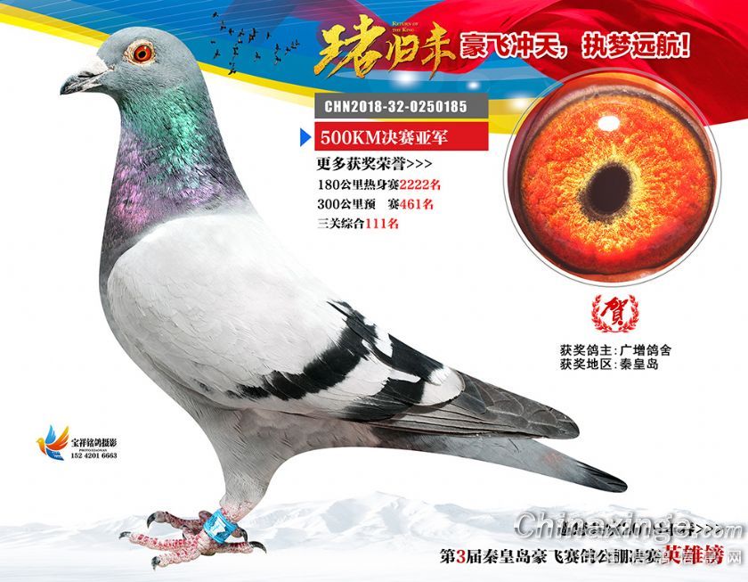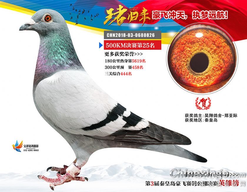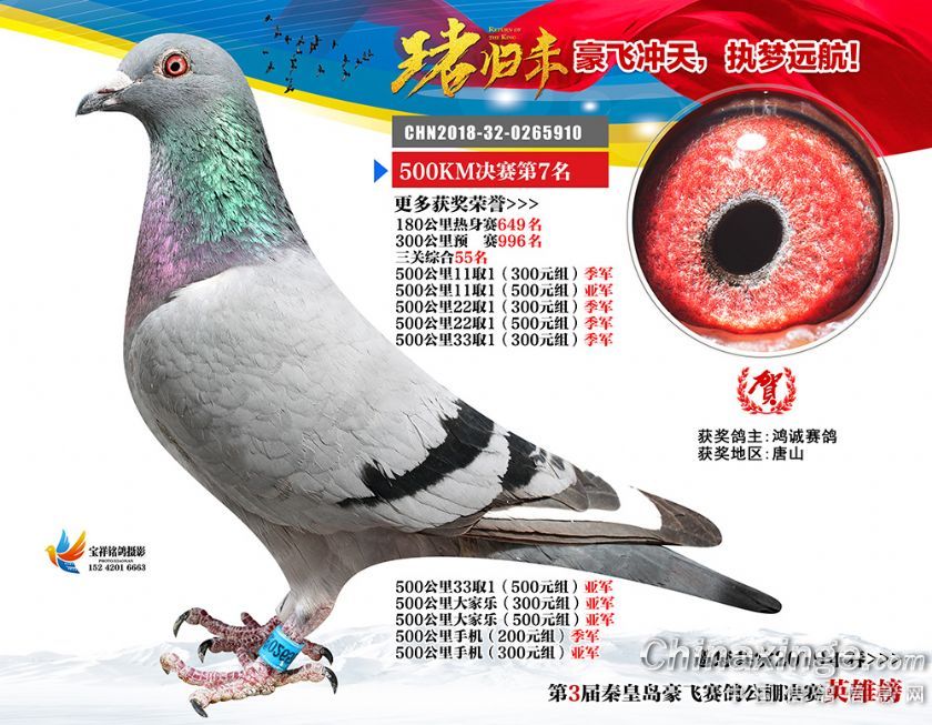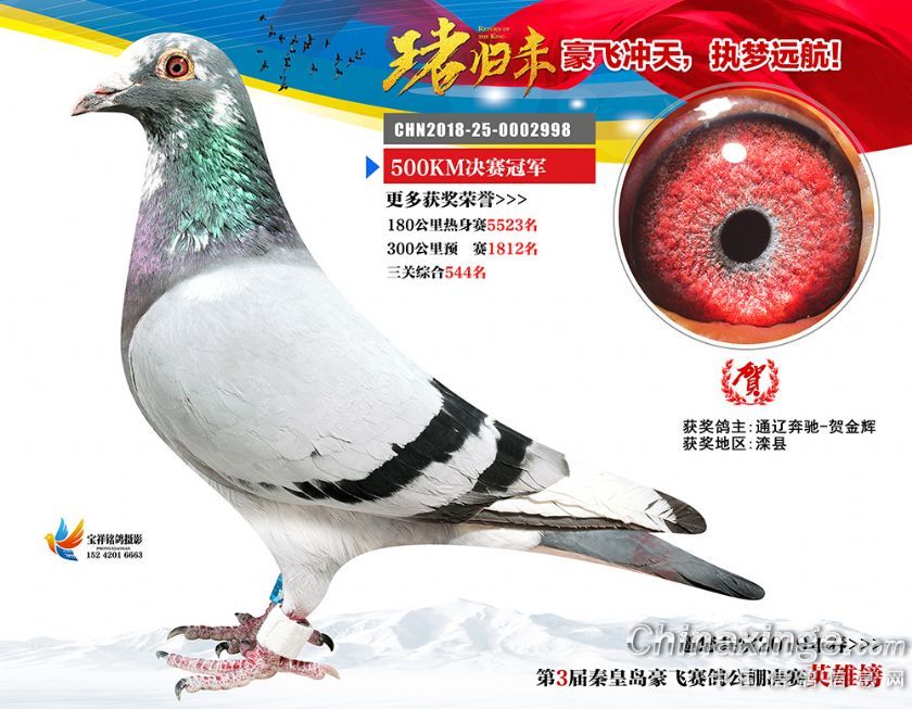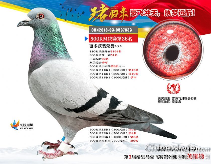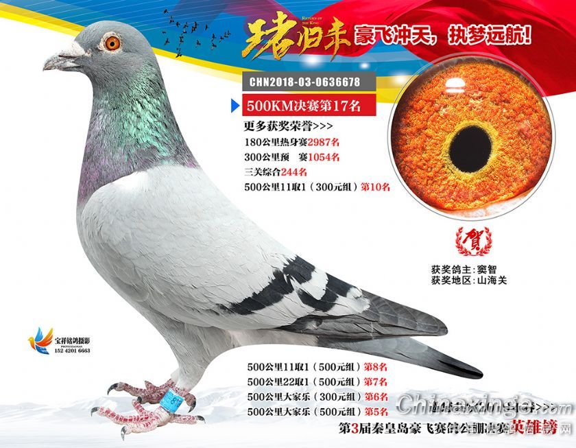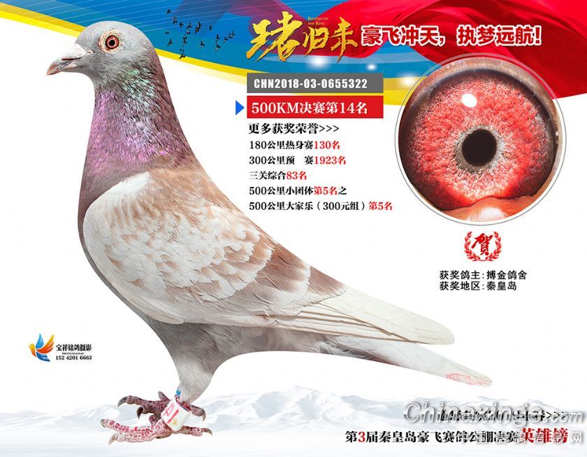 作品说明: 作品说明: 第三届竞翔大奖赛拍卖会暨颁奖晚宴 豪飞公棚拍卖会定于5月2日-5月3日, 在骏怡连锁酒店举行。我棚特聘请中国金牌拍卖 师吴昊先生主锤,让您的爱鸽物有所 值。届时诚邀广大鸽友莅临出席。活动安排:拍 卖时间:2019年5月2日14:00——5月3 日 拍卖地点:骏怡连锁酒店(秦皇岛昌黎泥井镇店) 拍卖方式:现场竞拍 联 系 人: 黄永斌 康晓龙 联系电话:13933692377 13582802122 拍卖顺序: 5月2日14:00准时开 拍,决赛600-401名,加强赛获奖鸽及排名成绩鸽。2日晚19:00颁 奖及答谢酒会。 5月3 日上午8:00准时开拍剩余名次鸽(400-冠军)