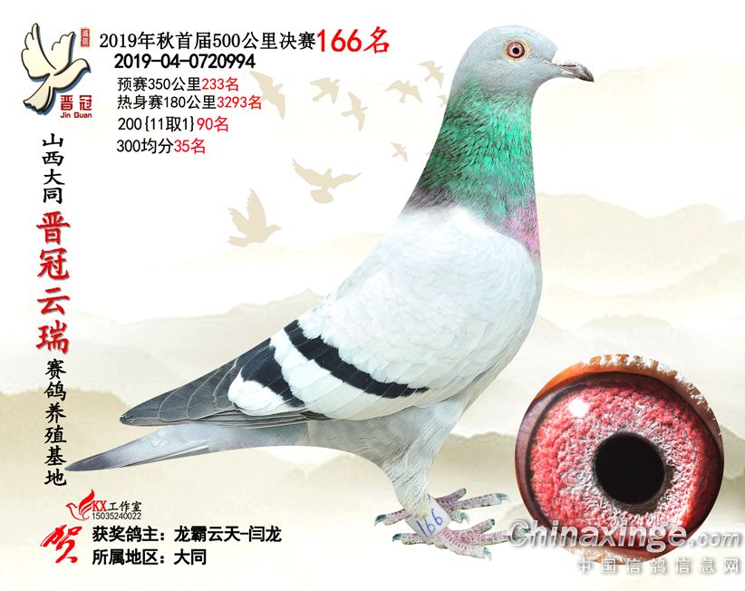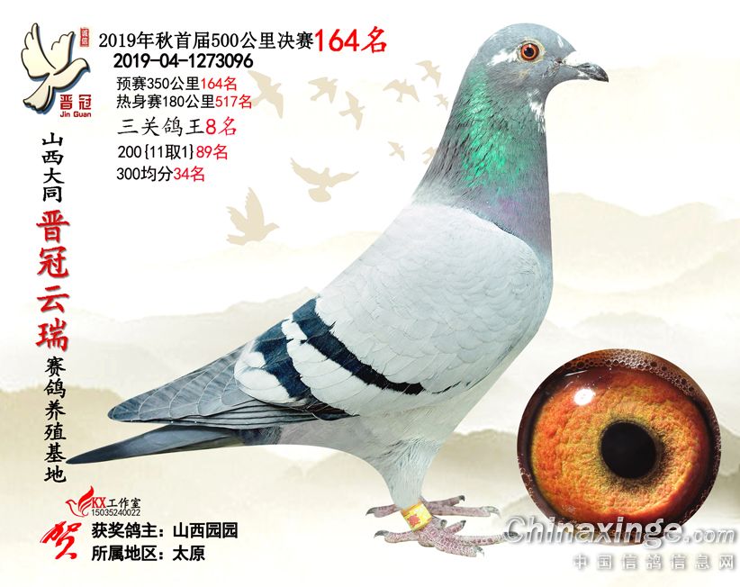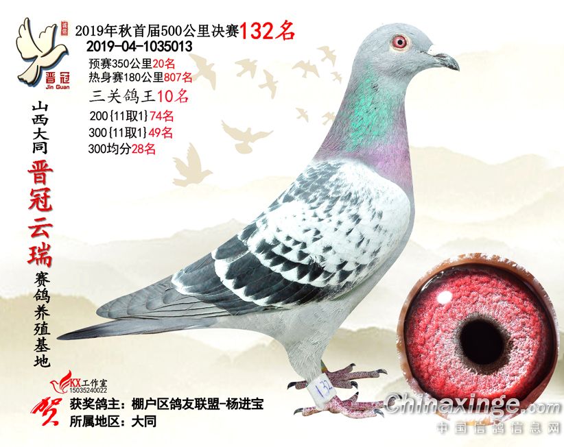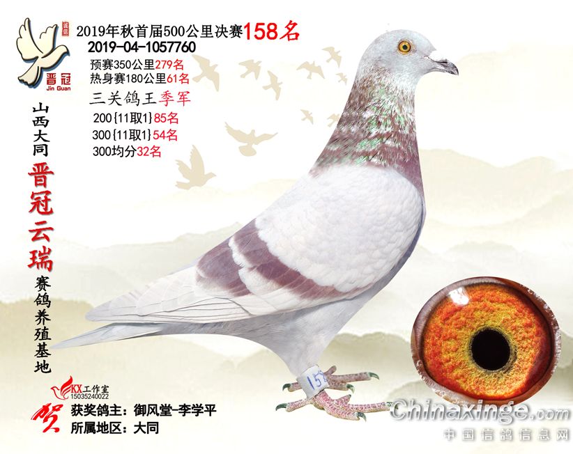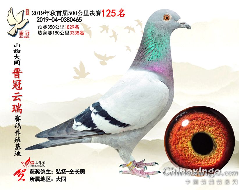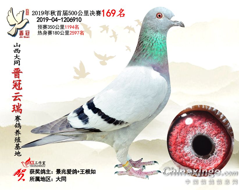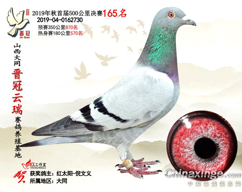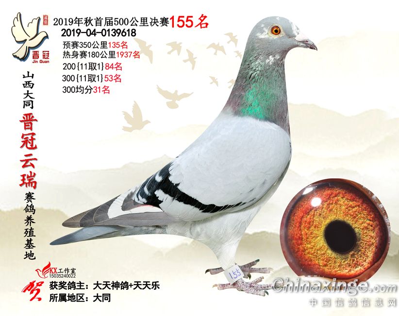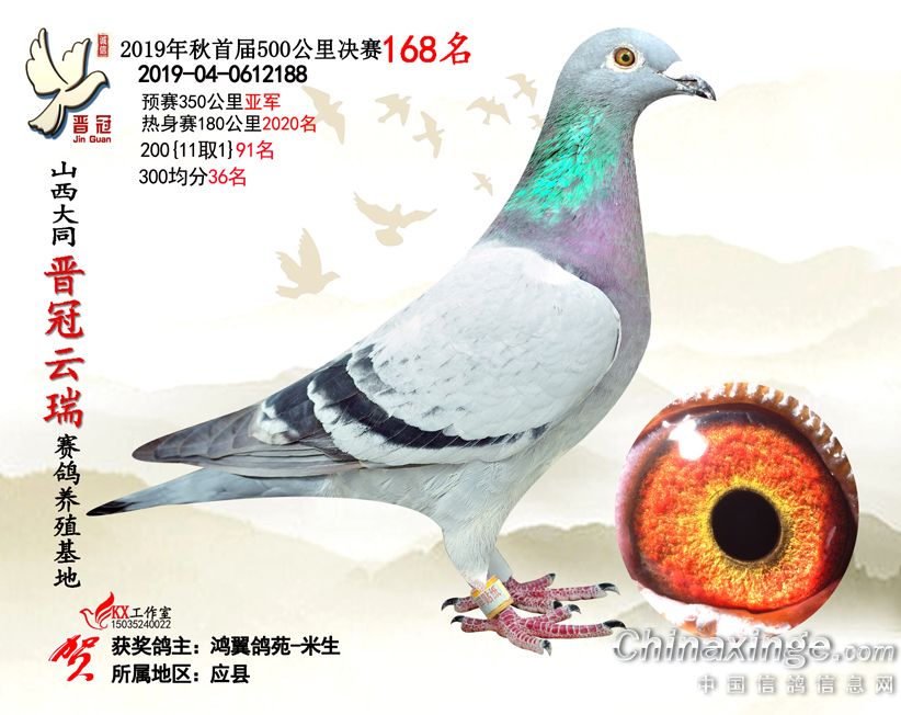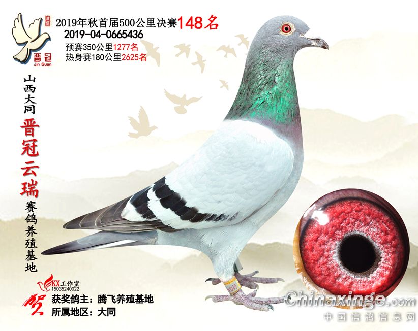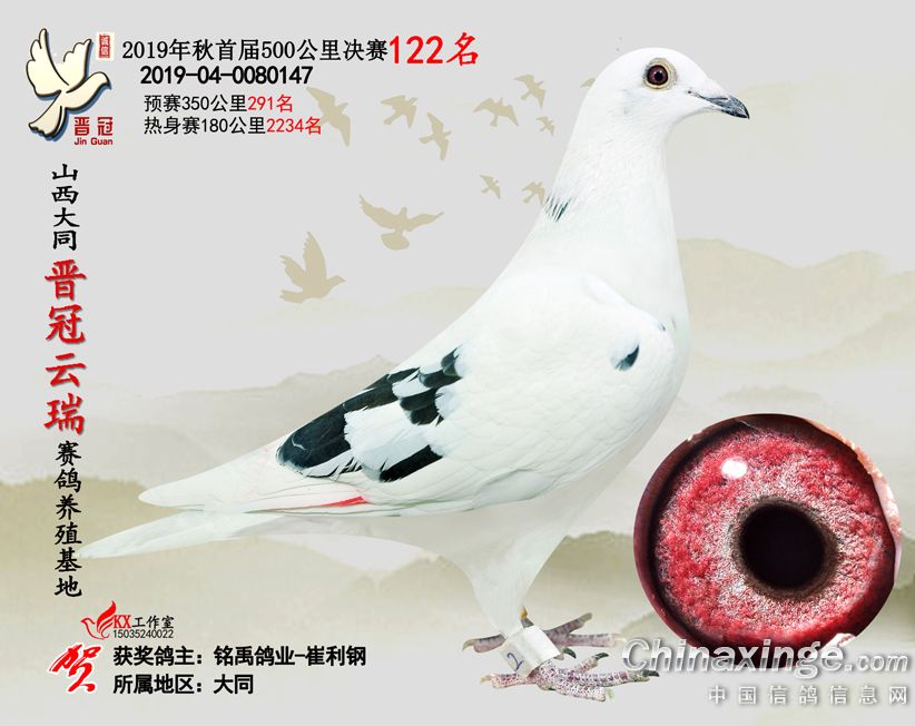 作品说明: 2019年晋冠云瑞赛鸽养殖基地决赛成绩鸽照片