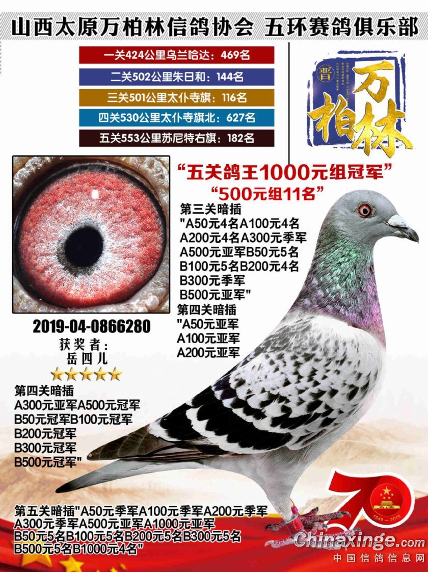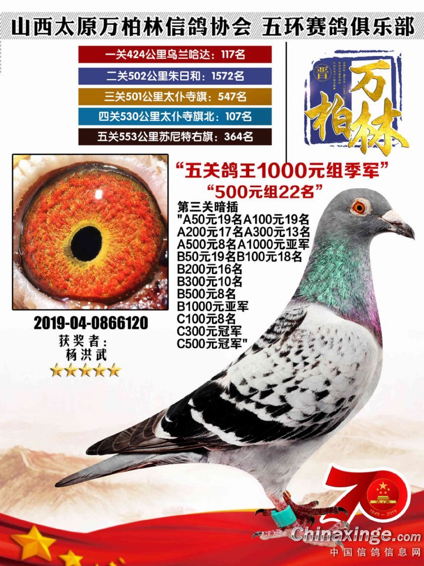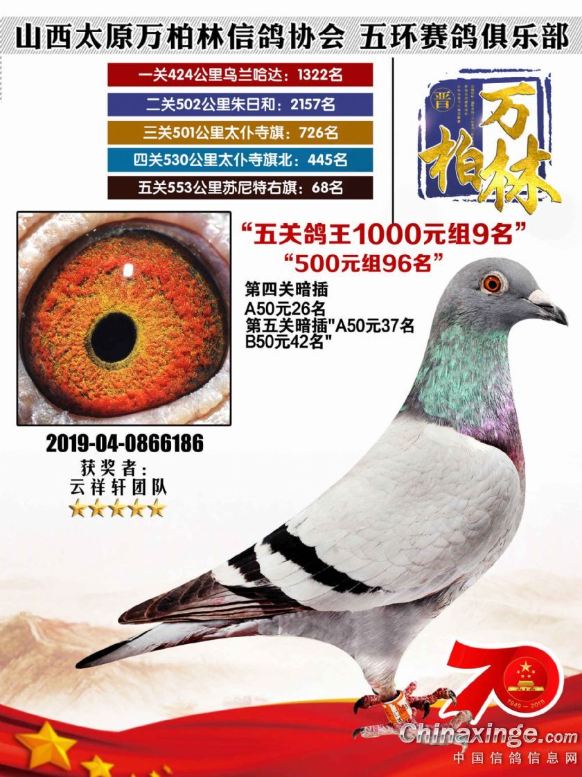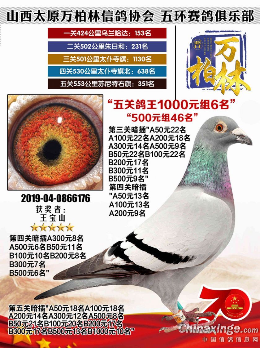 太原万柏林信鸽协会、山西五环俱乐部2019年特比环五关鸽王大奖赛1000元组获奖鸽