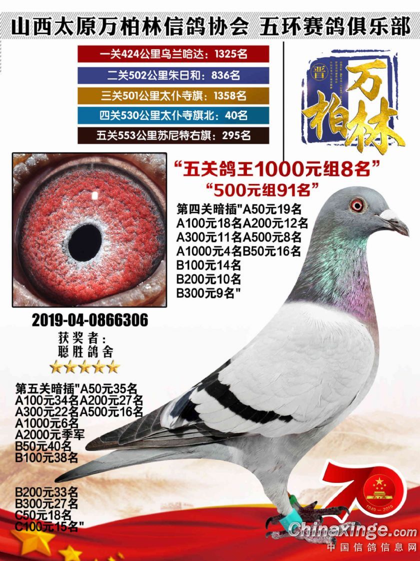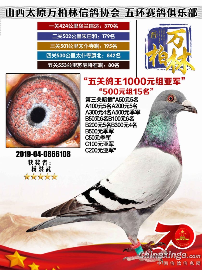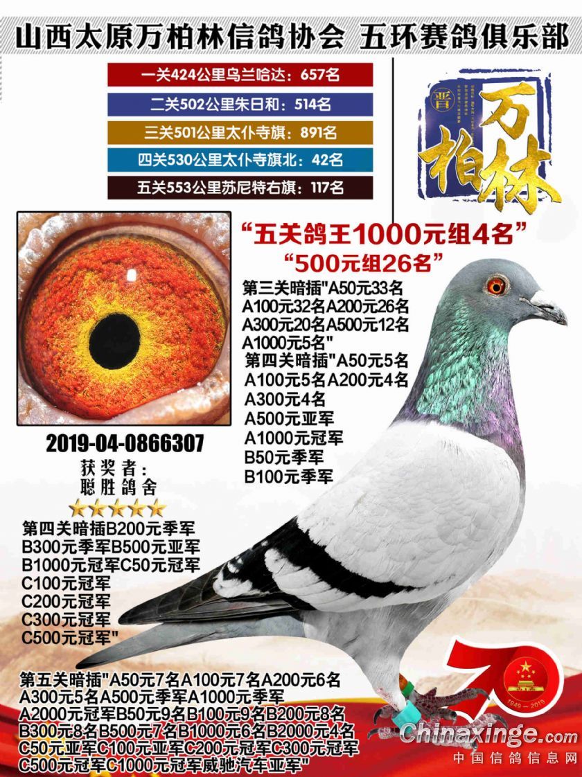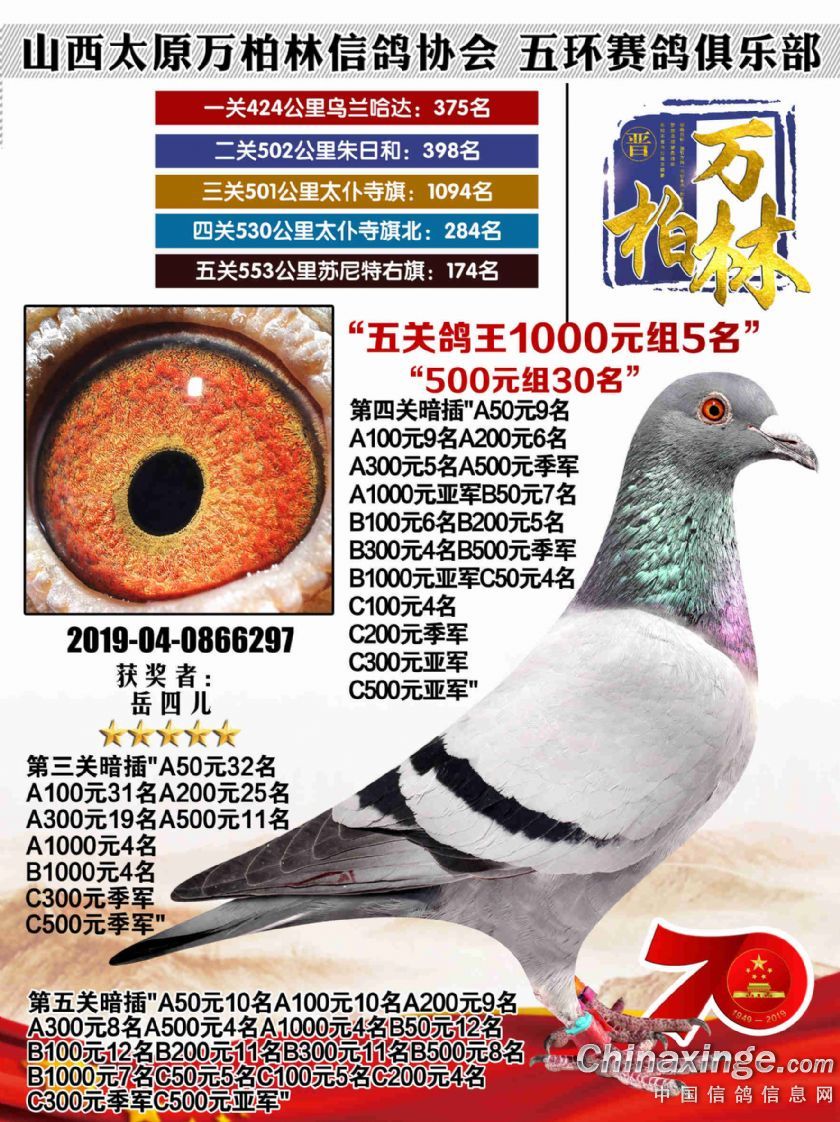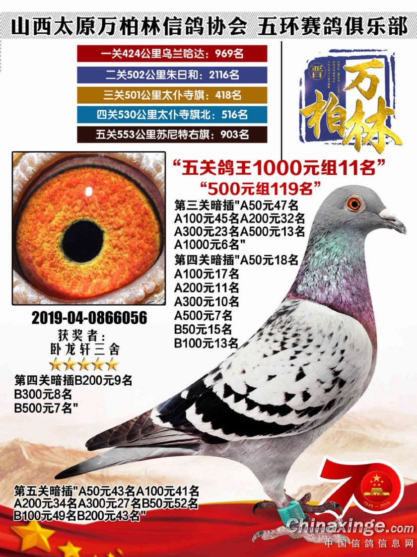 太原万柏林信鸽协会、山西五环俱乐部2019年特比环五关鸽王大奖赛1000元组获奖鸽