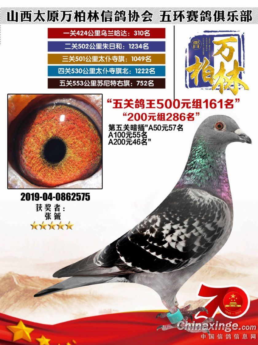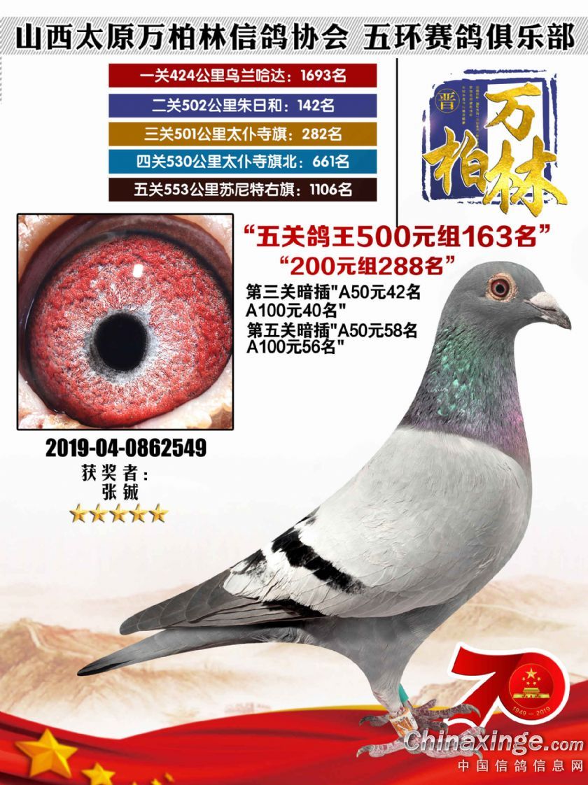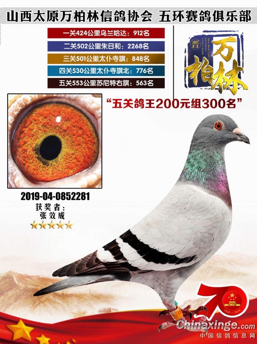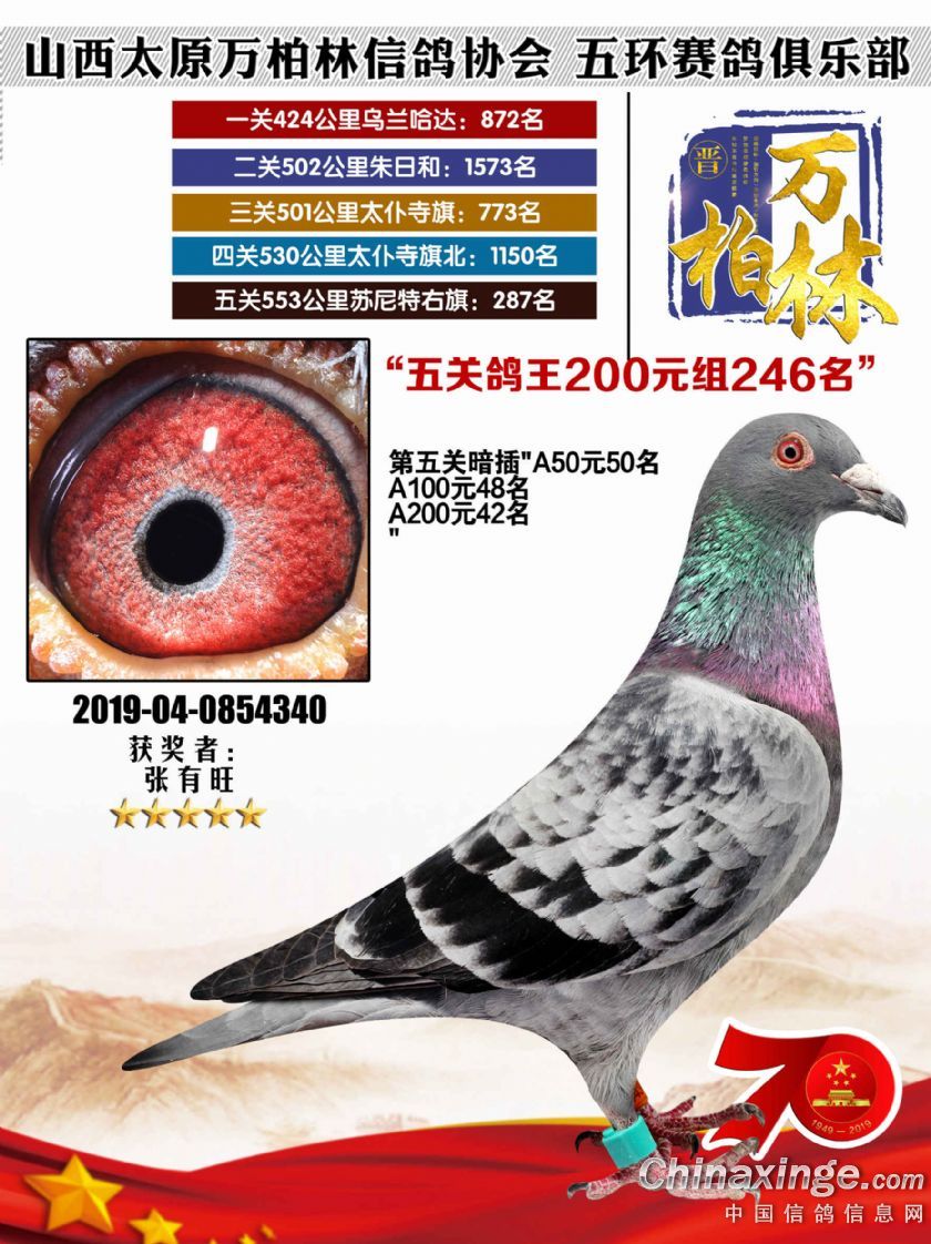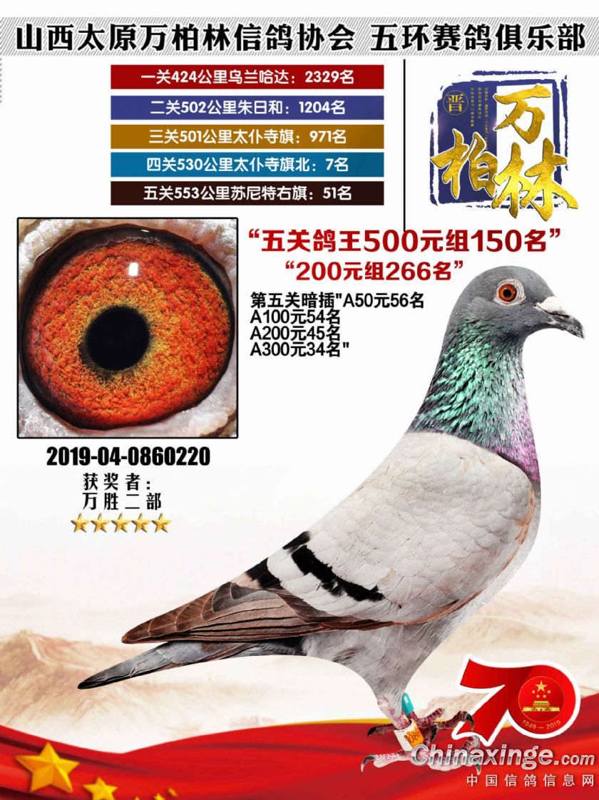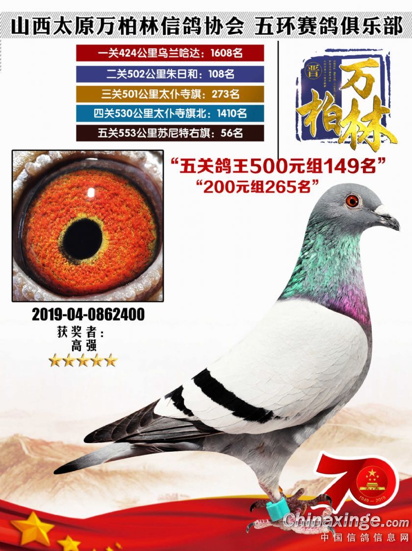 作品说明: 太原万柏林信鸽协会 山西五环俱乐部2019年特比环五关鸽王大奖赛200元组241-300名获