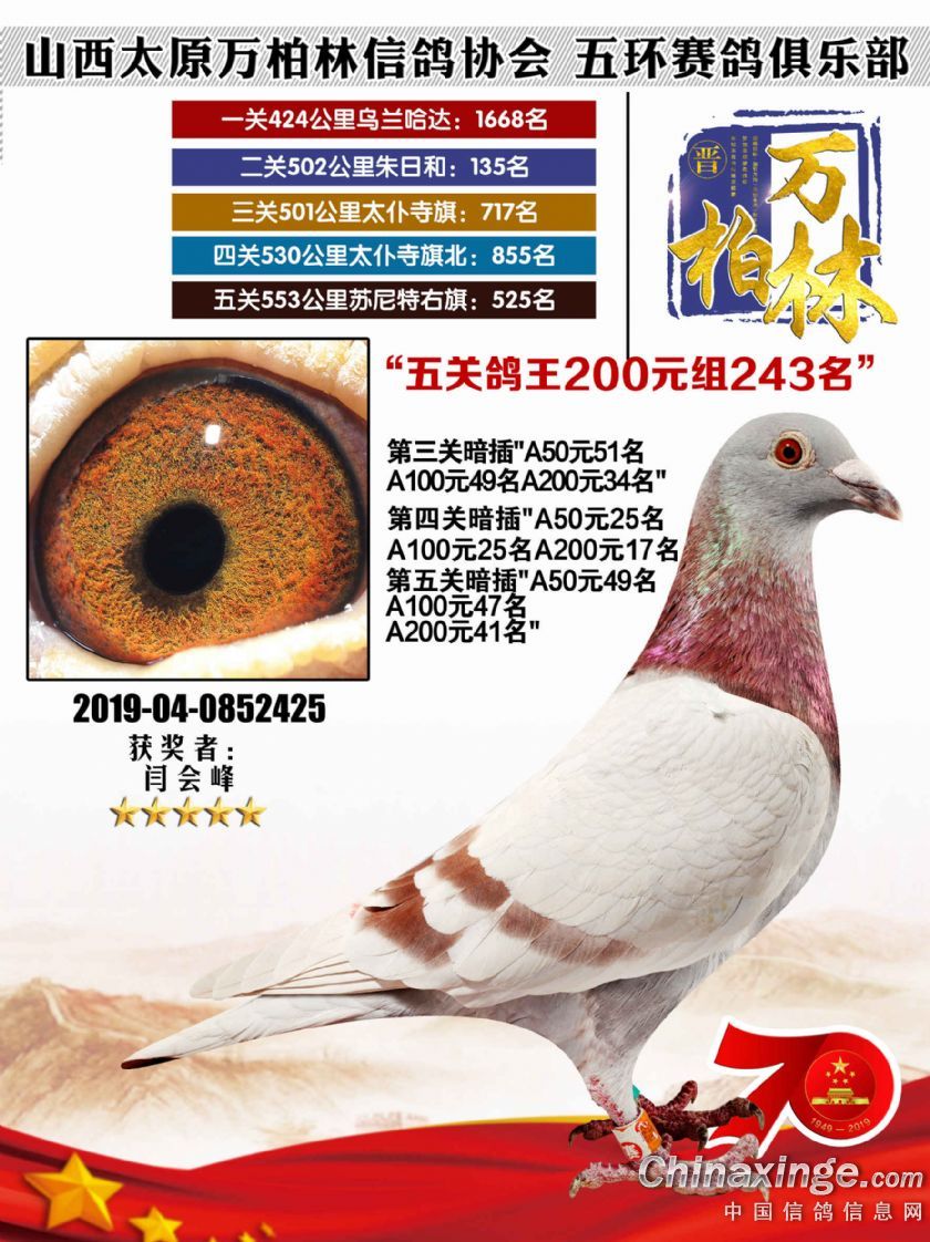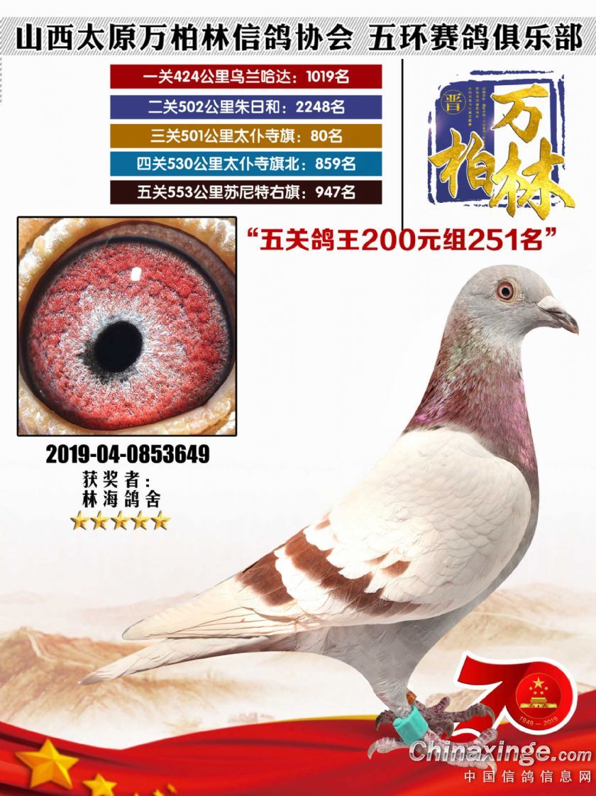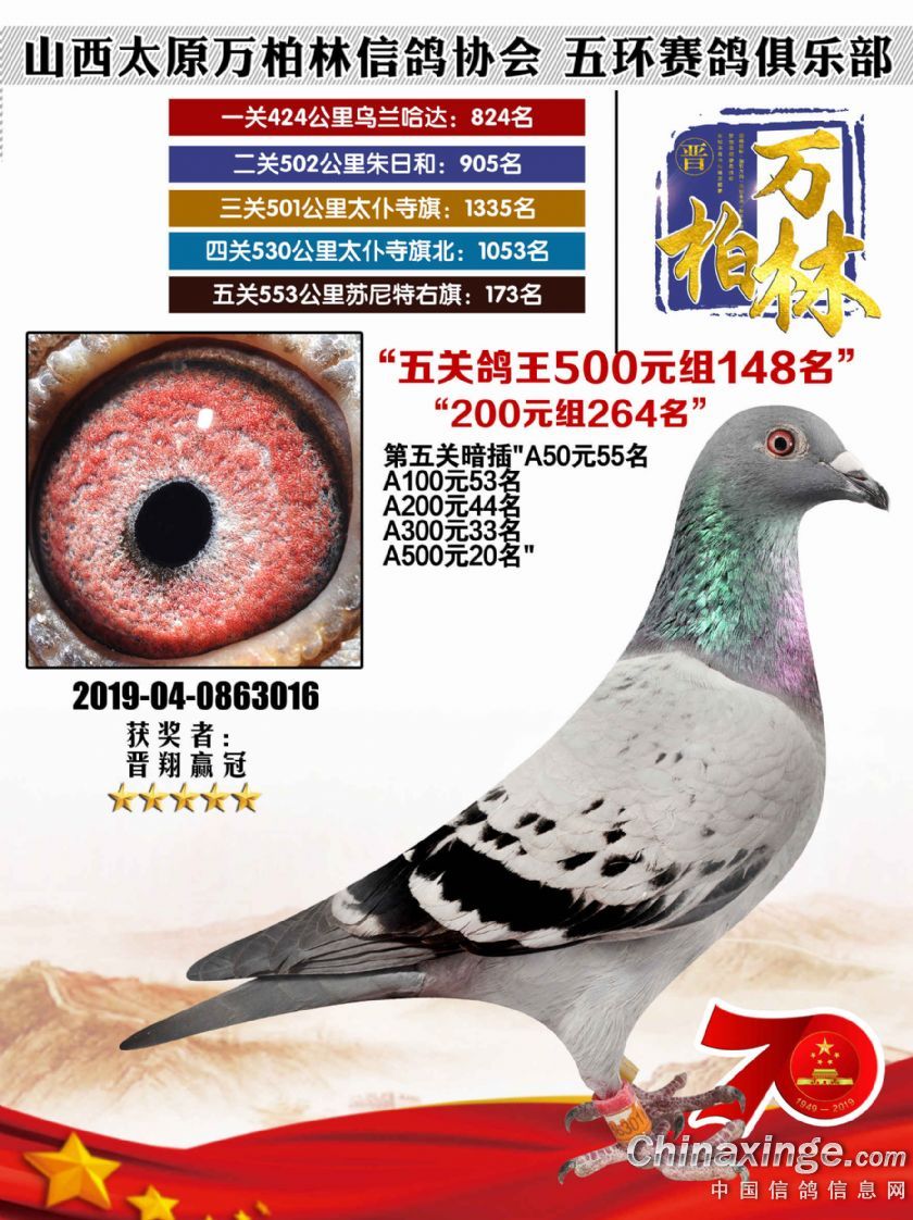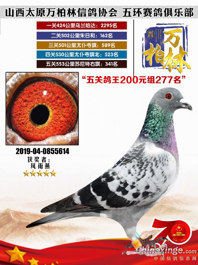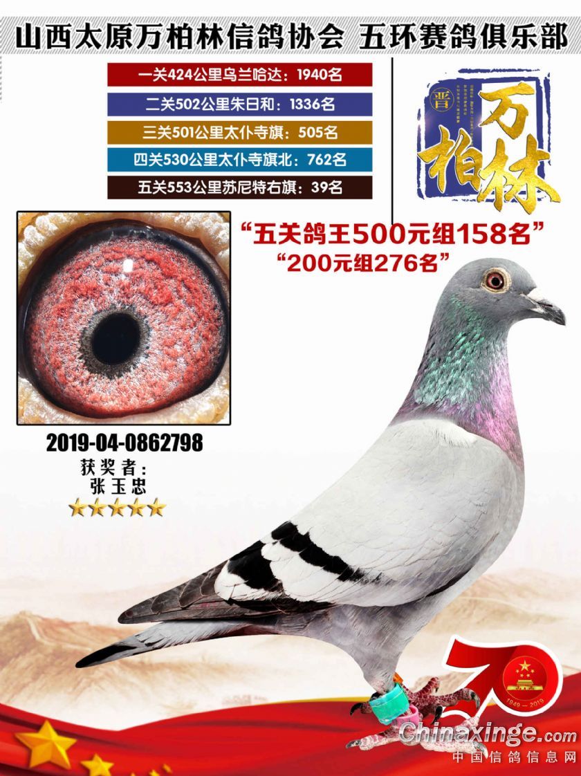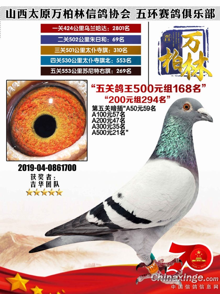 作品说明: 太原万柏林信鸽协会 山西五环俱乐部2019年特比环五关鸽王大奖赛200元组241-300名获