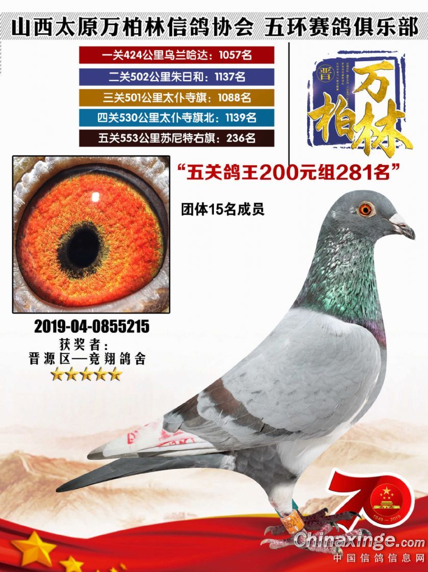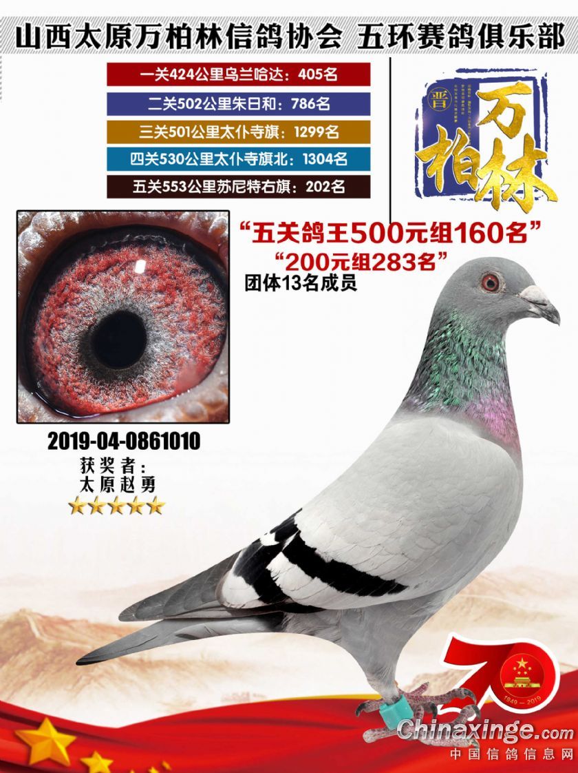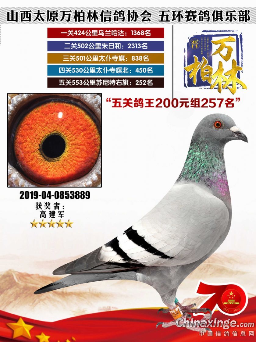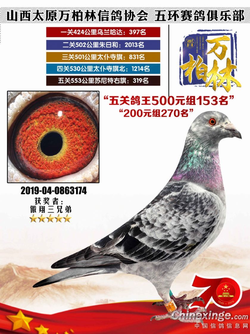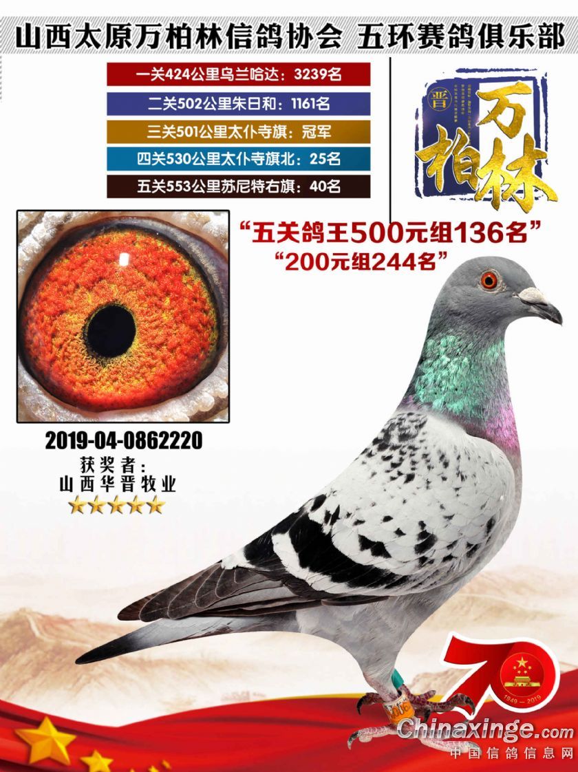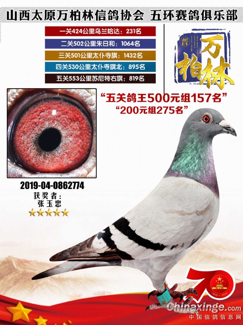 作品说明: 太原万柏林信鸽协会 山西五环俱乐部2019年特比环五关鸽王大奖赛200元组241-300名获