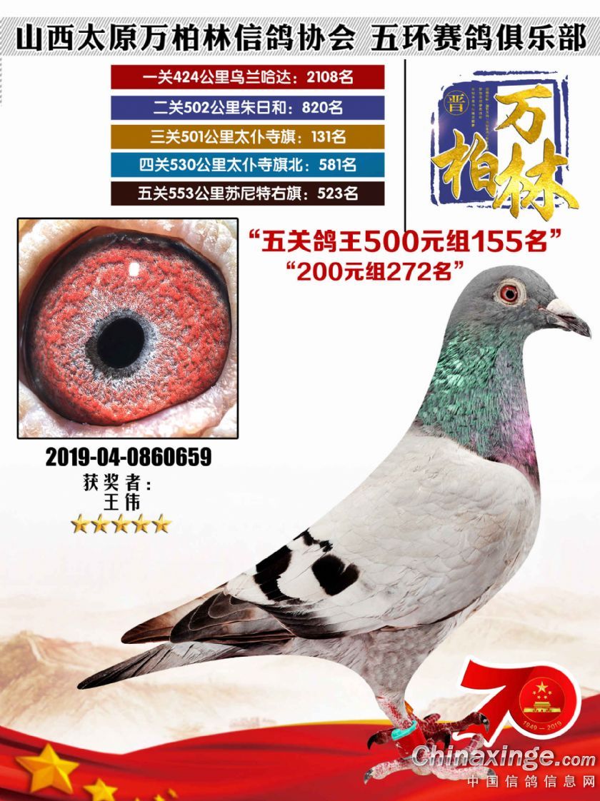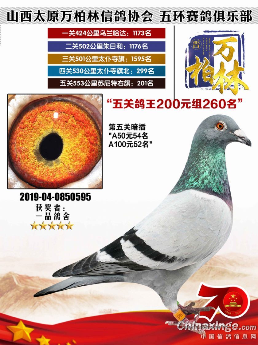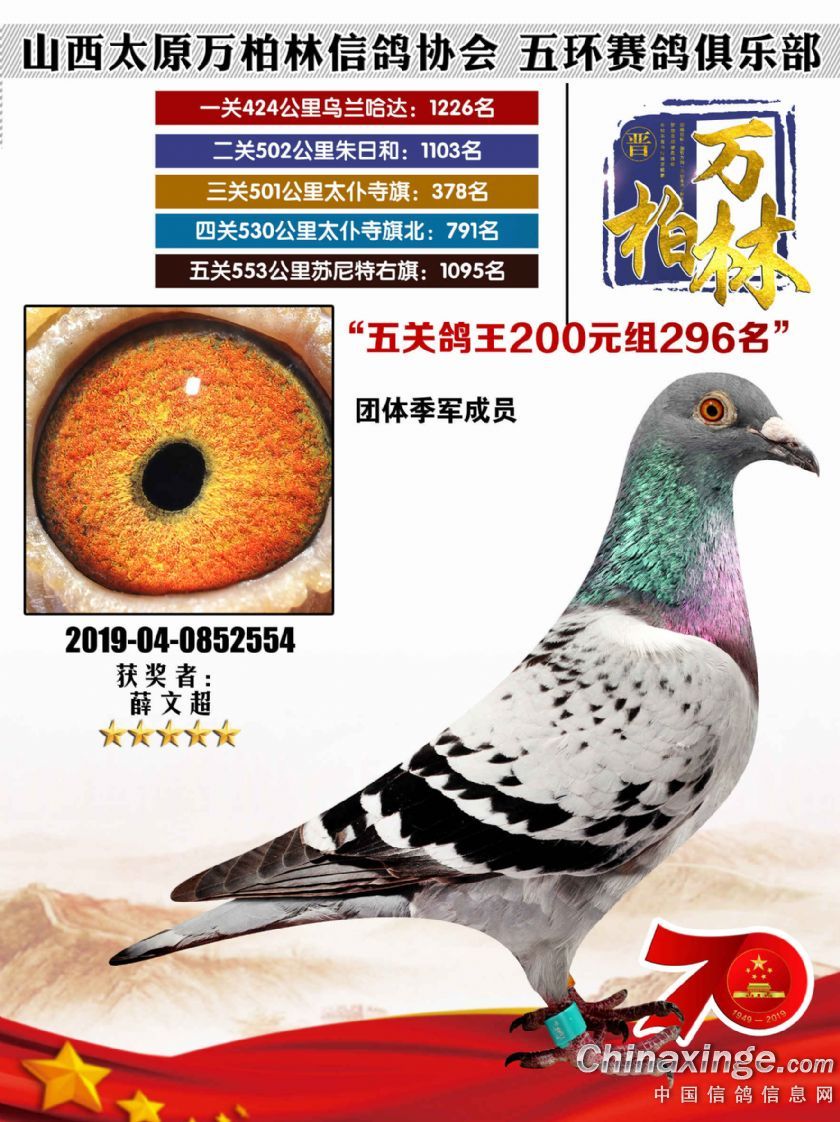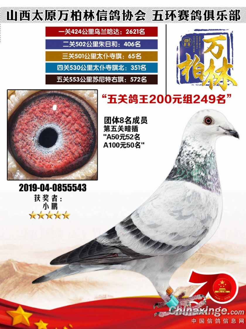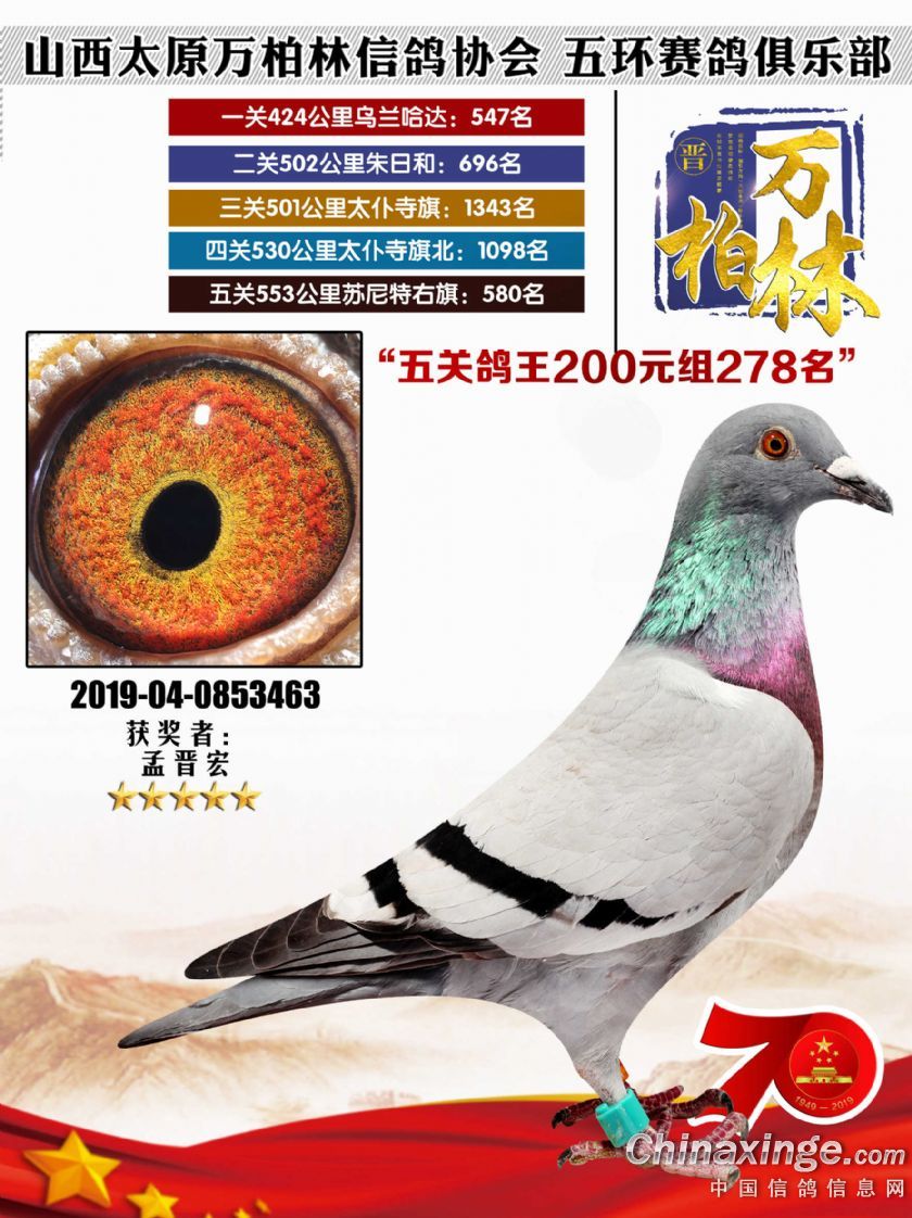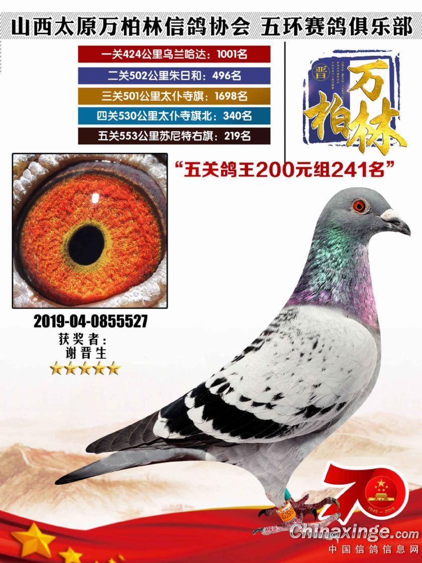 作品说明: 太原万柏林信鸽协会 山西五环俱乐部2019年特比环五关鸽王大奖赛200元组241-300名获