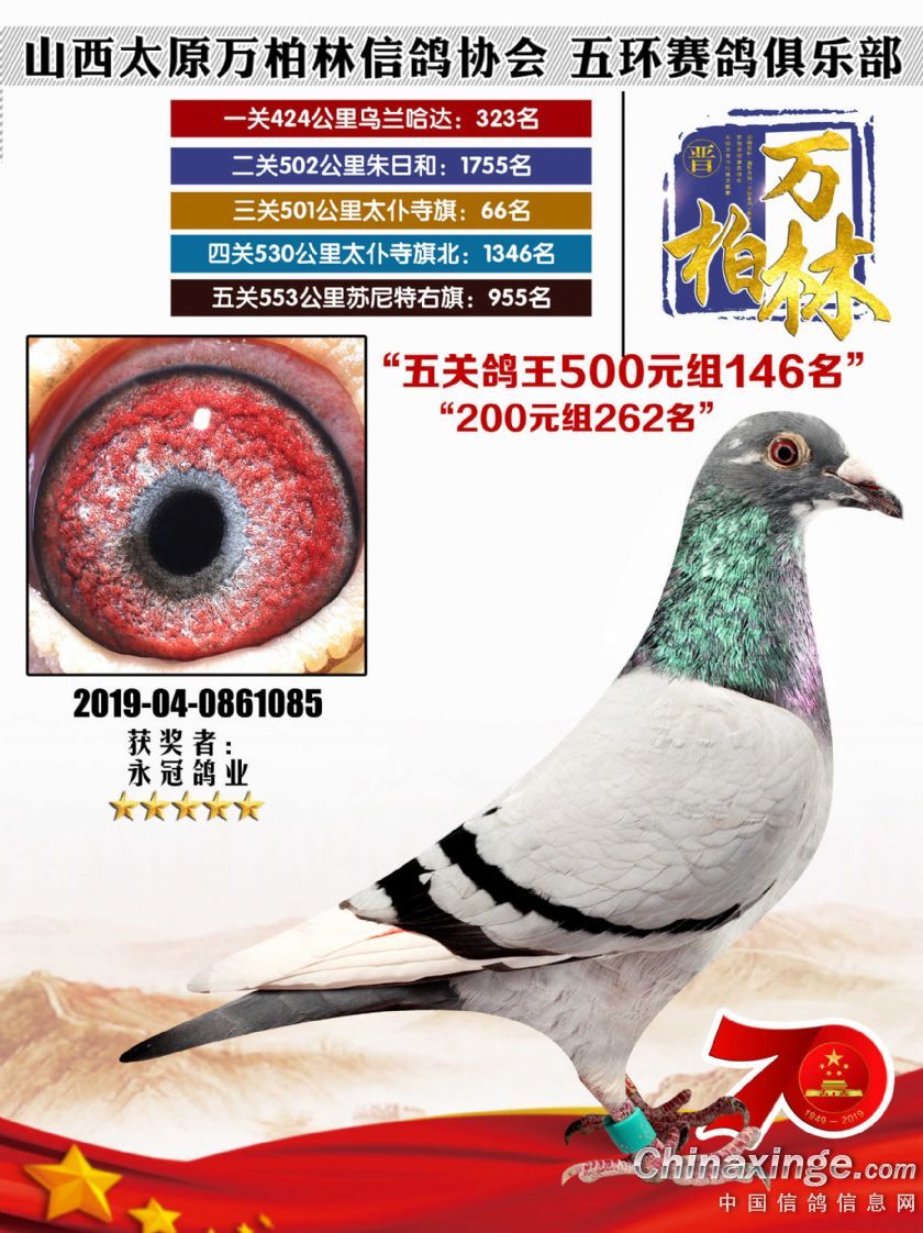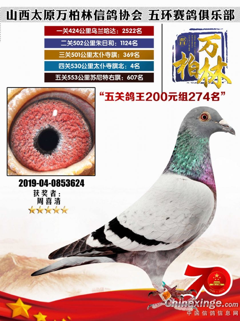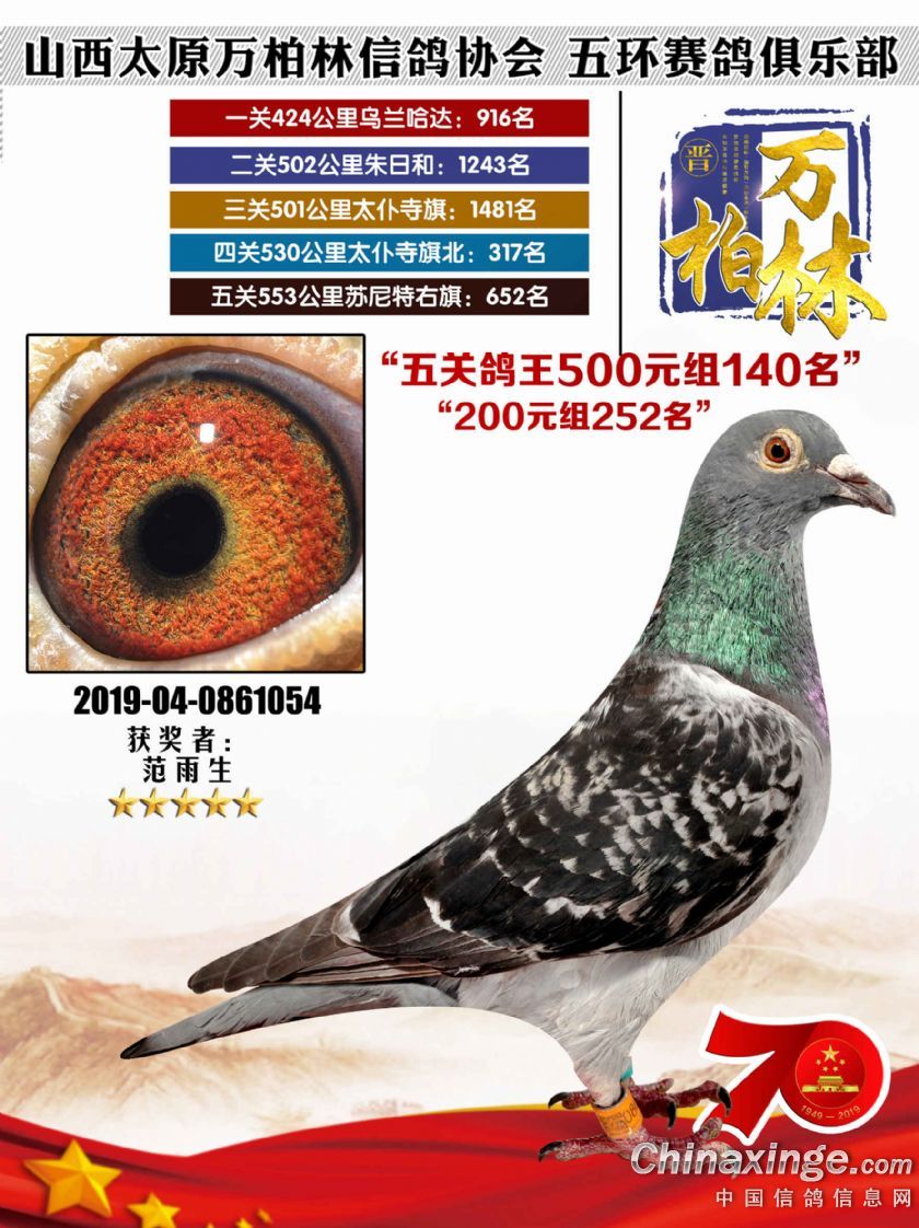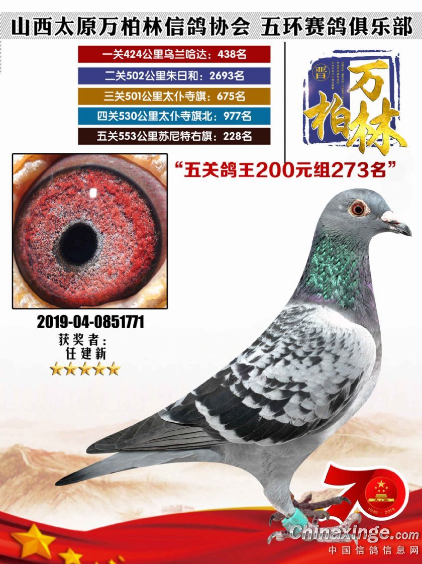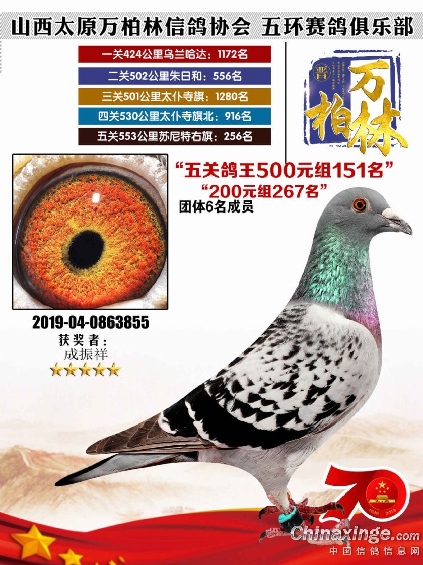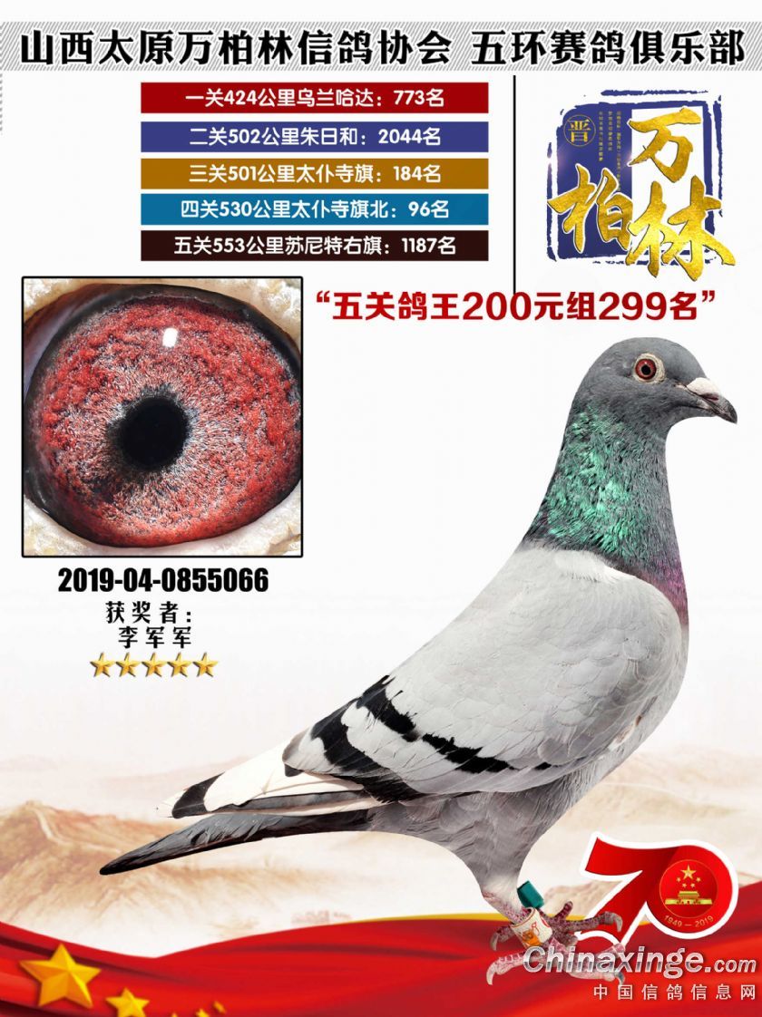 作品说明: 太原万柏林信鸽协会 山西五环俱乐部2019年特比环五关鸽王大奖赛200元组241-300名获