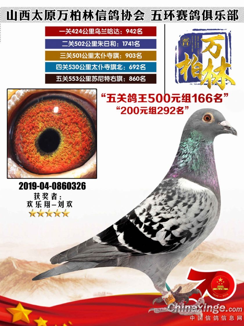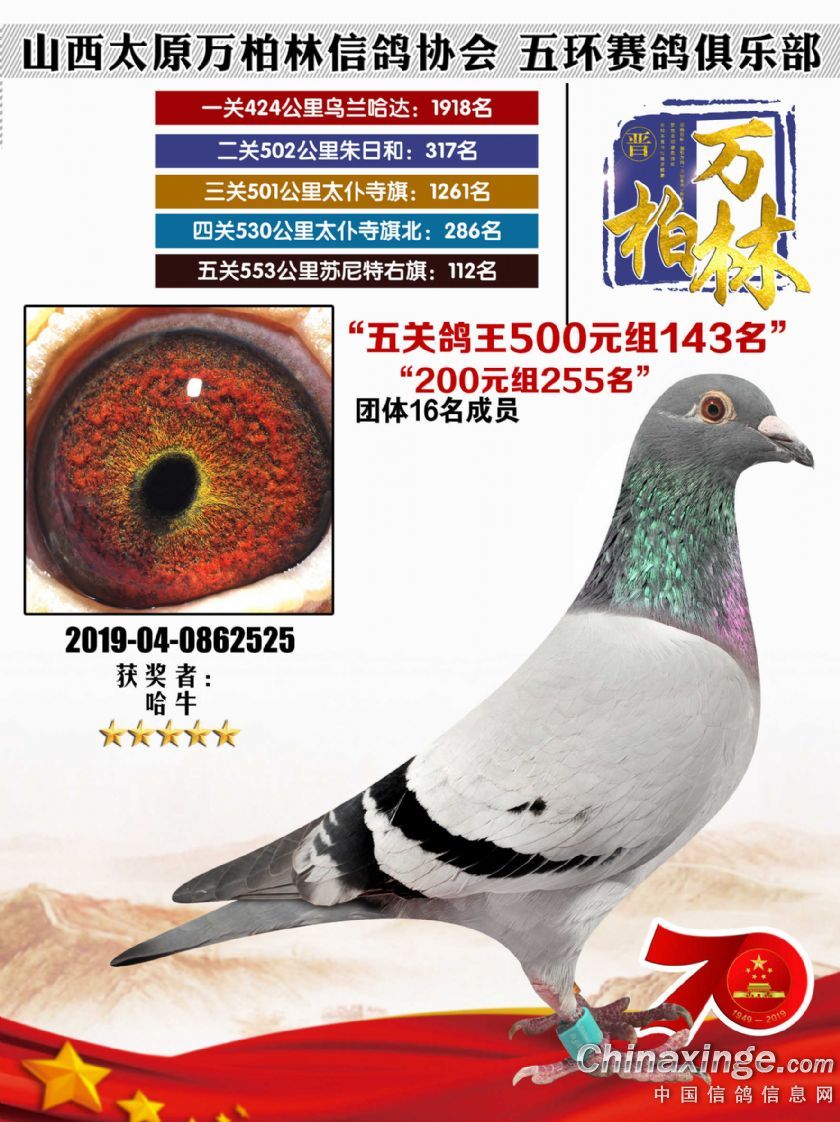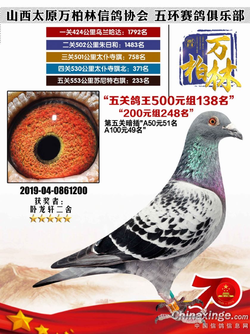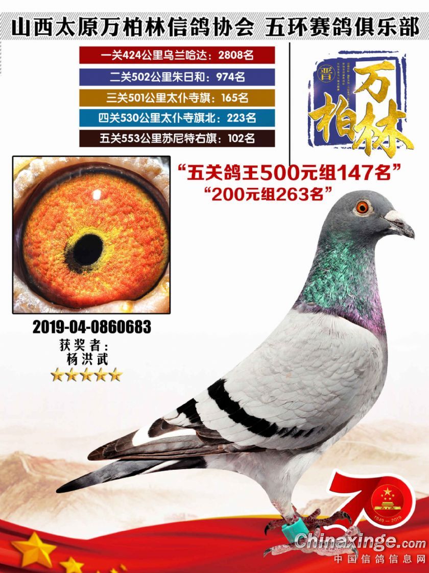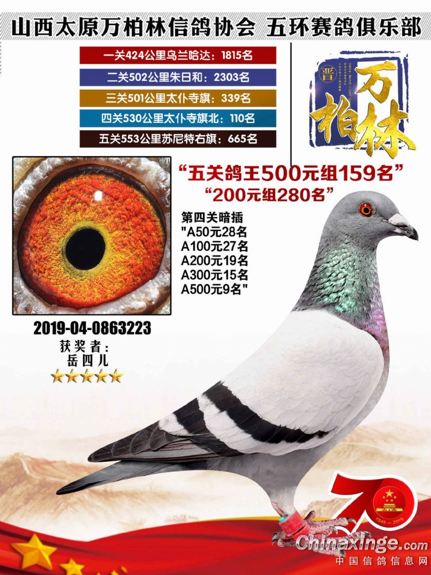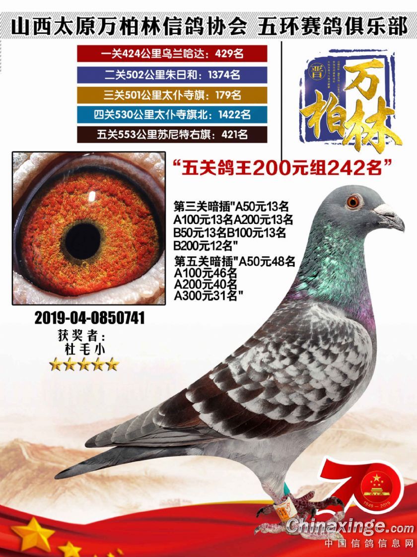 作品说明: 太原万柏林信鸽协会 山西五环俱乐部2019年特比环五关鸽王大奖赛200元组241-300名获