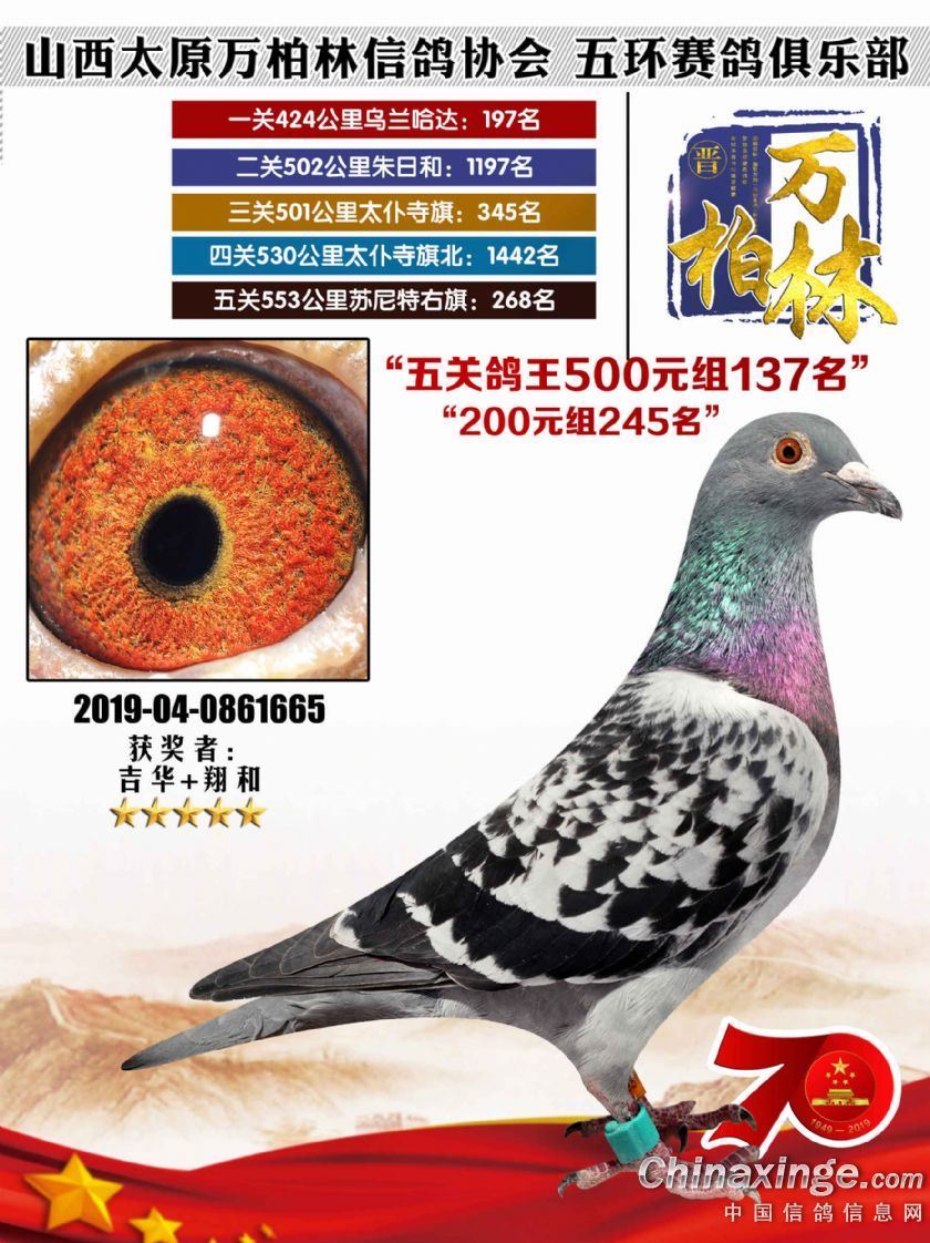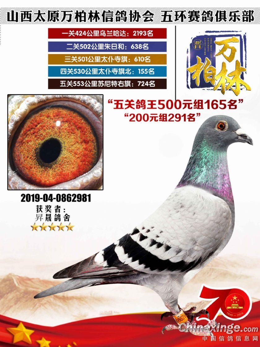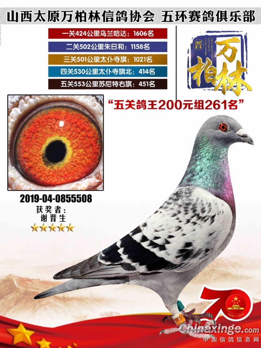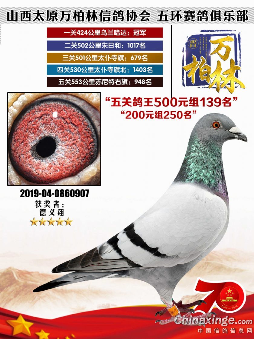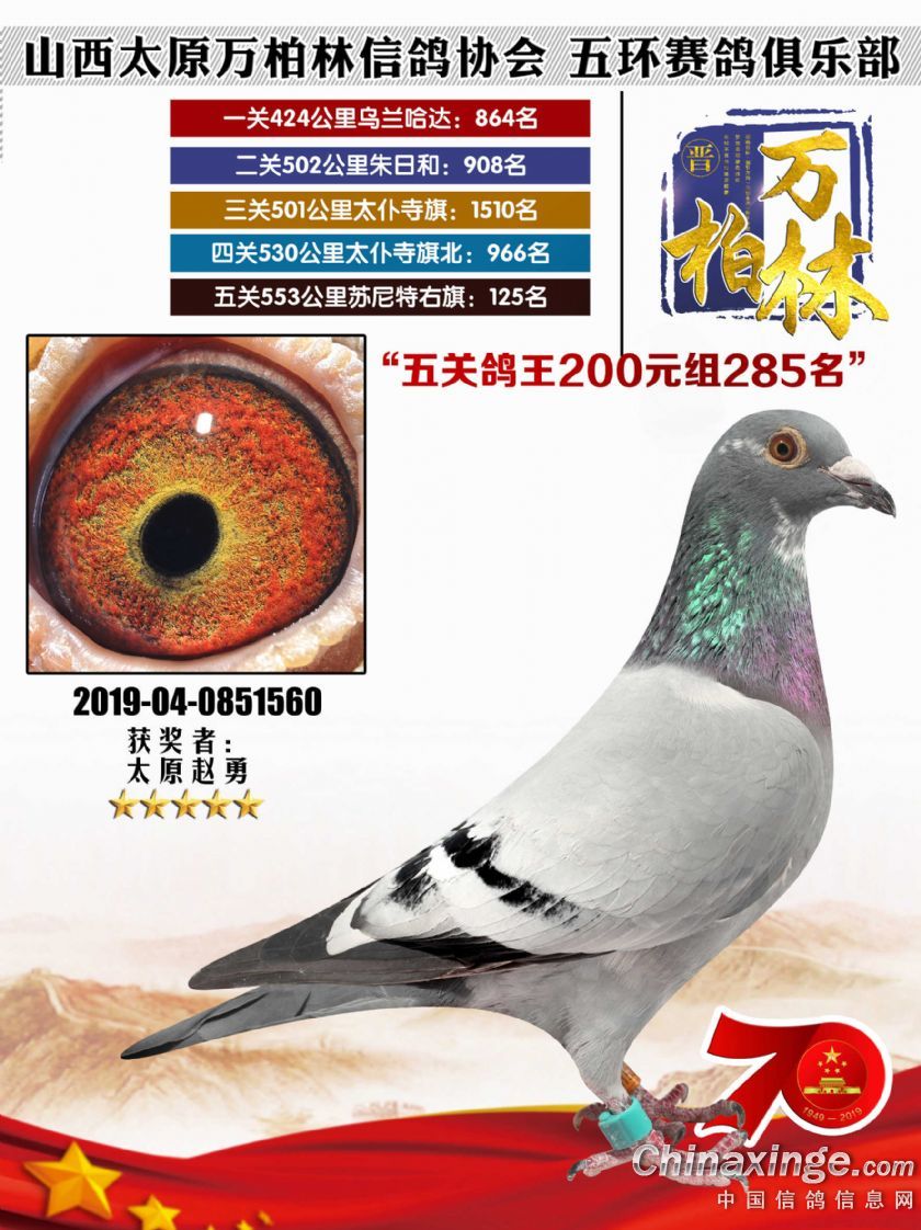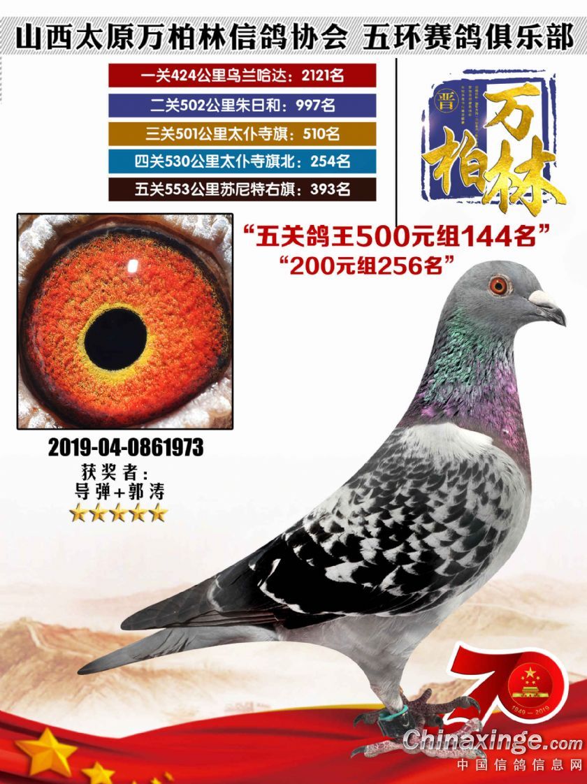作品说明: 太原万柏林信鸽协会 山西五环俱乐部2019年特比环五关鸽王大奖赛200元组241-300名获