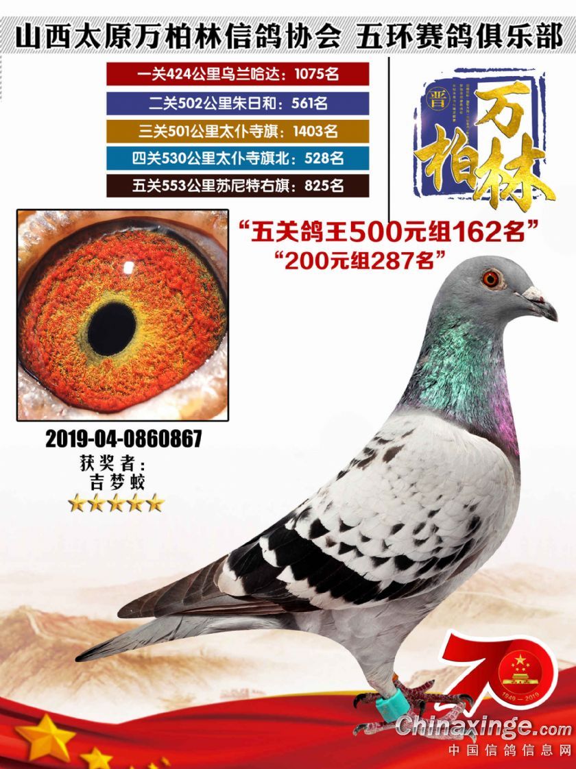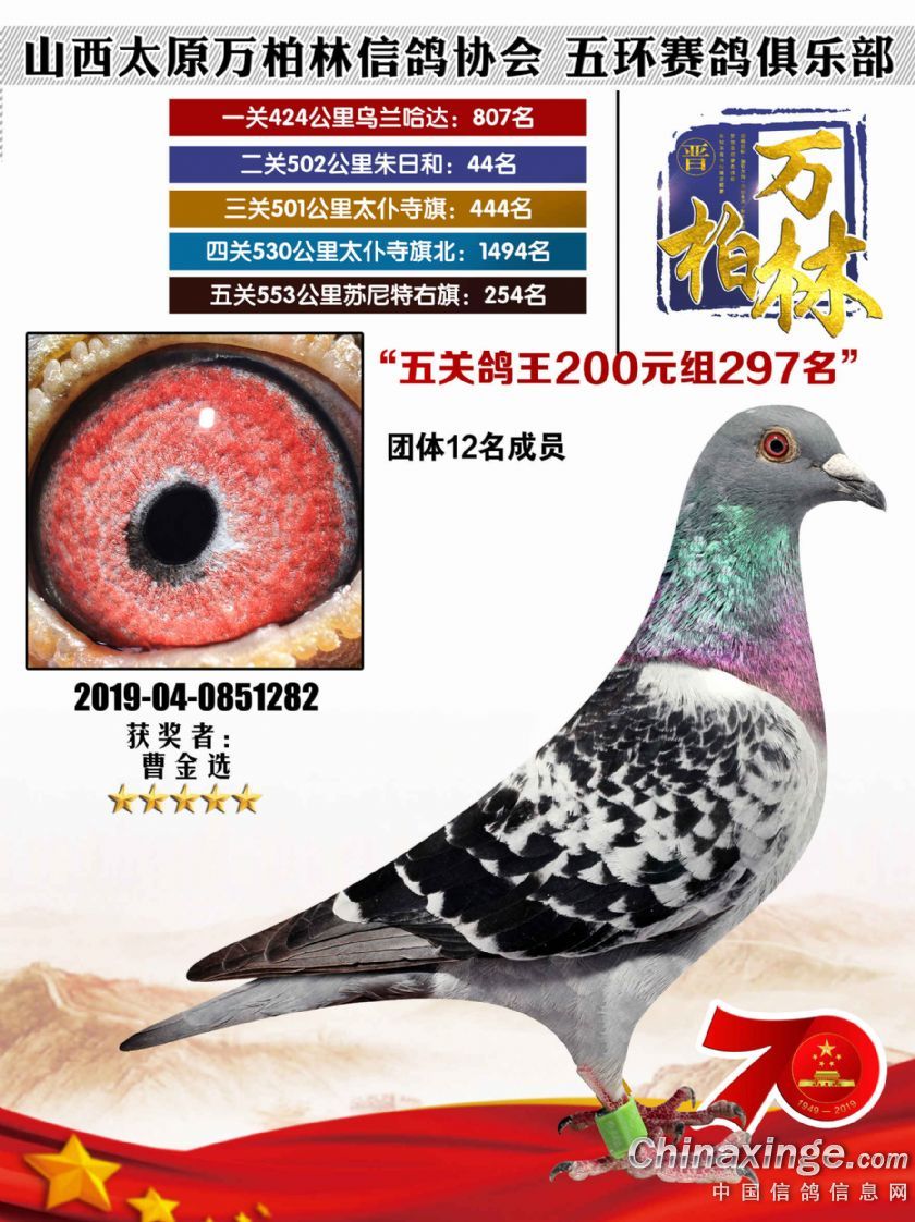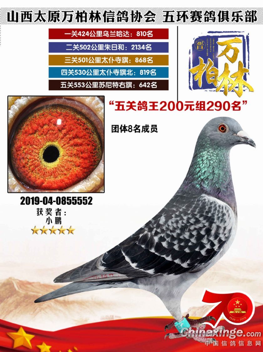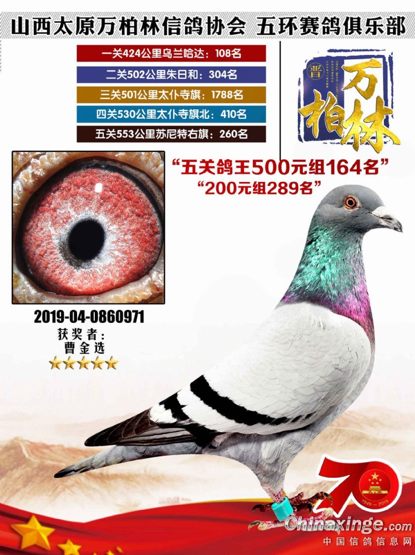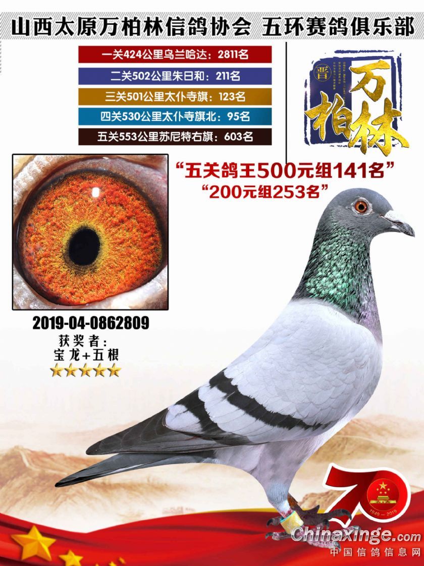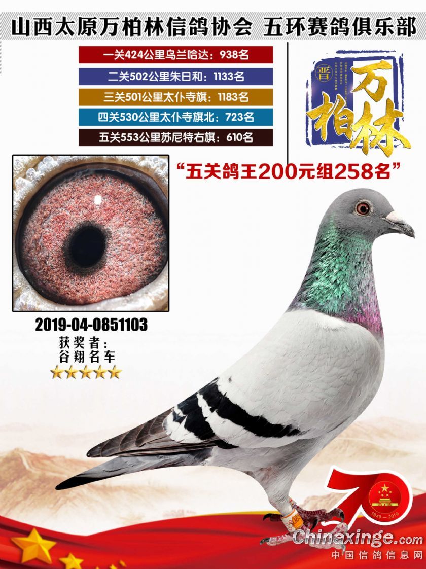 作品说明: 太原万柏林信鸽协会 山西五环俱乐部2019年特比环五关鸽王大奖赛200元组241-300名获