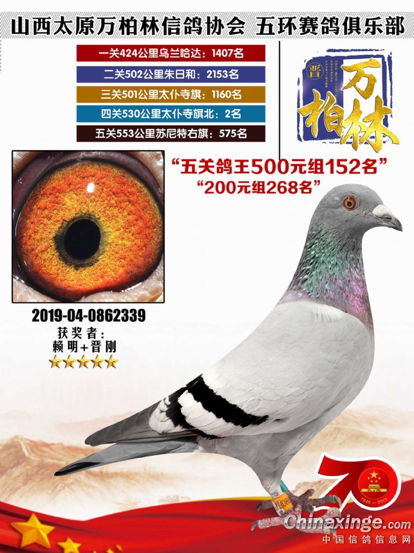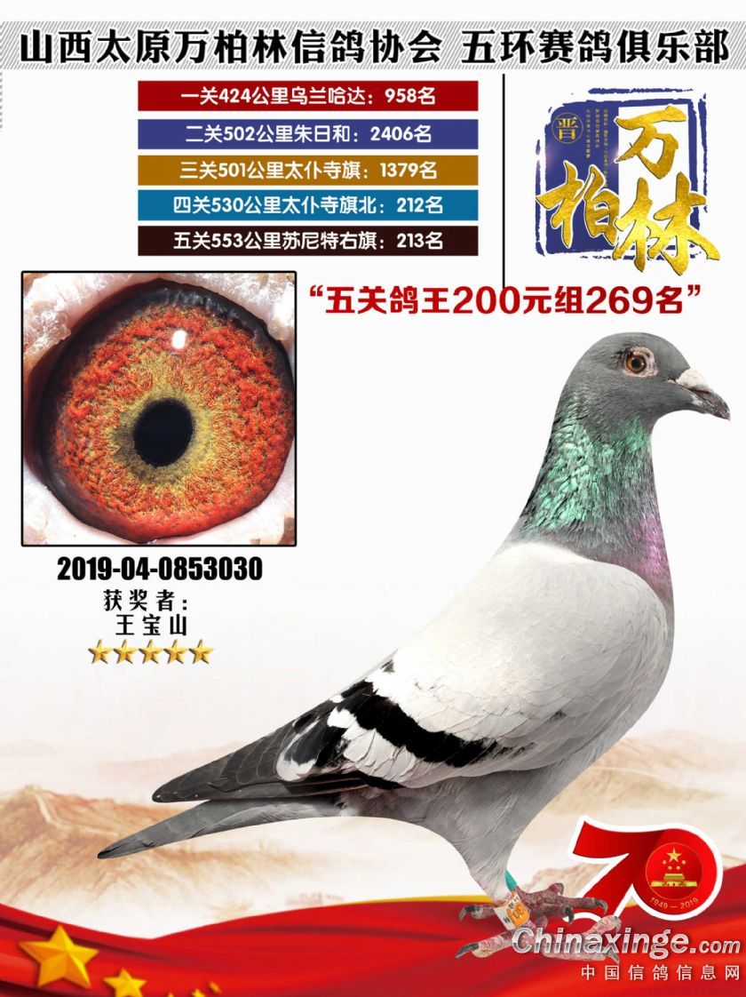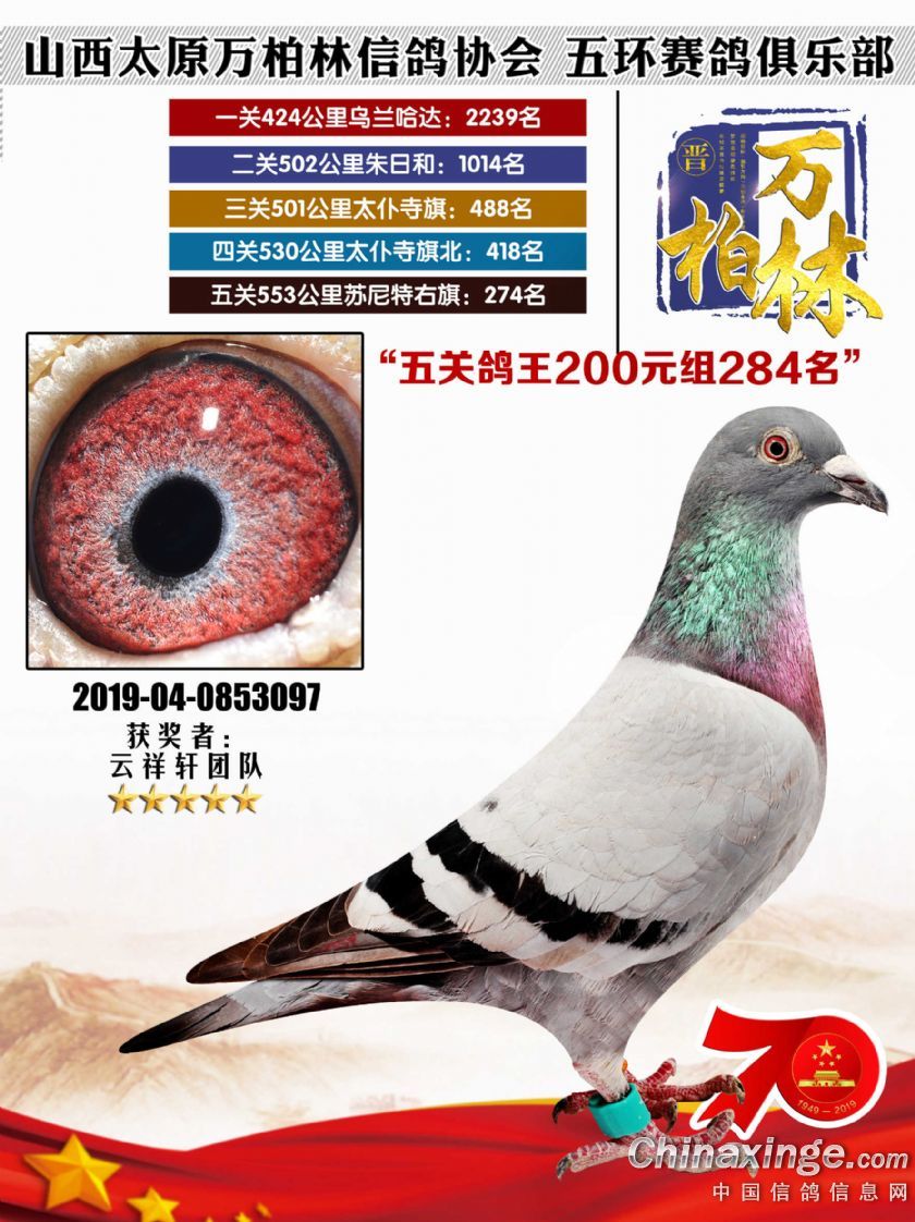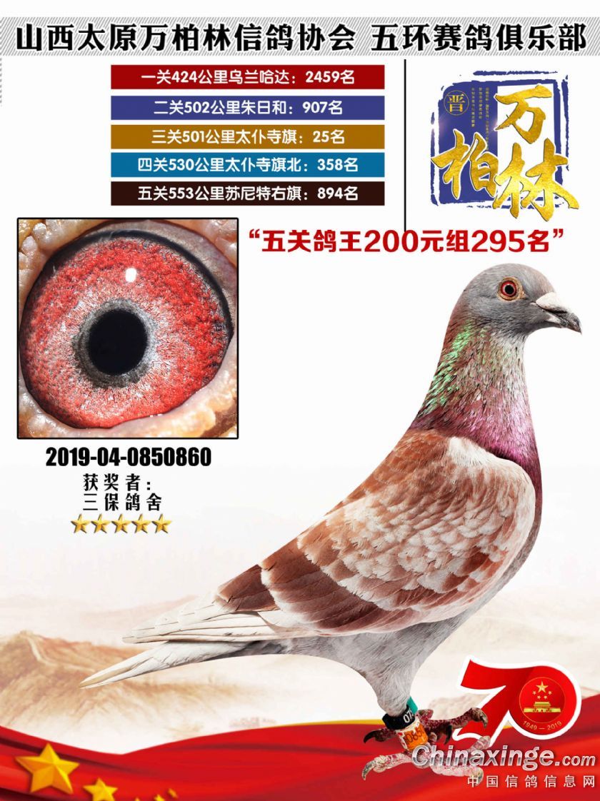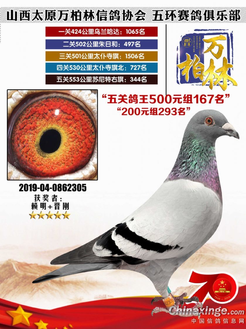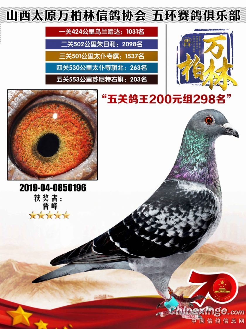 太原万柏林信鸽协会 山西五环俱乐部2019年特比环五关鸽王大奖赛200元组241-300名获 奖鸽靓照