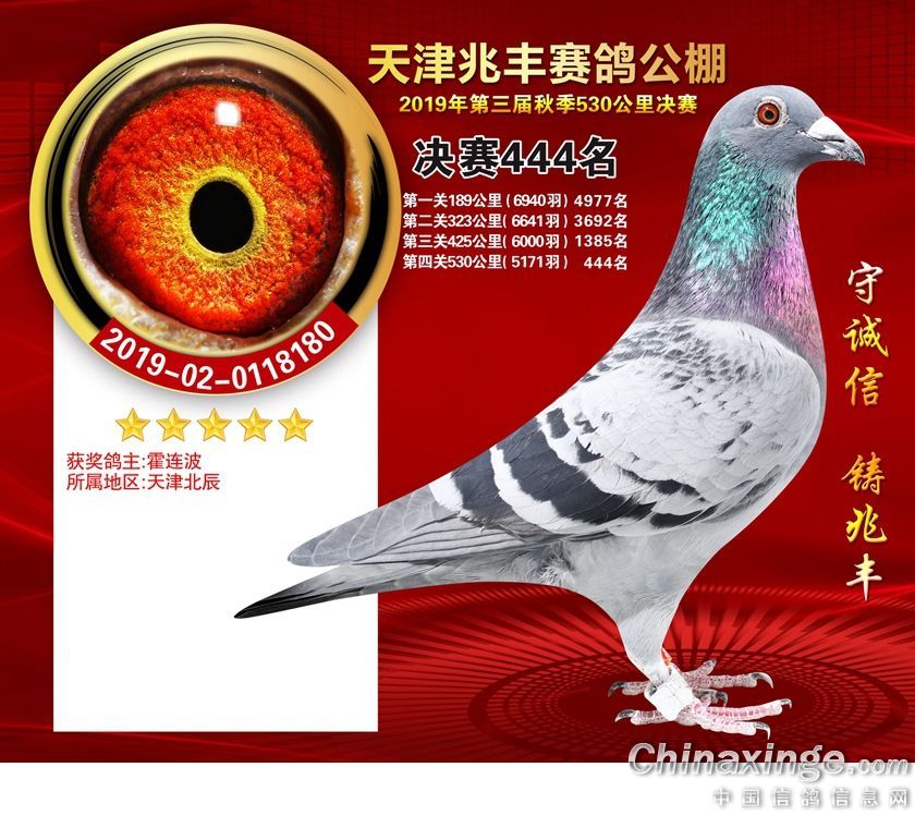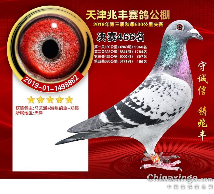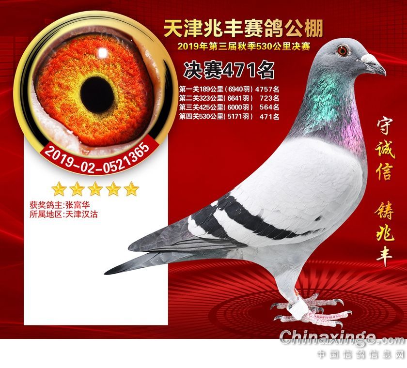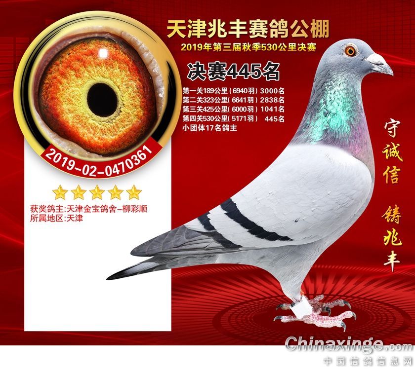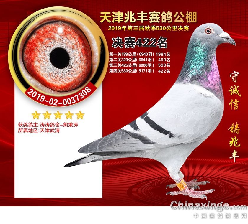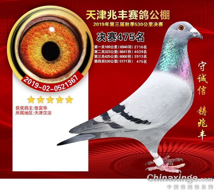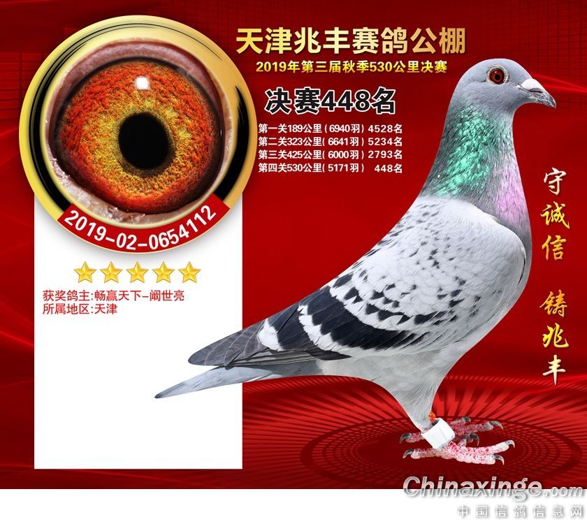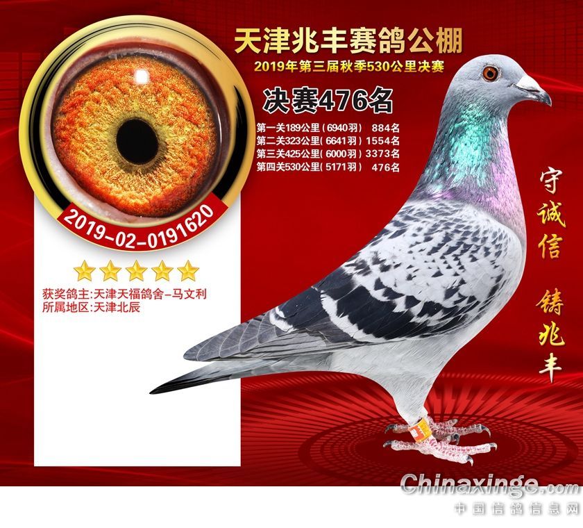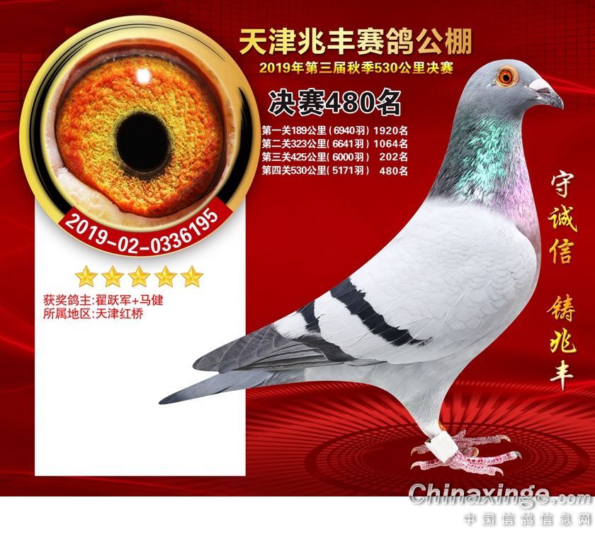 天津兆丰赛鸽公棚2019年获奖鸽421-480名