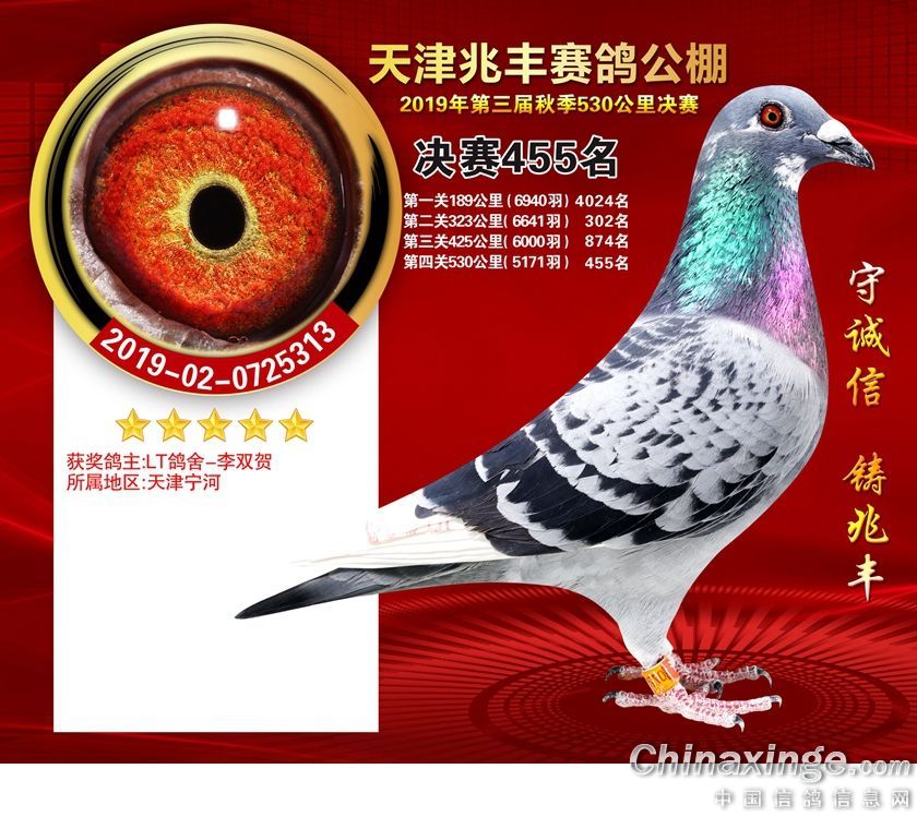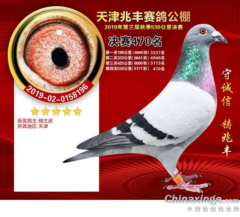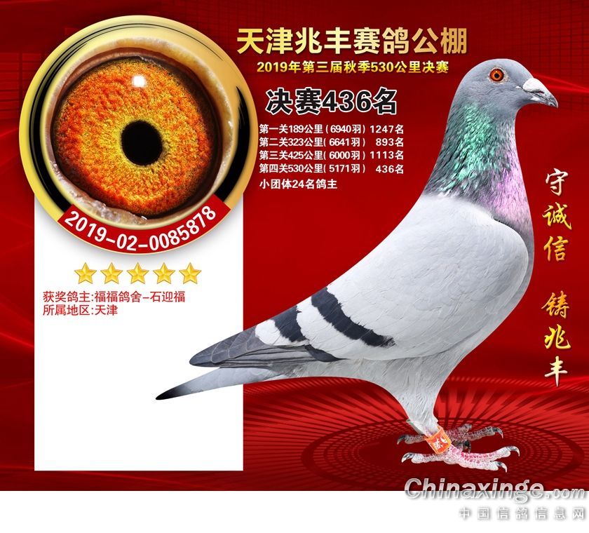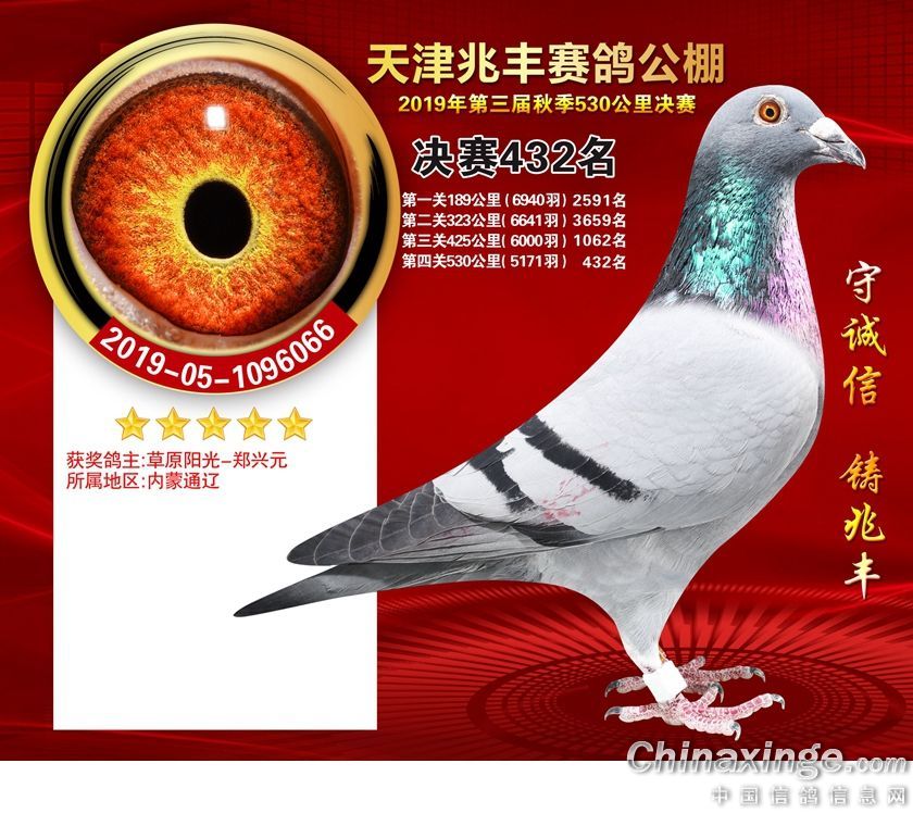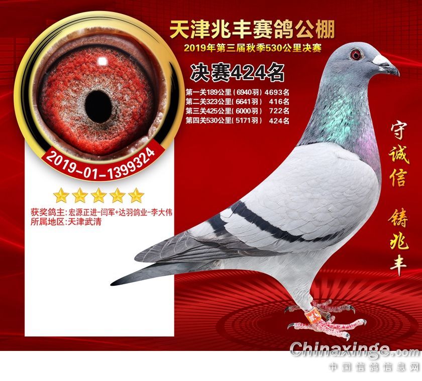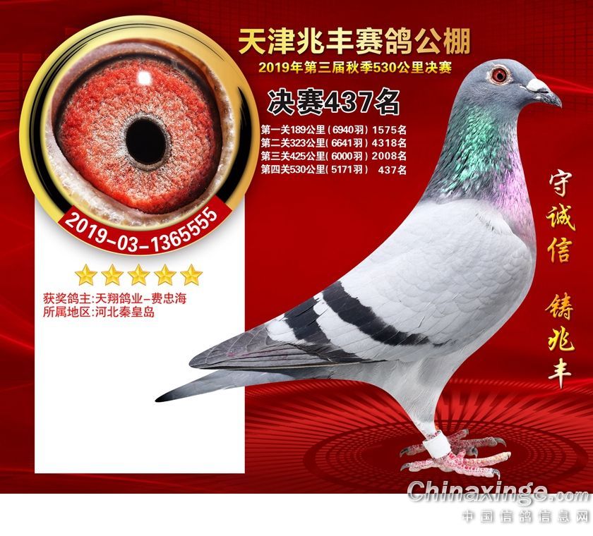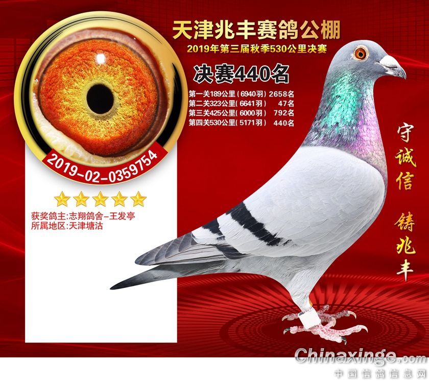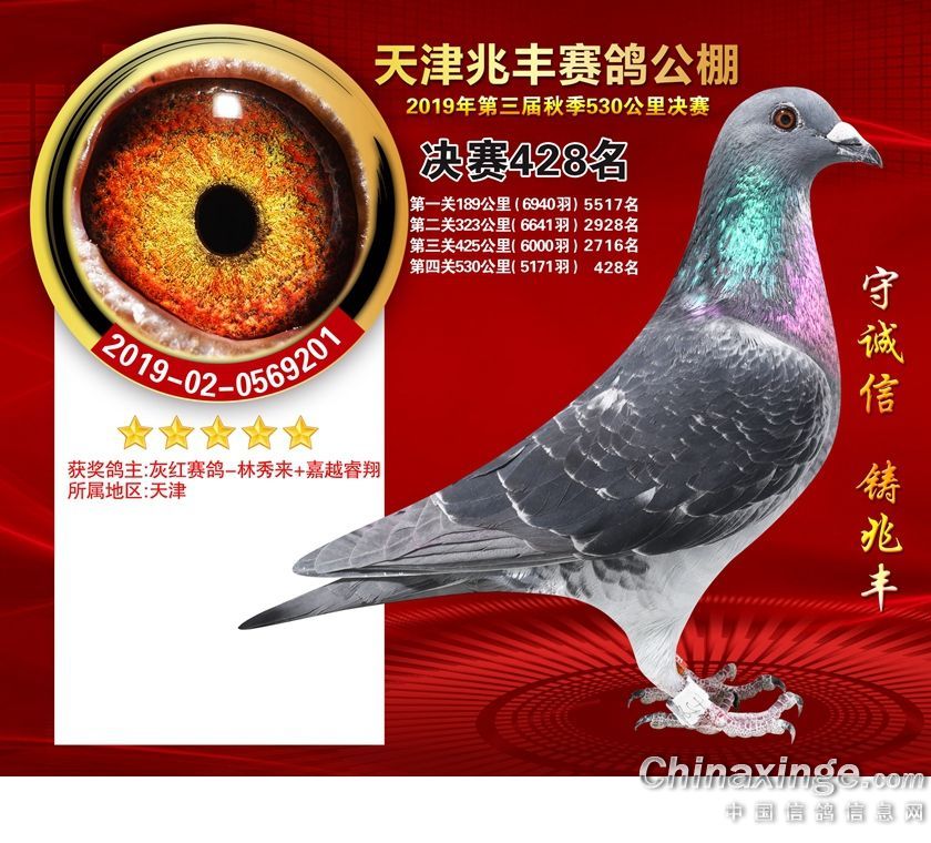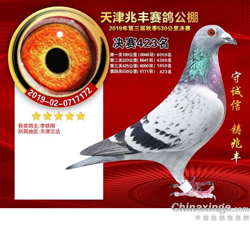 天津兆丰赛鸽公棚2019年获奖鸽421-480名