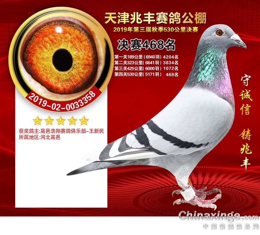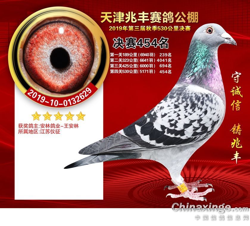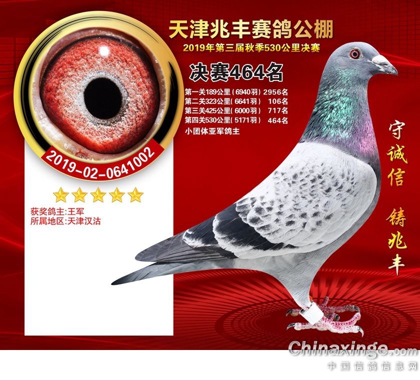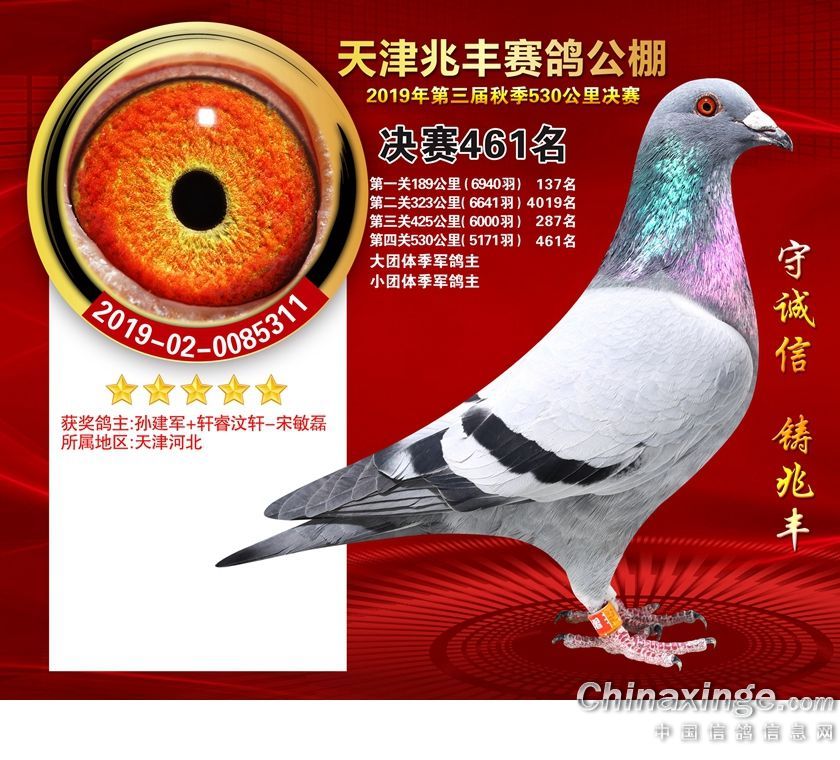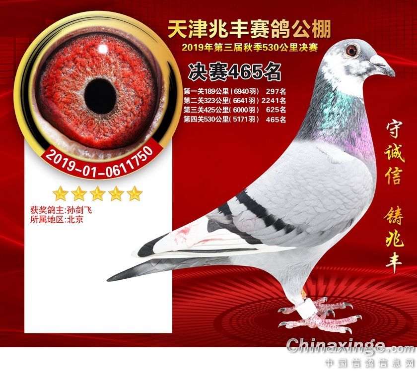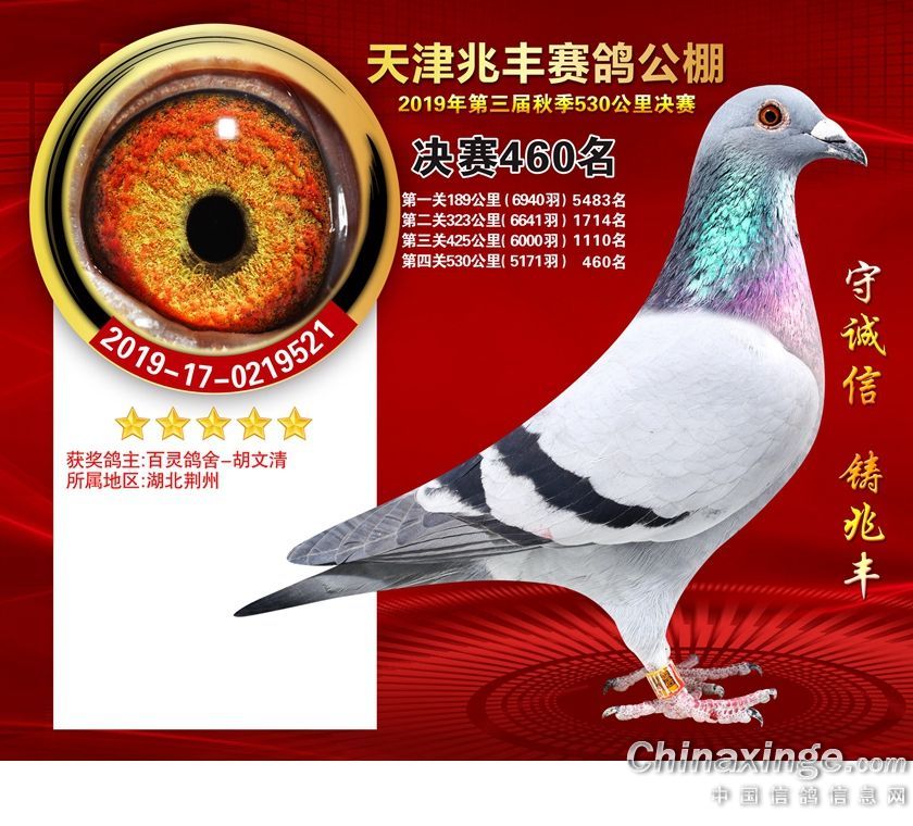 作品说明: 天津兆丰赛鸽公棚2019年获奖鸽421-480名