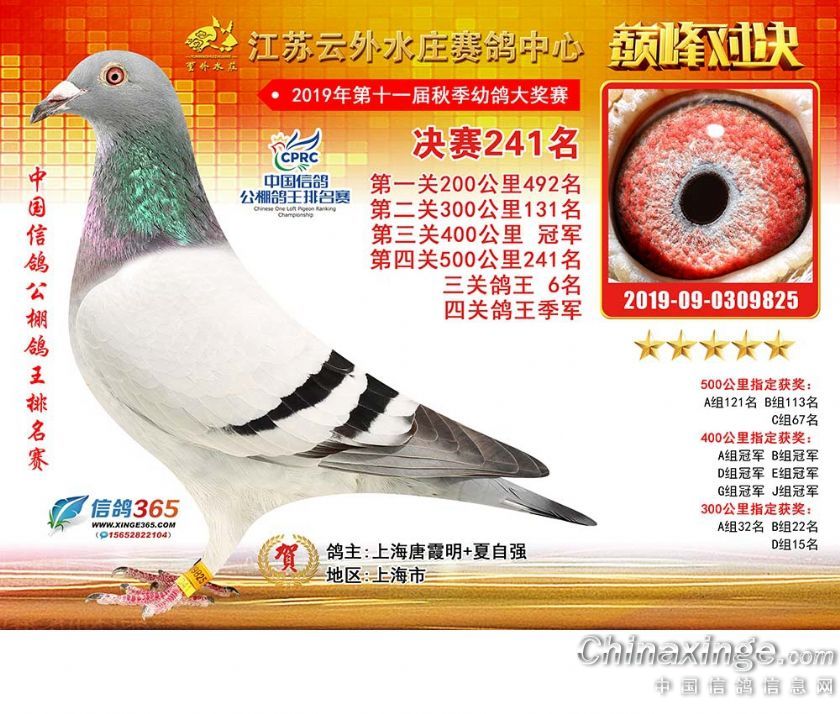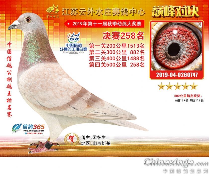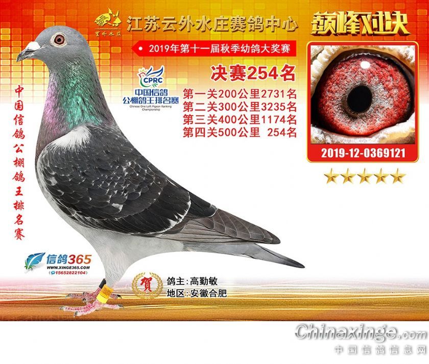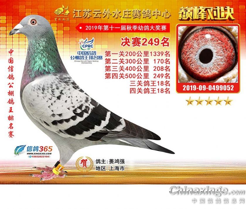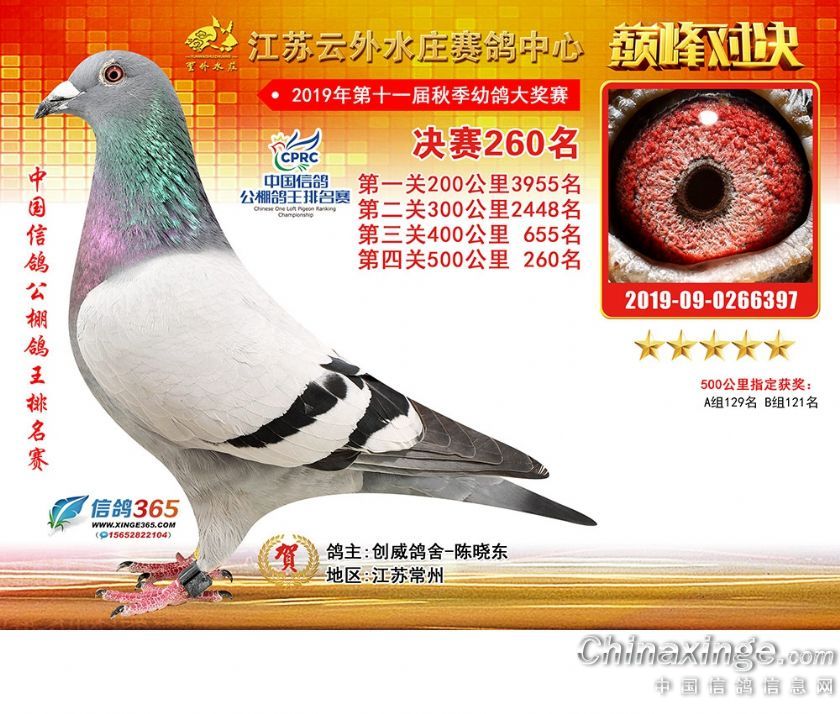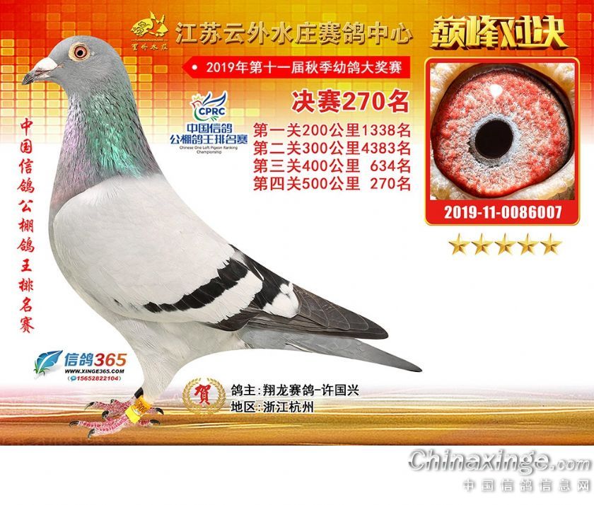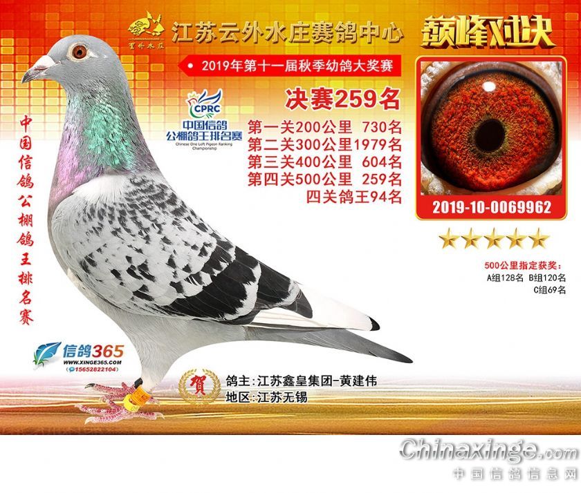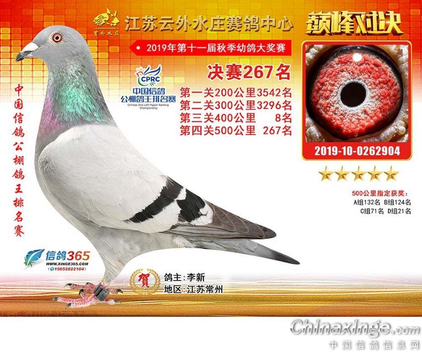 作品说明: 江苏云外水庄赛鸽中心2019年获奖鸽241-270名