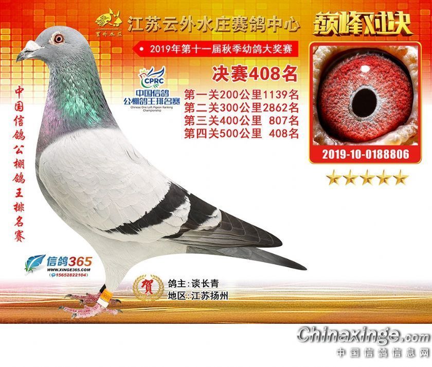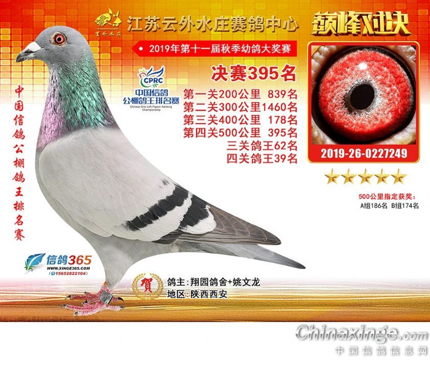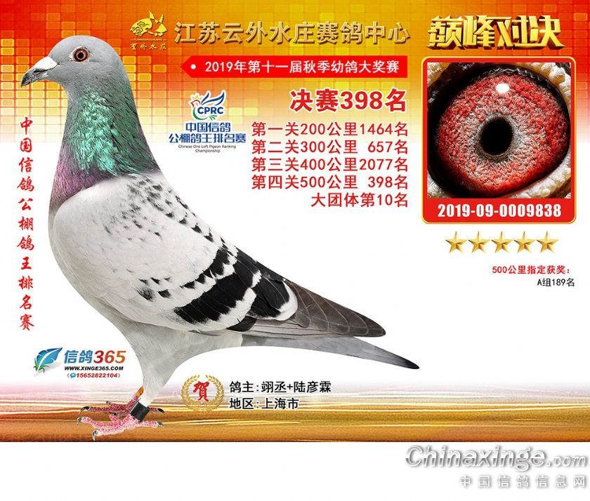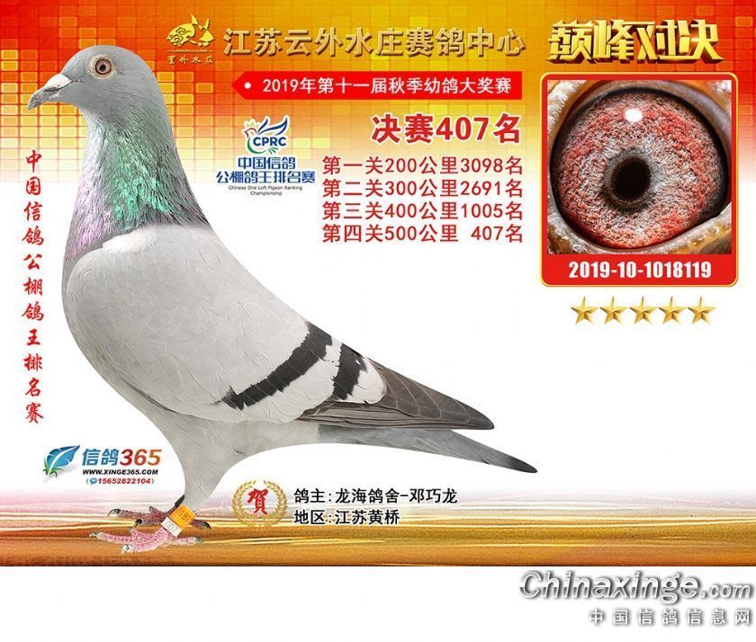 作品说明: 江苏云外水庄赛鸽中心2019年获奖鸽391-420名