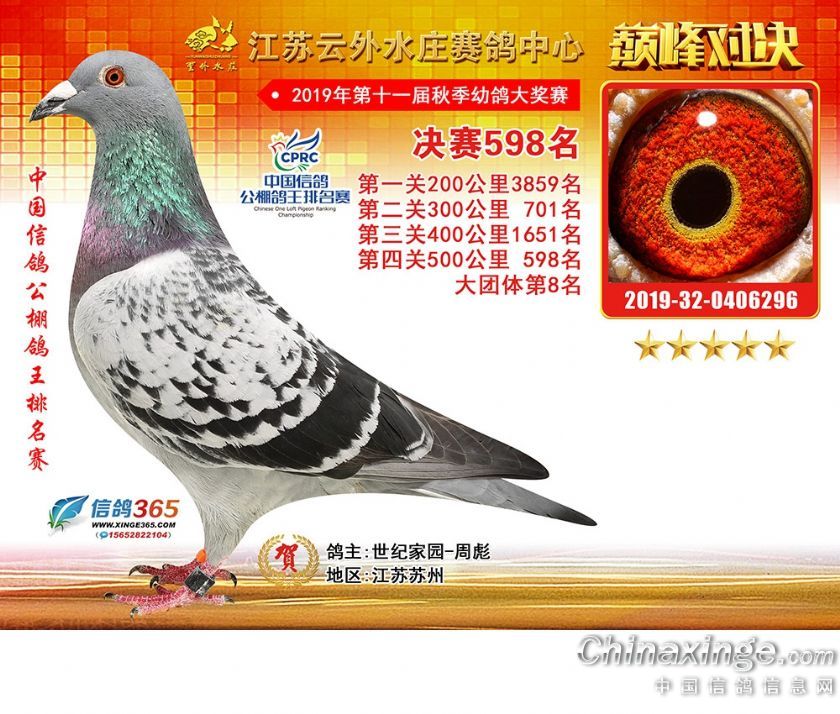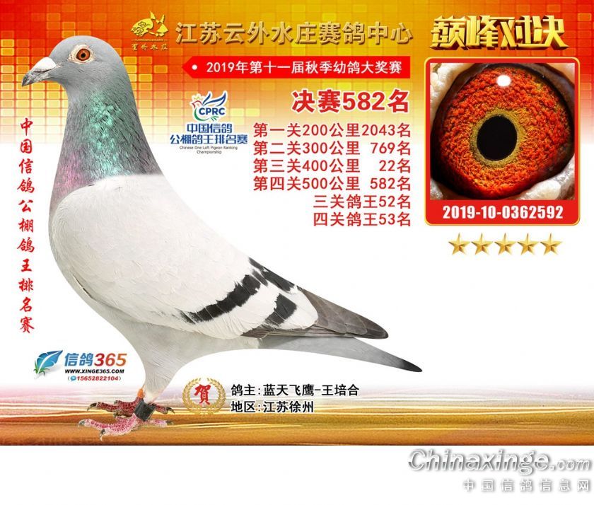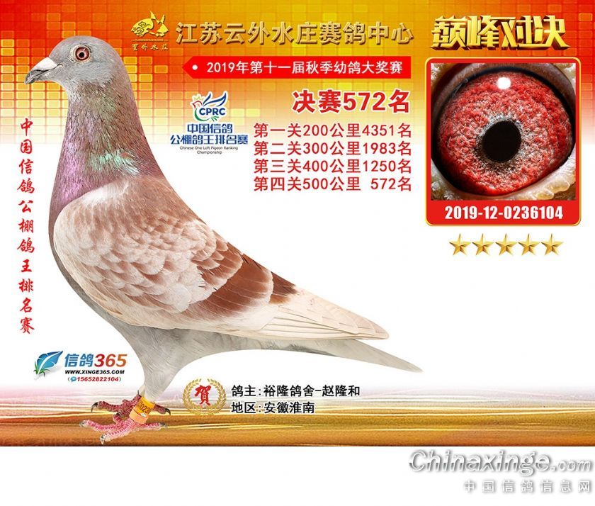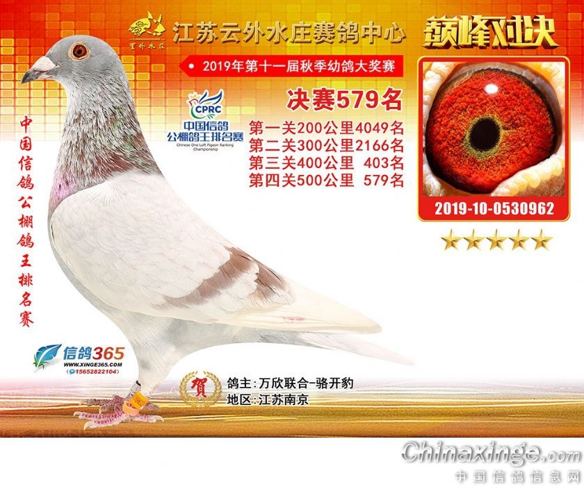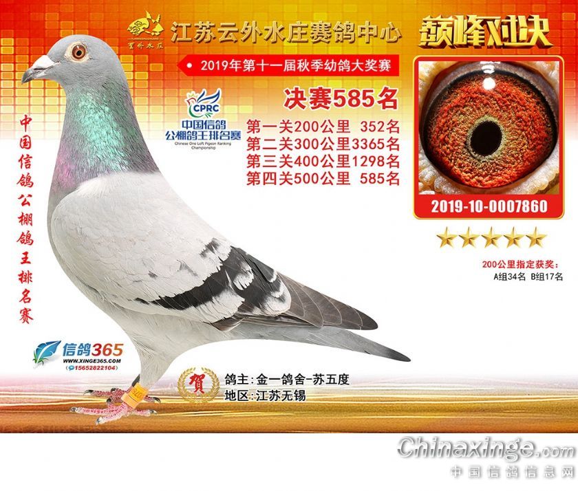作品说明: 江苏云外水庄赛鸽中心2019年获奖鸽571-600名
