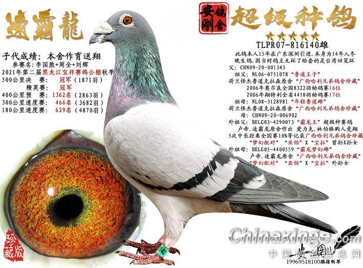 血统:速霸龙 作出子代:2021-07-0255995获得 由本舍作育送翔. 参赛名:李国胜+周全+刘辉 2021年第二届黑龙江宝祥赛鸽公棚 180公里速度赛 629(4870羽) 300公里速度赛 466(3682羽) 400公里 预 赛 1362(2863羽) 500公里 决 赛 冠军(1871羽) 精英赛 冠军