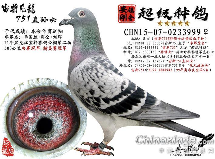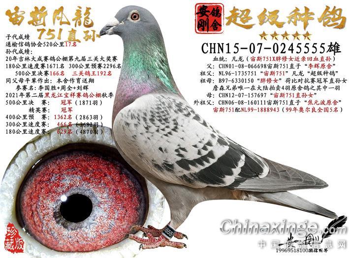血统:宙斯凡龙751直孙 半平辈作出子代:2021-07-0255995获得 由本舍作育送翔. 参赛名:李国胜+周全+刘辉 2021年第二届黑龙江宝祥赛鸽公棚 180公里速度赛 629(4870羽) 300公里速度赛 466(3682羽) 400公里 预 赛 1362(2863羽) 500公里 决 赛 冠军(1871羽) 精英赛 冠军