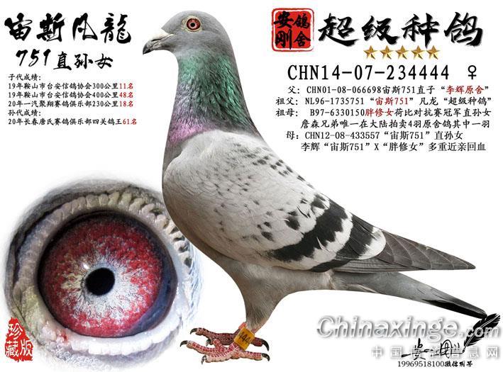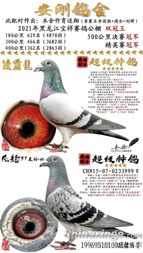 血统:宙斯凡龙751直孙女 半平辈作出子代:2021-07-0255995获得 由本舍作育送翔. 参赛名:李国胜+周全+刘辉 2021年第二届黑龙江宝祥赛鸽公棚 180公里速度赛 629(4870羽) 300公里速度赛 466(3682羽) 400公里 预 赛 1362(2863羽) 500公里 决 赛 冠军(1871羽) 精英赛 冠军
