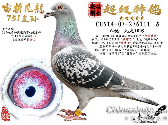 血统:宙斯凡龙751直孙女 全平辈作出子代:2021-07-0255995获得 由本舍作育送翔. 参赛名:李国胜+周全+刘辉 2021年第二届黑龙江宝祥赛鸽公棚 180公里速度赛 629(4870羽) 300公里速度赛 466(3682羽) 400公里 预 赛 1362(2863羽) 500公里 决 赛 冠军(1871羽) 精英赛 冠军