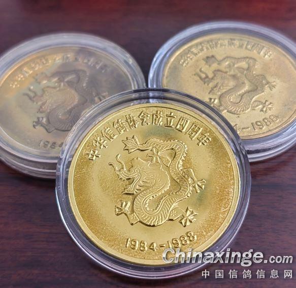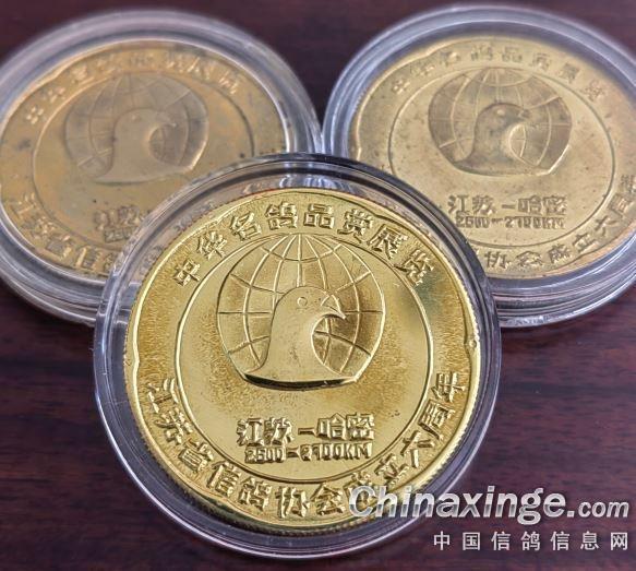 作品说明: 中华信鸽协会成立四周年 江苏省信鸽协会成立六周年 江苏-哈密首届2500-2700km超远程赛 三合一纪念章