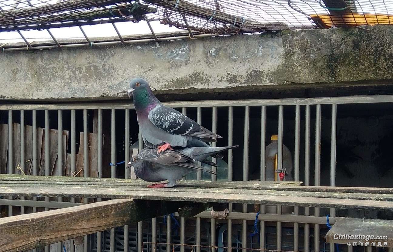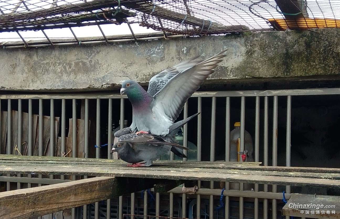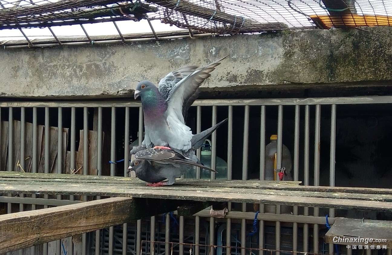 作品说明: 为提高棚内鸽子的质量,引进了一对成绩鸽的种蛋,3个月的小雌鸽与棚内的单雄配对了并开始踩背了。