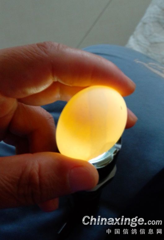 这枚鸽蛋有大小正常、外壳光光滑,里面有一水印不知是什么原因