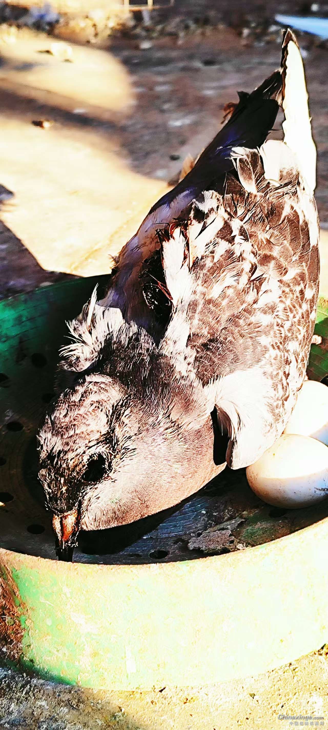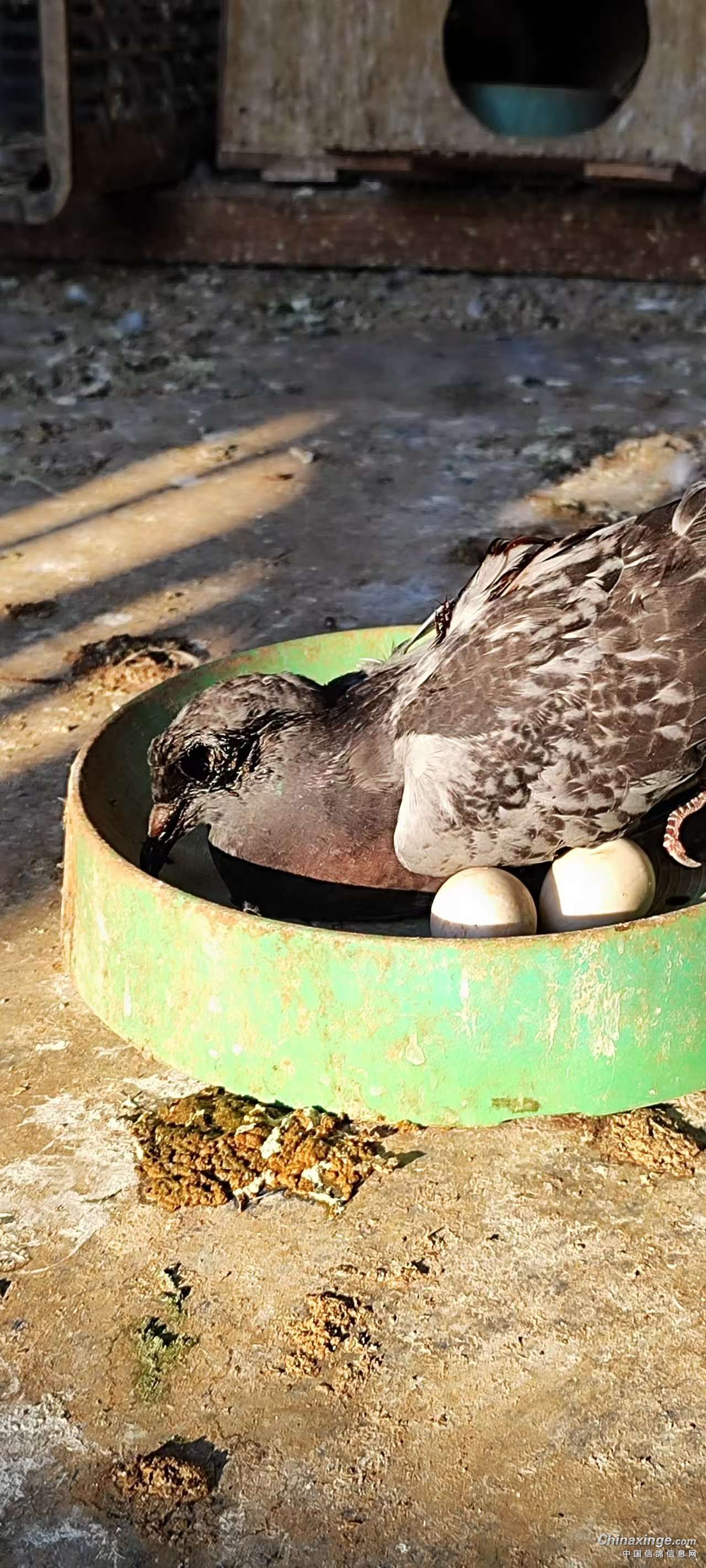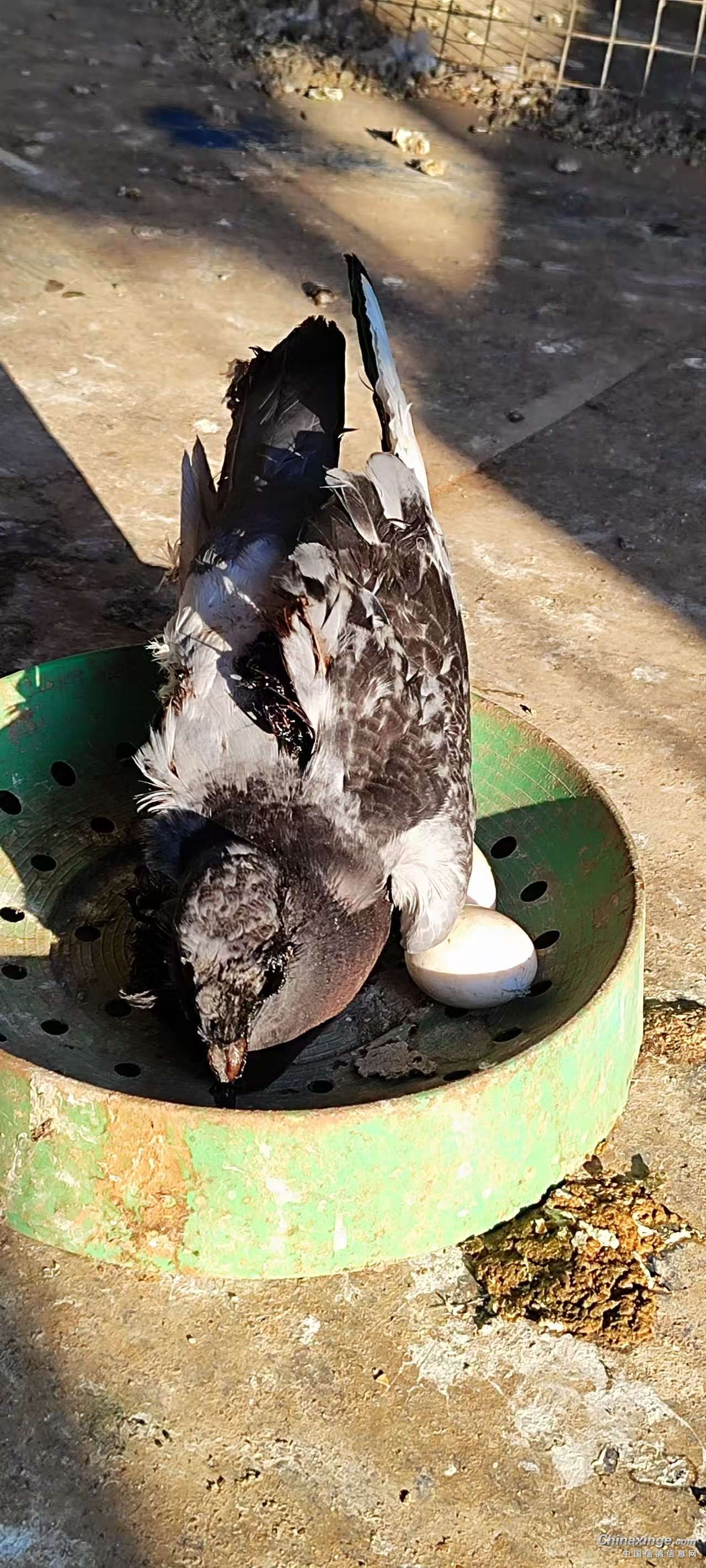 作品说明: 2025年6月15日、晴,气温38度。社区正在开展灭鼠活动並在室外投下很灭鼠的谷物,翌日上午八点钟,一只从晒笼中逃出独自在外觅野食的雌鸽,这只正在孵蛋的保姆鸽不幸遇难,慘死在鸽窝孵蛋盆内,经检查确珍:食道内有很多未消化的谷物,这对鸽蛋是科尔第四代冠军配科尔第六代第八名产下的蛋,此刻急坏了我那伤透了的心。当我处理完已故的雌鸽后万万没想到,另一只雌鸽已主动蹬窝孵蛋,我仿佛在明白一个道理:“满舅舅是外婆的崽”,原来它是“妃子”,是地地道道的"封建社会一夫两妻的组合家庭〝,拿现在的说法它是一夫两妻的保姆雄鸽也风流。再让我们一起来看保姆风流才子:保姆雄鸽不到两岁(500公里第十二名),它的父鸽十岁时就曾经出现过一夫两妻的情况,由此可见,它年幼的儿子不足两岁就开始学会了“劈腿”,真是青出于蓝而胜于蓝,保姆幼年雄鸽一夫两妻也风流。目前,该雏鸽已成功啄破束缚获得新生。