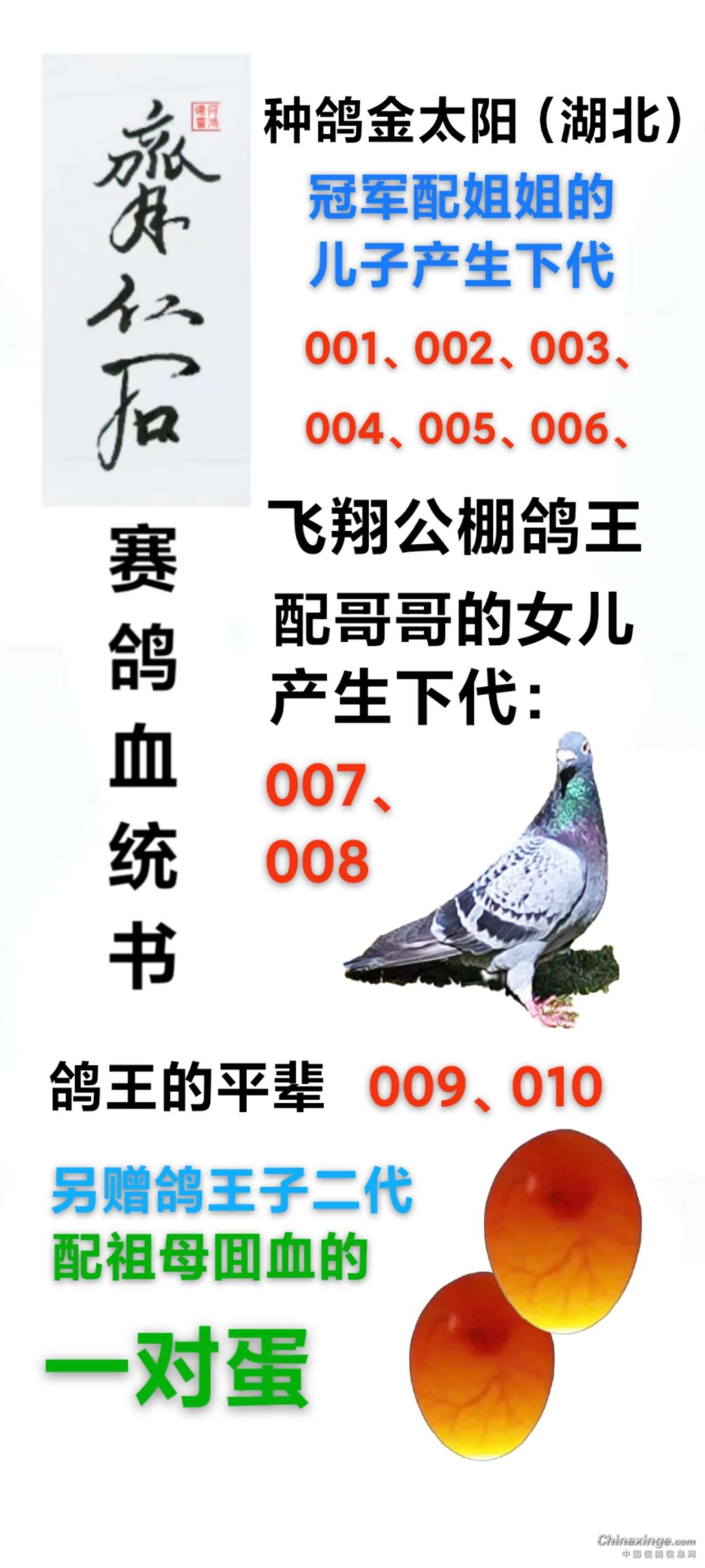 作品说明: 今年春节的时候湖南、湘潭市会长对鸽友齐仁石说:“只要你入会、我就帮你出十羽秋大赛幼鸽”。此话当真,翌日,他交完会费后高兴的带上大赛环拜访了会长。筆者两月后再次来到齐仁石鸽舍看到了十羽幼鸽雄纠气昂昂地在屋顶上走来走去,齐仁石兴奋的向我介绍了十羽幼鸽的血统以及父母鸽的赛绩。随后递上他记录好的血统书,打开一看,我的各乖乖!那都是会长上等的王牌军、鸽王的上代、平辈、下代(血统书及配对表)在图中。 让我们一起来分享高手的配对悟性吧!“妹妹之女配姐姐之子”这种模式成功率的真实案例分析:会长的飞翔公棚鸽王其父母鸽就是妹妹的女配姐姐之子的成功案例。让我们一起对此成功的表现来进一步分析:从子代(平辈)赛鸽的比赛成绩、遗传稳定性、健康状况等方面总结都具有优势、成绩高位的共性。 返之,又从失败案例与原因探讨分析,並采用该模式,但子代表现不佳(半数不归)的案例依然还是严重,虽然会员都给予很高的评价和赞赏,但会长从不满足于現状,持之以恒探索、研究、多次跌倒又爬起来认真判断原因(如有害基因纯合、环境影响等)也是我们常说的隐性基因靠前的表现。 然而再认真分析影响该模式成功率的关键因素发现,亲代赛鸽的遗传素质:父母代、祖辈赛鸽的基因质量和成功的概率没有超过二分之一,只是超越同行,没有超越自我,概率对后代的影响深远。 今后还应该从育种环境、条件、饲养管理、训练方式等环境因素的作用去深挖潜力。 还要从基因筛选与人工干预以及优生学的育种过程中准确对有害基因的识别与排除、淘态等方法。 都说只要是会长的朋友,新会员就是起点高、就会举自摸。采访到此,我预祝我们的新会员齐仁石今年秋赛摘金多银,我们相约在湘潭大酒店举杯庆典:湘潭市鸽协总结拍卖大会!