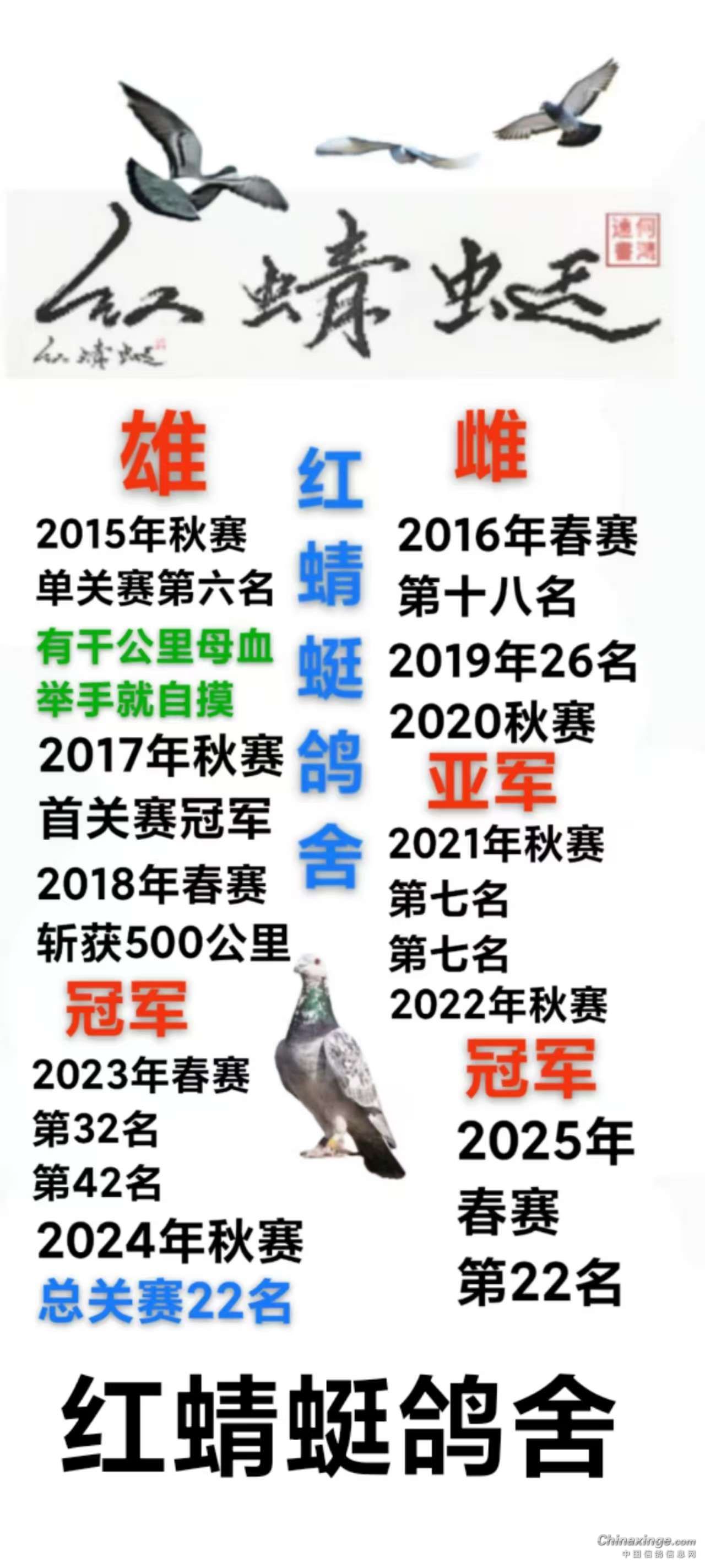 作品说明: 2015年“红蜻蜓鸽舍”自从有了千公里母的下代后改变了主人的养鸽人生,这里没有半句吹牛,让我们一起翻看历史替他而乐吧! 2015年前“红蜻蜓”是一个很不显眼的鸽舍,主要是长期没有晋级而不被大家认知。那年,自从“红蜻蜓”鸽主看到会长、秋赛斩获1至6名的好成绩並甘拜下风,虚心向会长賜教。2015年起拥有会长的千公里母的下代后从胜利走向胜利(成绩见图片)。之所以会员中有“养鸽拥有千公里母可改变人生”这种说法,更多是源于会长的成绩鸽在湖南赛鸽界的传奇地位。千公里母是我们的会长亲手培育的名系赛鸽,以速度快、归巢能力强等特点闻名长沙、株州、湘潭、湘乡等,在各类赛鸽赛事的比赛中成绩斐然,因此成为协会许多鸽友追捧的对象。 对于湖南人热爱赛鸽运动的人来说,哪怕是拥有会长的归巢鸽也会视同拥有优质的詹森鸽一样可意味着在比赛中更有竞争力,有机会获得好成绩,进而在赛鸽圈获得认可、提升声望与荣誉,只要通过比赛、奖金、鸽种交易等带来养鸽的声望会更高,从这个角度来看会对养鸽者的生活在鸽界里产生深远的意义、著名的影响。 不过,“改变人生”更多还是取决于个人对赛鸽的投入、饲养管理水平、比赛策略以及自身心态与养鸽的悟性等多种因素,不能单纯归因于拥有某个品系的鸽子哦。总之,在长沙、湘潭、株州的信鸽协会圈子里都这么认为:会长的鸽王声望来自公棚飞翔、爱拼才会赢。“千公里母远嫁“红蜻蜓鸽舍”取得好成绩不断就是公认的现实。