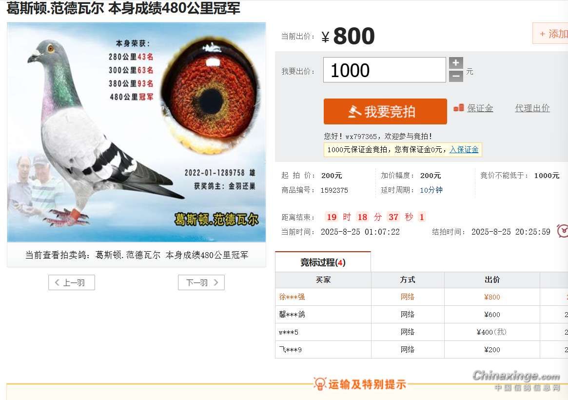 作品说明: 昨天、今天浏览中信网,关注到一组到8月25号(今天)晚20点结束的拍卖。最后一张图是原鸽主提供的冠军鸽图片,大家对比下拍卖的那只鸽子。都来留言评论一下。这是同一只鸽子吗?