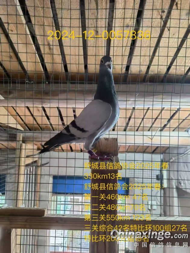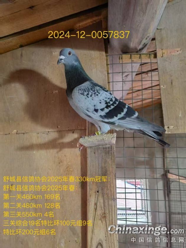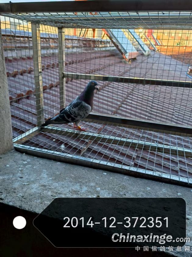 作品说明: 莫等闲,白了少年头,空悲切。用这句话来形容我的一羽2014-12-372351老雄鸽是 最恰当不过了,这羽老雄鸽是2014年孙抱林老师支援我的一枚鸽蛋所出,我套的是舒 城县信鸽协会2015年春季特比环,这羽老雄鸽干瘦,亲和性极差,春赛特比环有效入 赏,次年也飞过合肥精英赛鸽俱乐部300-500-700公里三关综合鸽王51名等成绩。 2019年初次作育作出了舒城县信鸽协会特比环12名。同年师弟陈友林寄养了几羽高 位成绩鸽于我棚,老雄和它的儿子12名成了我淘汰的对象,我鸽笼条件有限,进入几 羽种鸽必将淘汰几羽,种鸽始终维持在30羽左右。淘汰前我拿出手机查了一下老雄的 成绩,不看不知道,一看吓一跳,老雄从300-700公里参加了几十次比赛,每次都能有 效入赏,偶有高位,于是我果断淘汰了它的儿子留下了老雄,老雄留在鸽棚担任起了 保姆角色。 转眼间到了2022年春天,因工作需要我外出抗击新冠疫情,老丈人竟然给保姆鸽老 雄子代套了一羽环号为2022-12-0540345的雄鸽,长相及其像老雄,这羽雄鸽飞了当年 的三关综合鸽王三十多名,不喜欢这种脾气,比赛结束我就送给了鸽友蔡哥回家养着 玩。这羽鸽子听蔡哥讲在家打架掉配对笼后面的缝隙中暑死了。比赛结束我突然意识 到老雄已经作育了两羽高位奖鸽,是不是能用一用,2023年我再次作育了两羽秋季特 比,分别挂环0021060和0021070,首关0021070在我棚就第一个归巢,第三关丢失。 0021060脱关了,但是这次没有把0021060淘汰,在给它一次参赛的机会,为了证明老 雄的育种能力。出乎意料的是0021060在2024年春瑶海区信鸽协会450公里首关就飞了 个亚军,飞完之后0021060感染了腺病毒死了。遗憾的是老雄竟然没有留下一羽子代。 至此我突然醒悟,老雄已经十岁了,它的子代这么能飞,24年春天重点培育老雄,作 出两窝,第一窝2024年秋天四关特比环0067312、0067313,第二窝2025年春天三关特 比环0057836、0057837,让我喜出望外的是0067312和0067313当年就飞出了舒城县信 鸽协会秋季四关综合特比环43名和113名。其中0067312第一关450公里13名和第四关 550公里21名在我棚均是第一个归巢的。更加恐怖的是这四羽子代2025年春在舒城县信 鸽协会330公里的比赛中分别获得了冠军、10名、13名、14名。接下来的460-480-550 公里的三关综合,0067312获得550公里第三关的冠军,全会三关综合混合赛亚军,而 0057837继330公里获得冠军后,第三关550公里再获4名,三关综合特比环100元组9 名,200元组6名。0057836获得三关综合特比环100元组27名,200元组19名。 至此我看到了老雄的超级育种能力,后悔莫及!不知不觉老雄已经“白了头”。再 回首老雄一身流光,两目星辰,静若处子,动若惊鸿。而它的子代更是丝柔的羽毛映 日生辉,翠颈流光溢彩,蹁跹处恍若瑶池仙禽临世。至此我也悟得了蓝天才是检验赛 鸽唯一金标准的道理,所有的成绩不是靠眼睛看出来的,也不是用手摸出来的,而是 蓝天上飞出来的。 2025年春天,我毫不犹豫的作出了三窝6羽子代,第一窝参加合肥市瑶海区信鸽协会 秋天三关特比,第二窝、第三窝送师弟陈友林参加肥东县信鸽协会2026年春天三关特 比。未来如星辰,璀璨可驭;赛途虽遥远,善飞即至!再次让我们拭目以待11岁黄金 种雄子代的超级发挥吧!