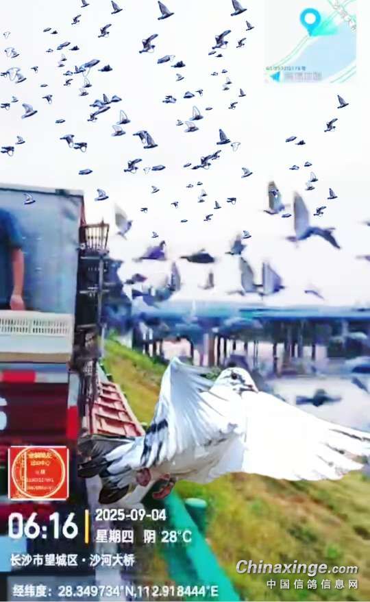 作品说明: 2025年9月4日星期四、晴空万里,最低气温28度。湖南省湘潭市金铺活动中心训放长沙望城、(新港小河边)6:16准时开笼,鸽子集体同一个方向、地方万鸟同飞。此次放飞看得出已是多次训放几十公里了,大家都说:金辅中训鸽、我们的鸽子眯眼睛也能飞回来。在此,我真心的祝愿金辅活动中心越办越好、越穏、越精,你们办事会员放心!