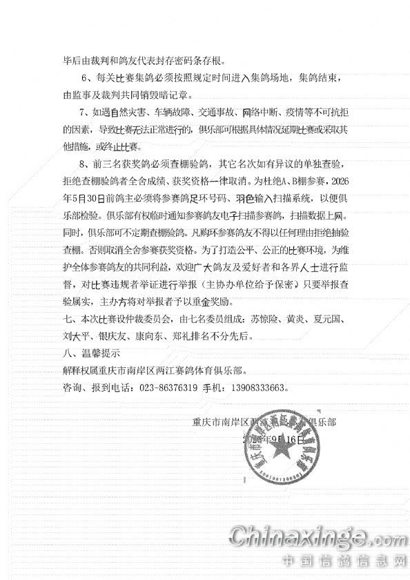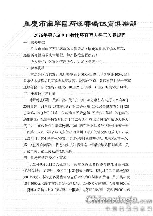 重庆两江赛鸽俱乐部2026年9.11特比环赛事活动